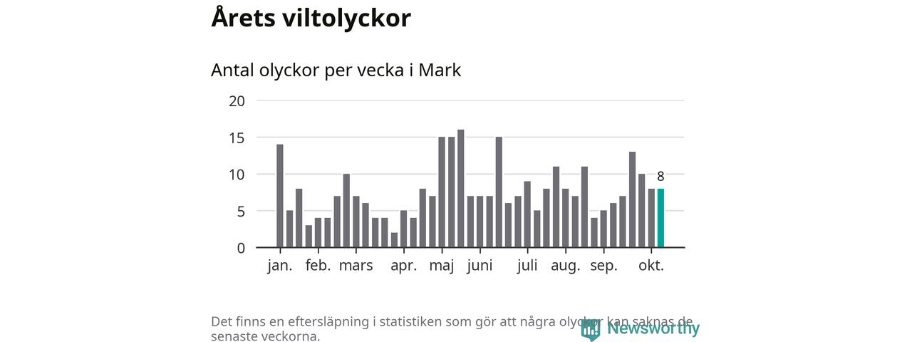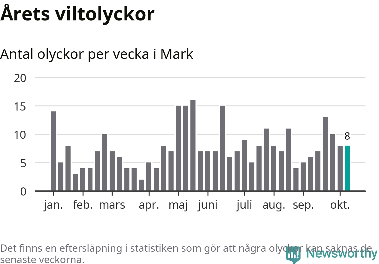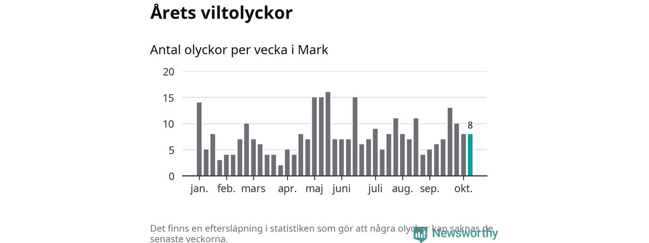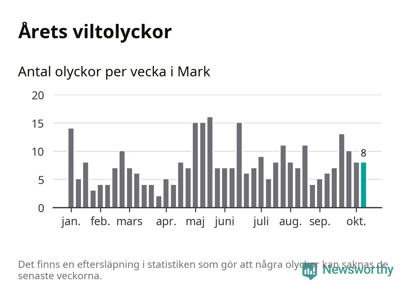 Hittills har åtta viltolyckor rapporterats in i Marks kommun från vecka 42. Se listan här.