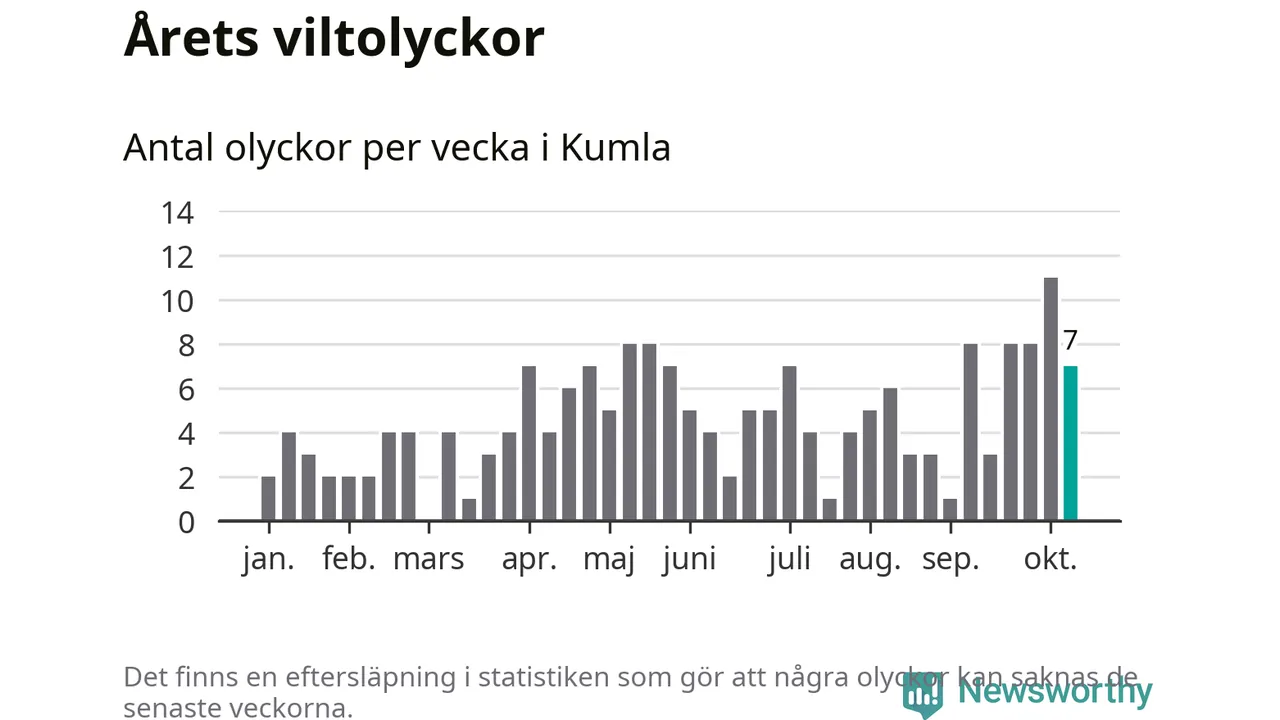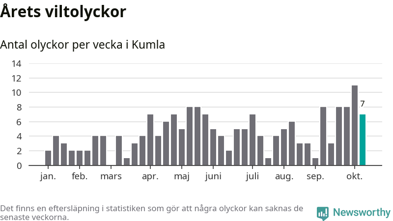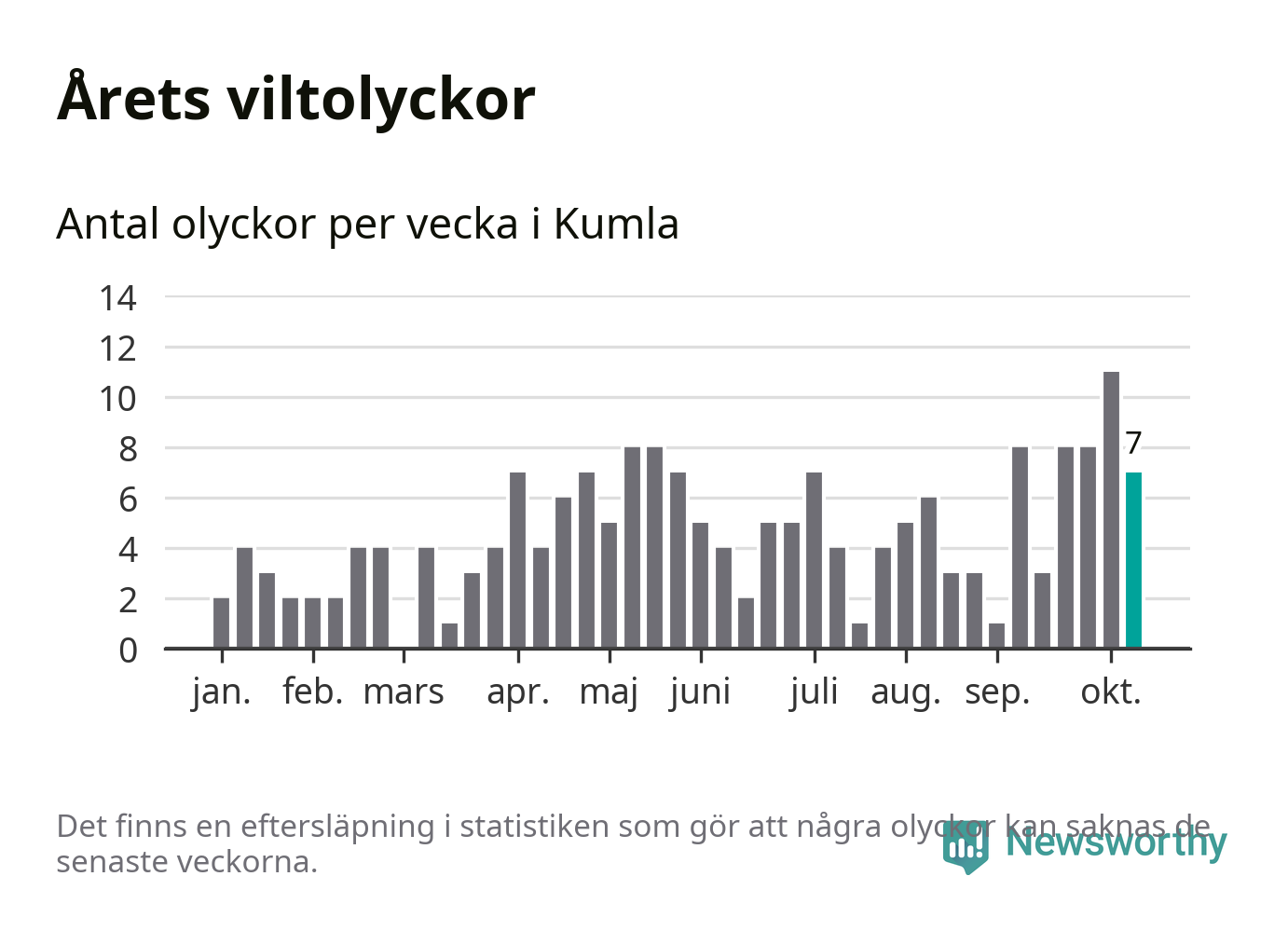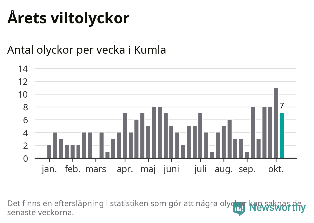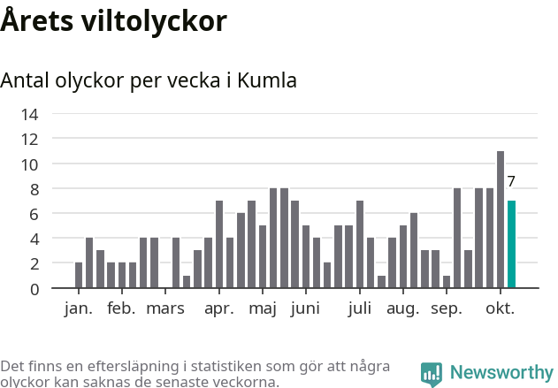 Hittills har sju viltolyckor rapporterats in i Kumla kommun från vecka 42. Se listan här.