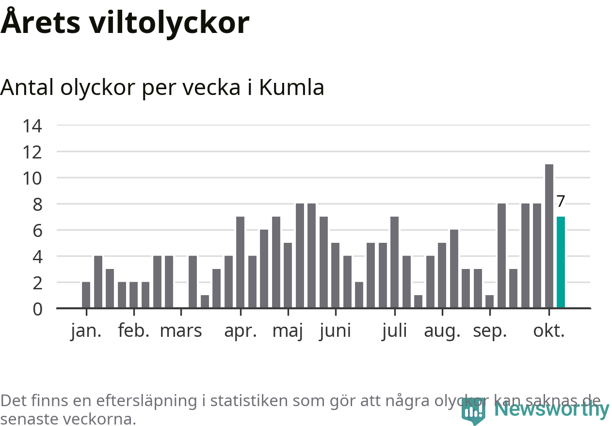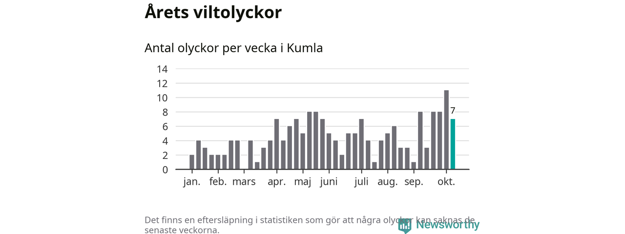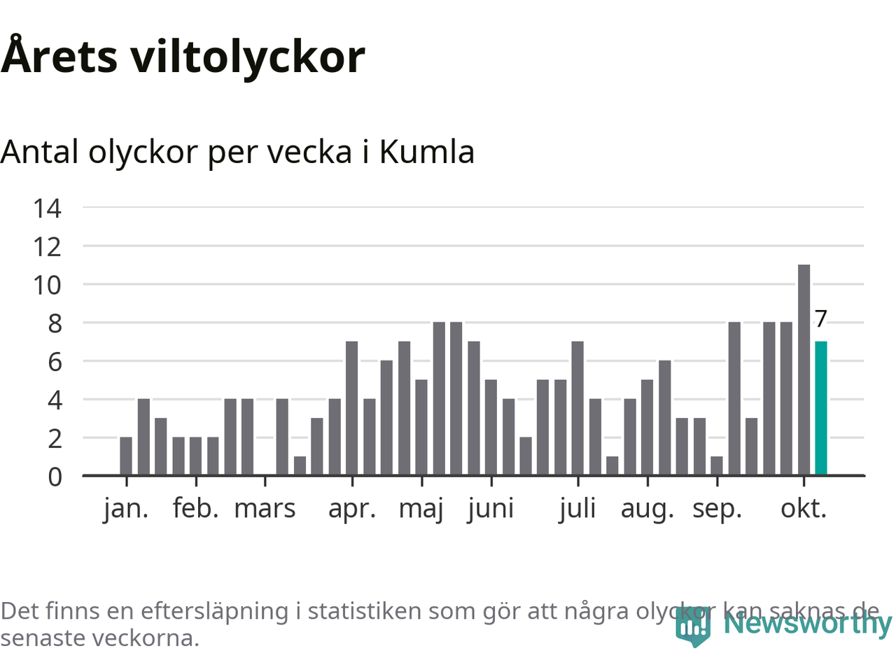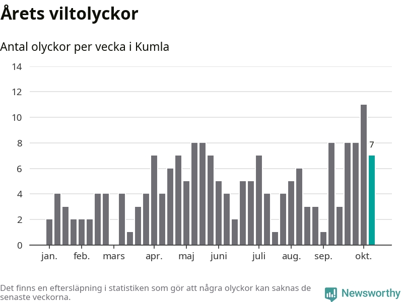 Hittills har sju viltolyckor rapporterats in i Kumla kommun från vecka 42. Se listan här.