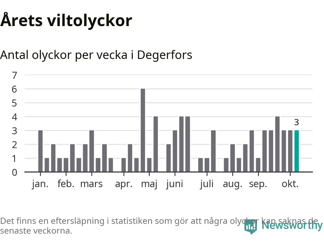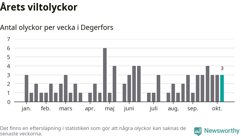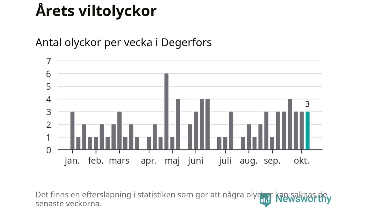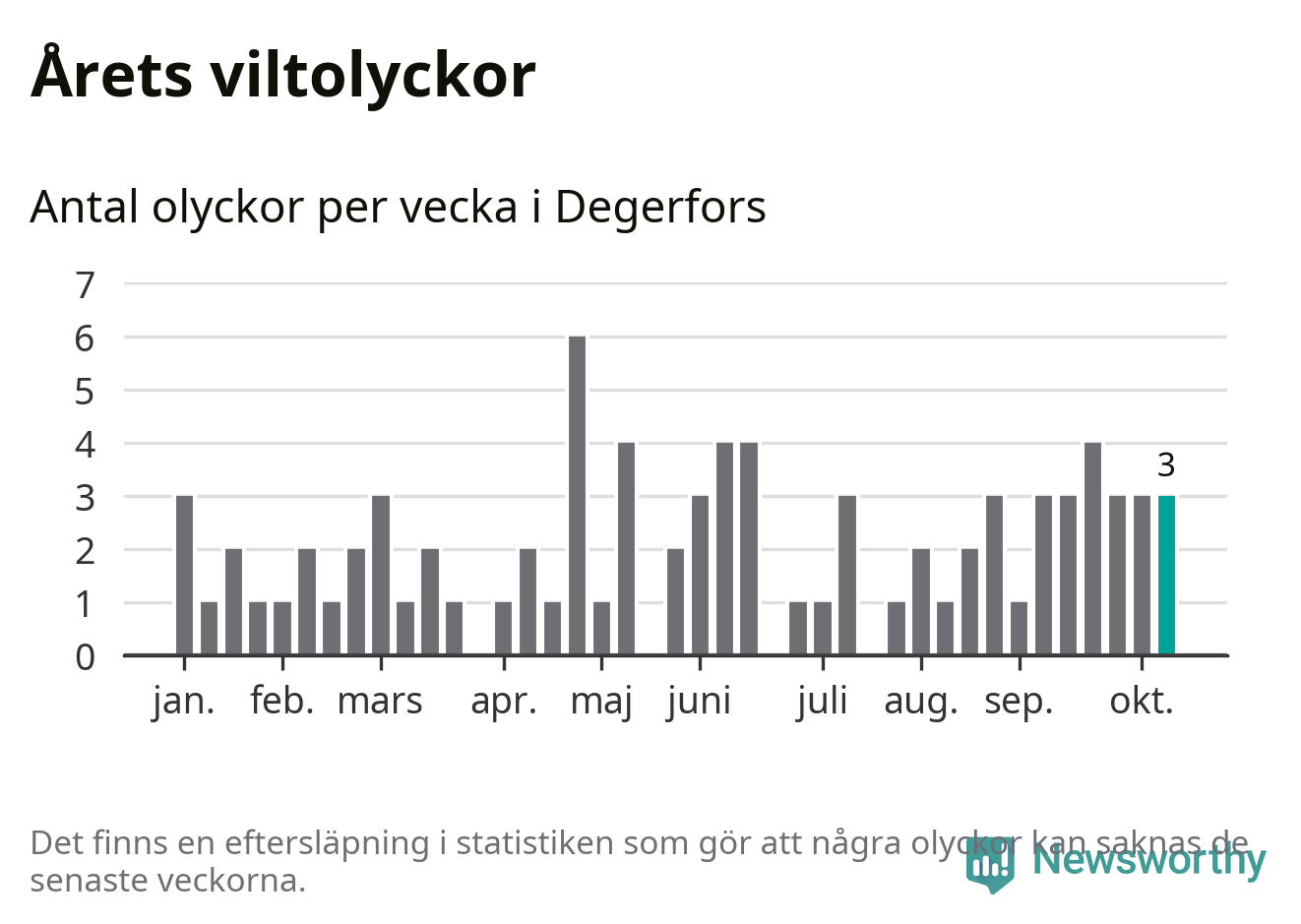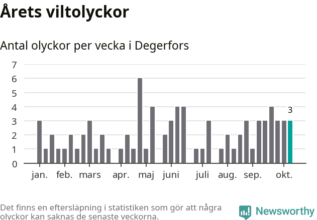 Hittills har tre viltolyckor rapporterats in i Degerfors kommun från vecka 42. Se listan här.
