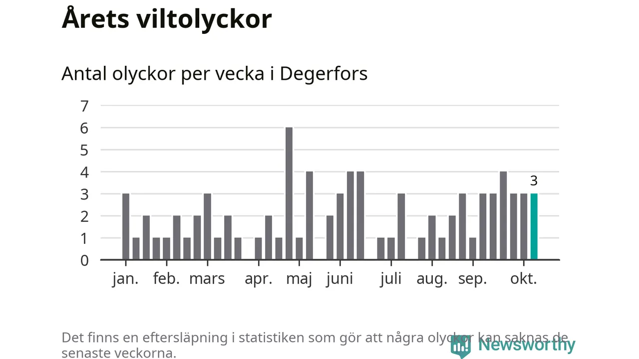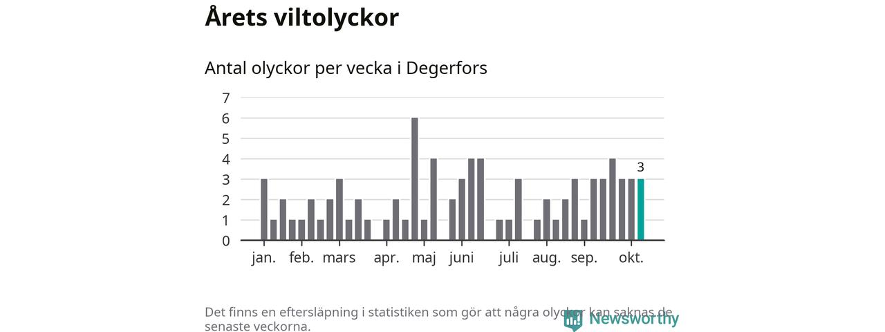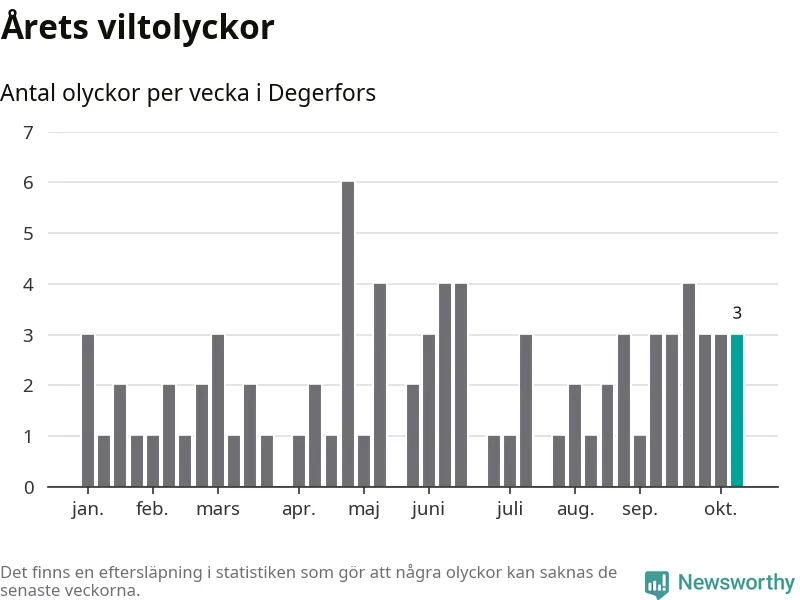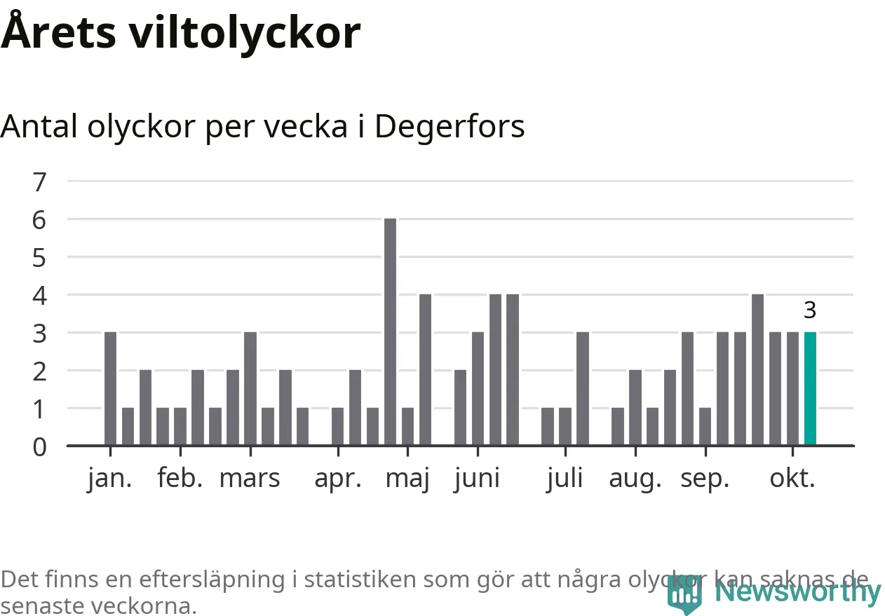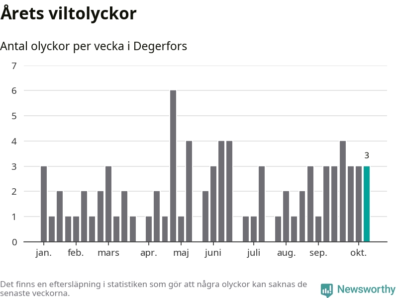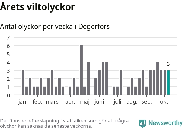 Hittills har tre viltolyckor rapporterats in i Degerfors kommun från vecka 42. Se listan här.