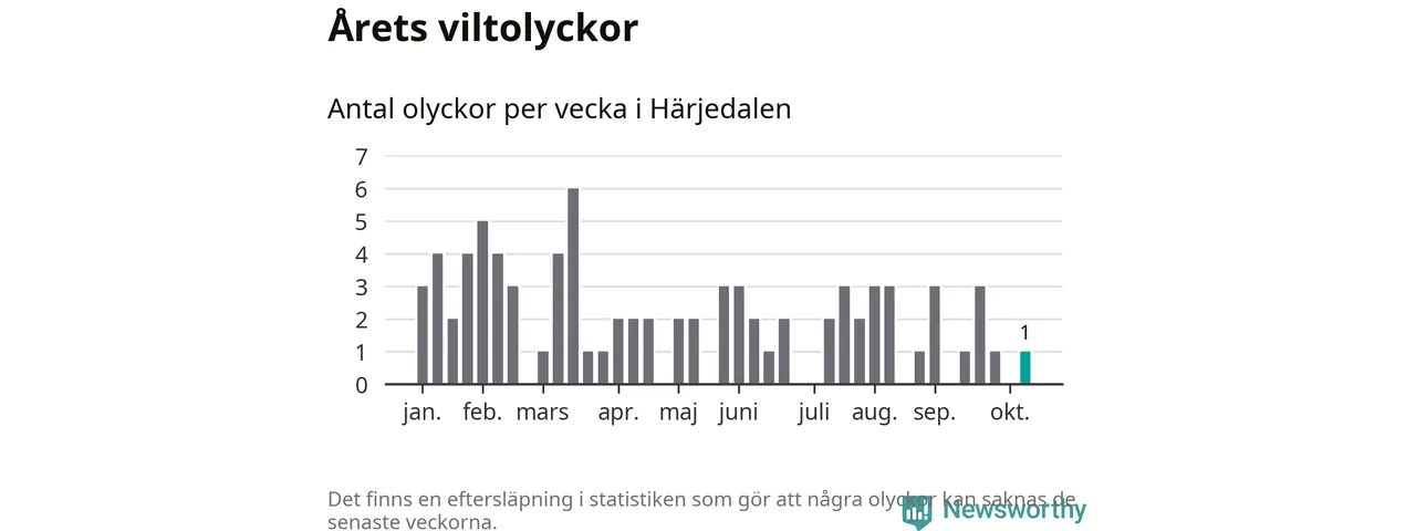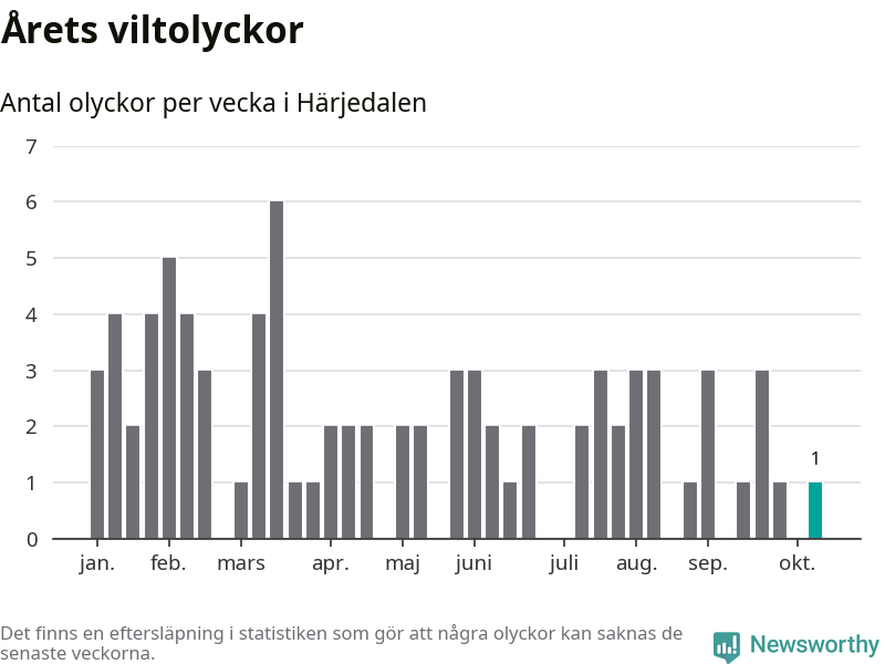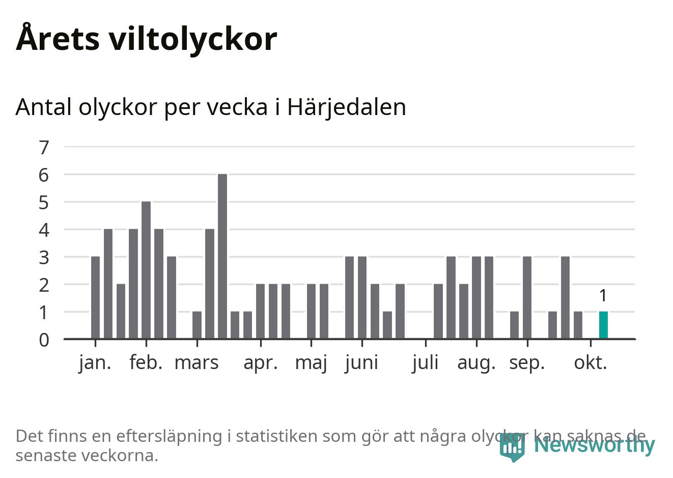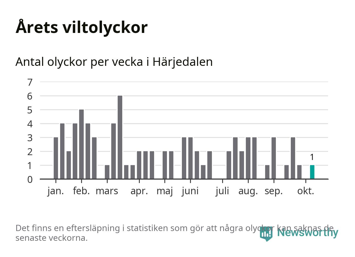 Från förra veckan (vecka 42) har hittills en viltolycka rapporterats in i Härjedalens kommun.