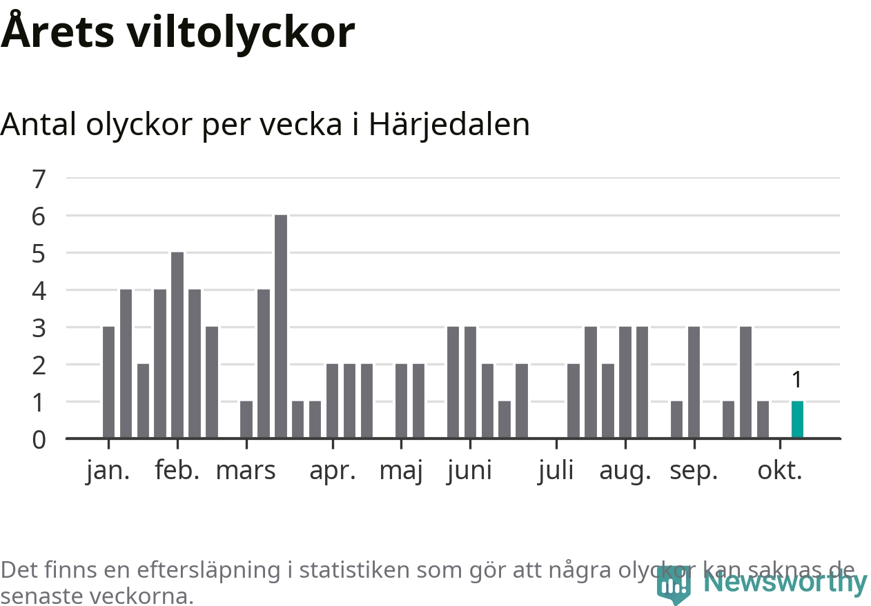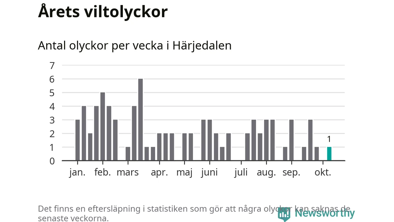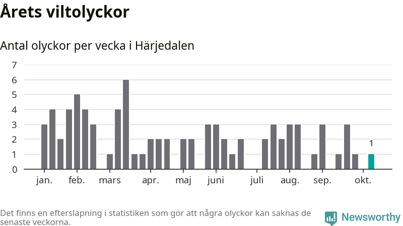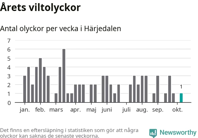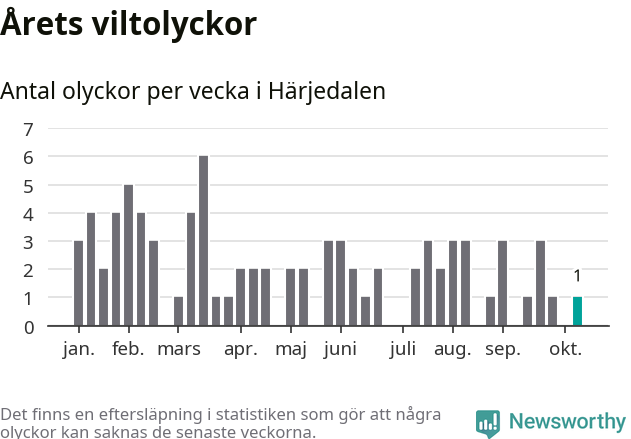 Från förra veckan (vecka 42) har hittills en viltolycka rapporterats in i Härjedalens kommun.