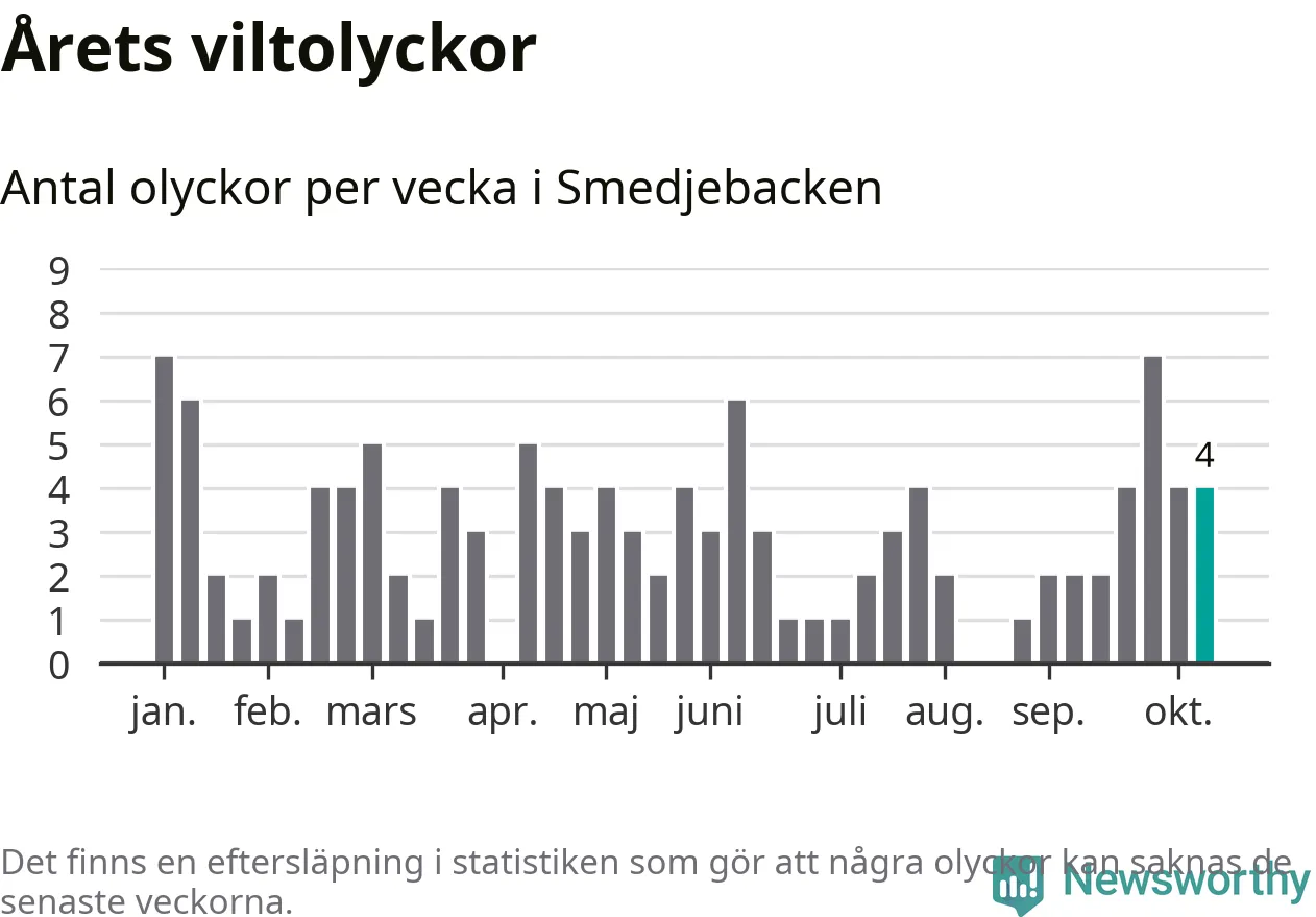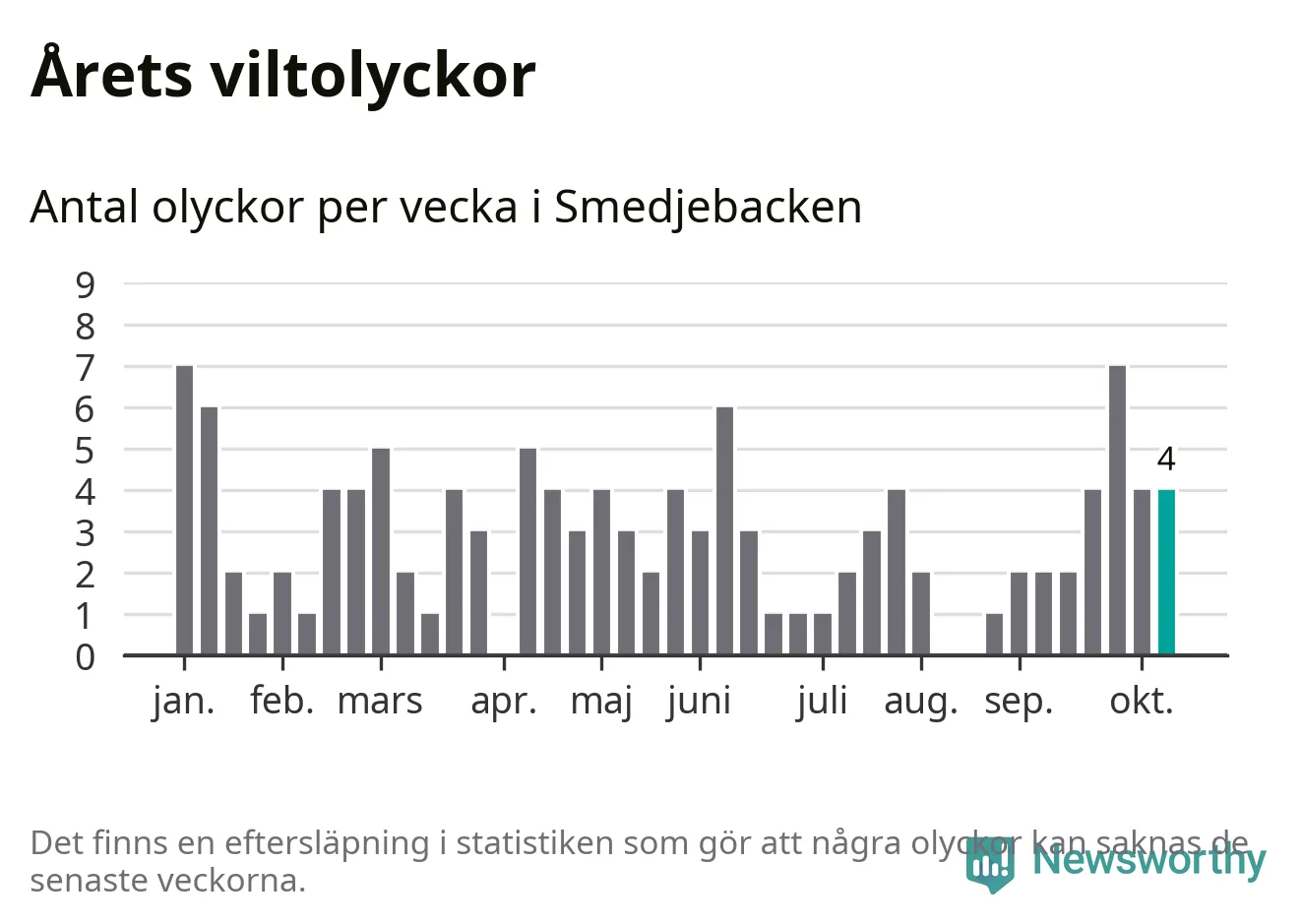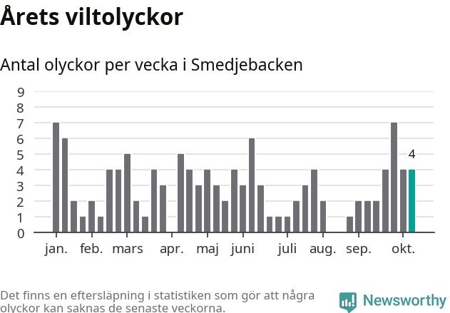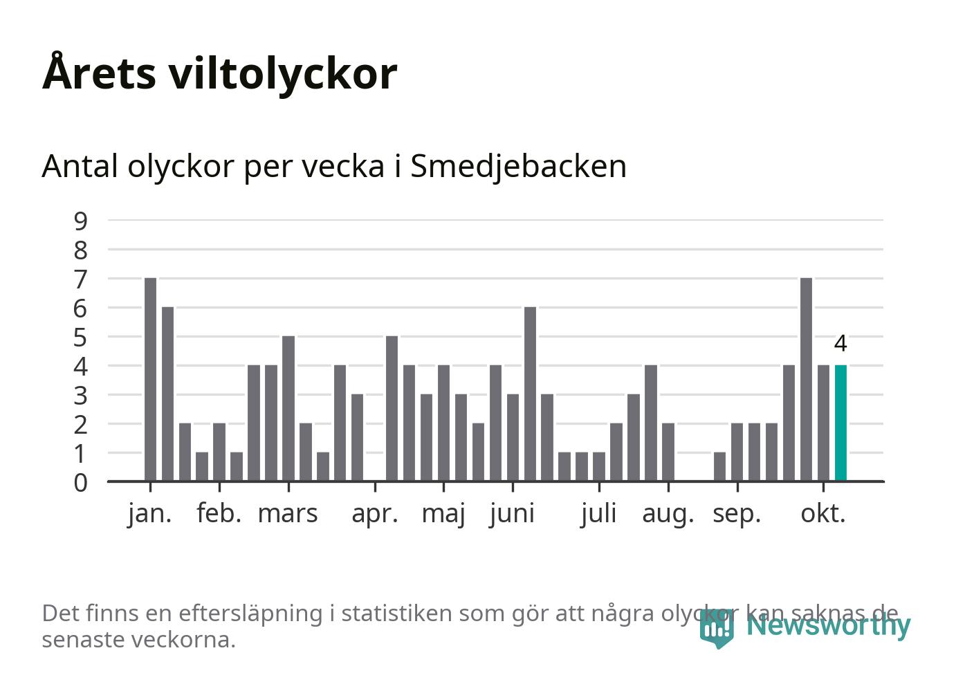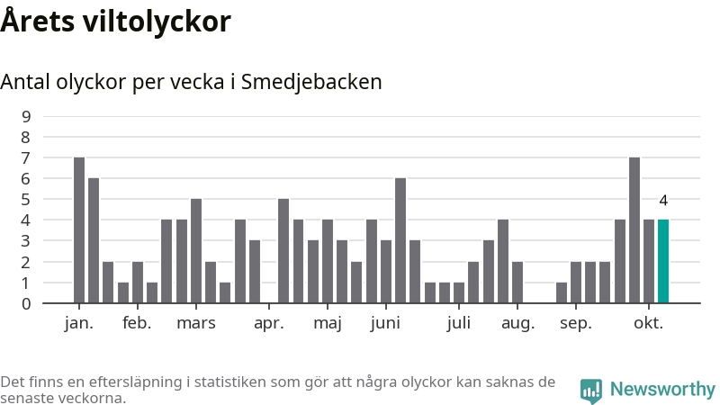 Hittills har fyra viltolyckor rapporterats in i Smedjebackens kommun från vecka 42. Se listan här.