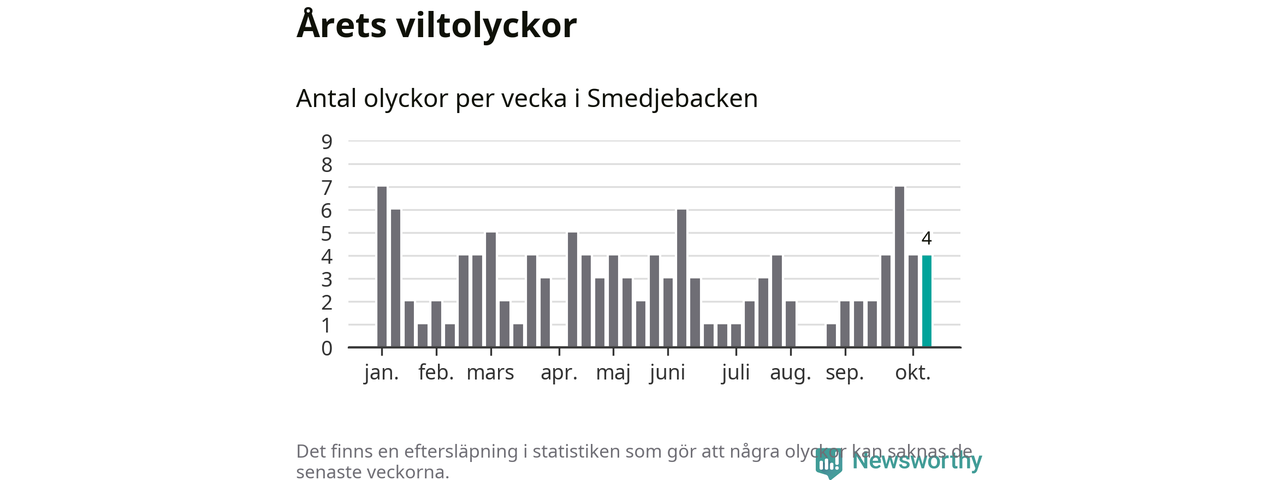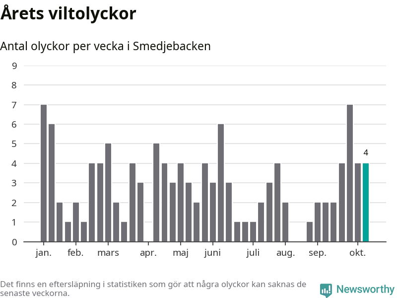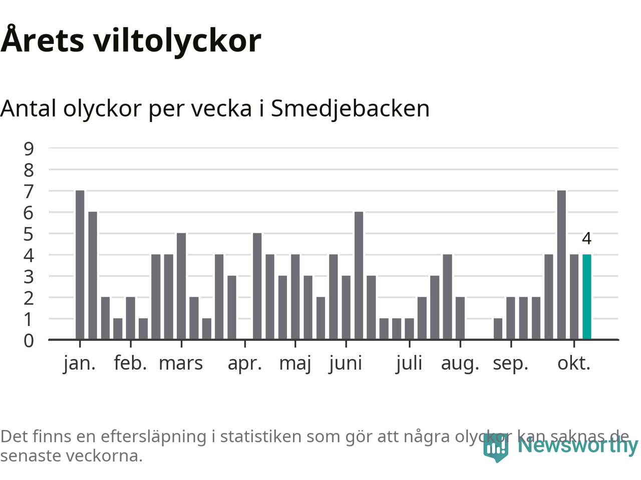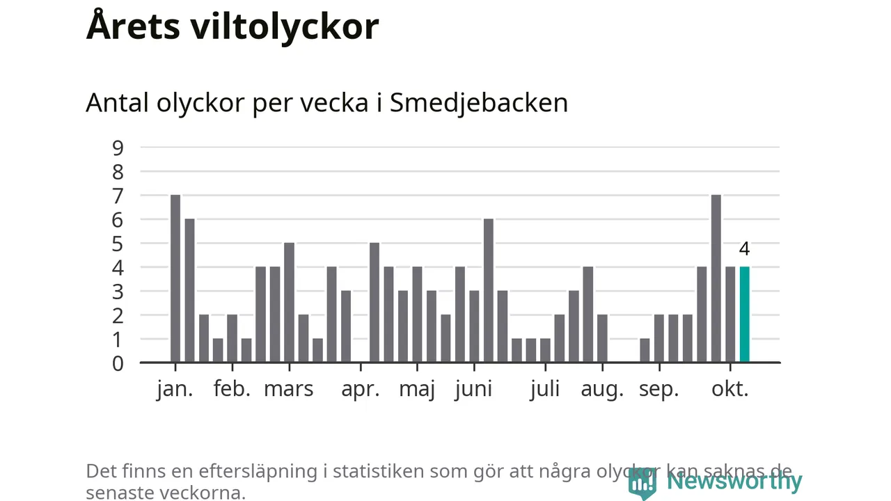 Hittills har fyra viltolyckor rapporterats in i Smedjebackens kommun från vecka 42. Se listan här.