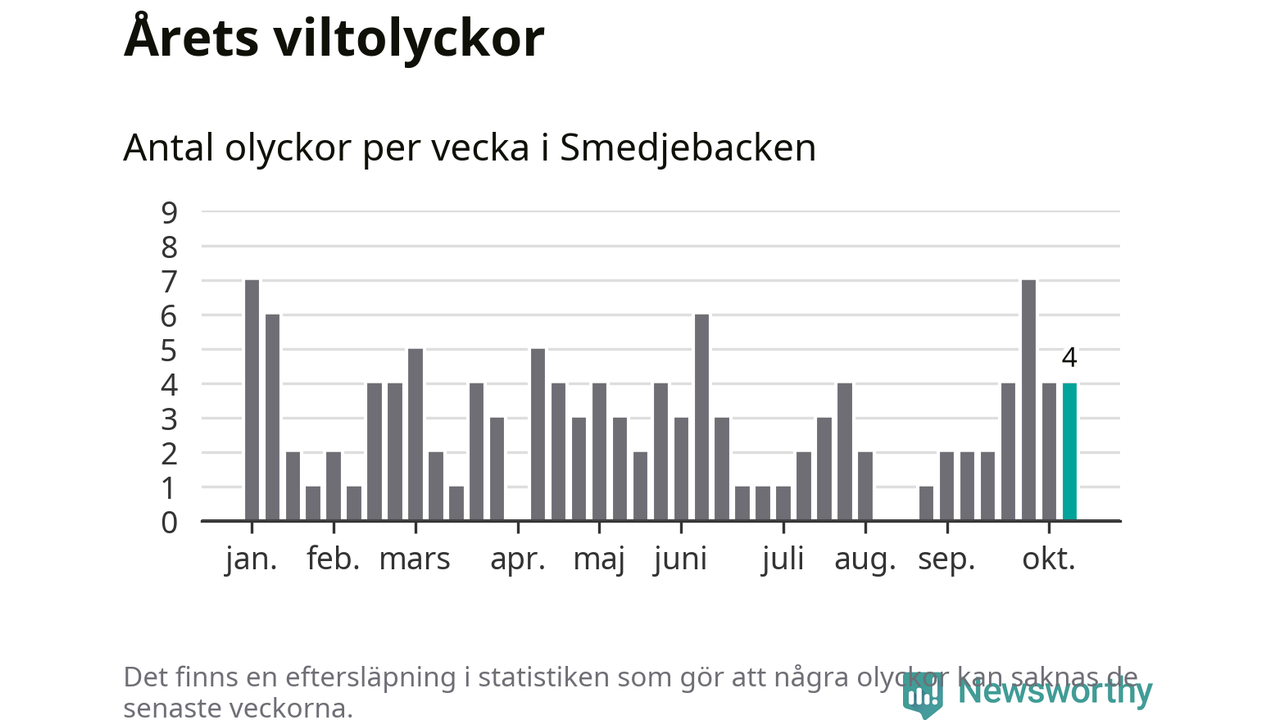 Totalt det här året har det inträffat 123 viltolyckor i kommunen. Det är en normal nivå i förhållande till hur det har sett ut under de senaste tio åren – genomsnittet för motsvarande period är 121.