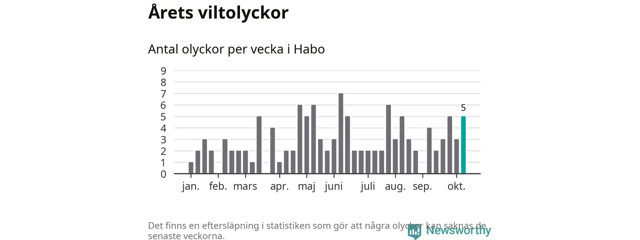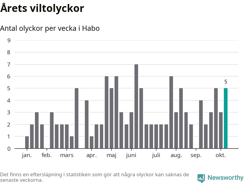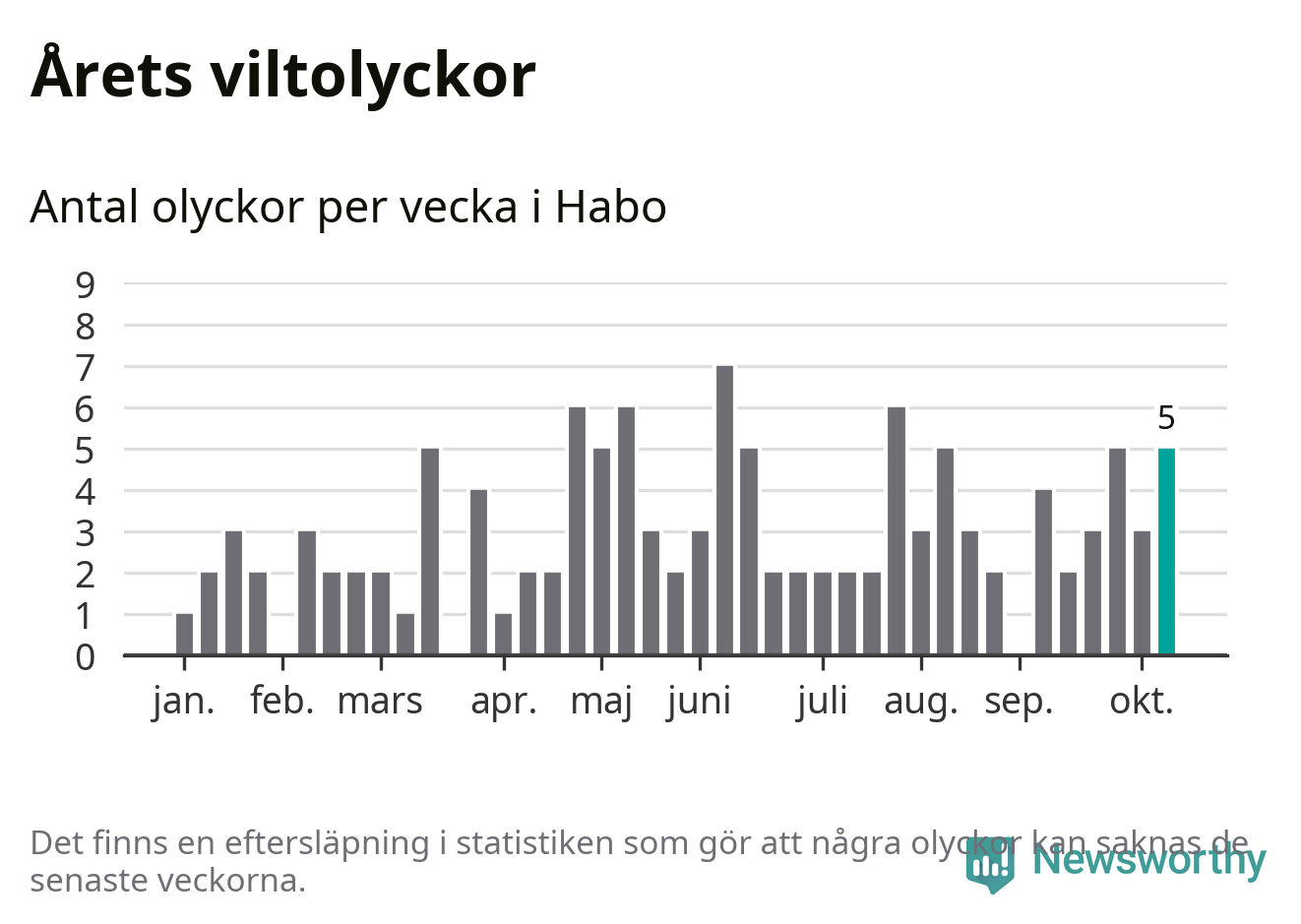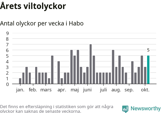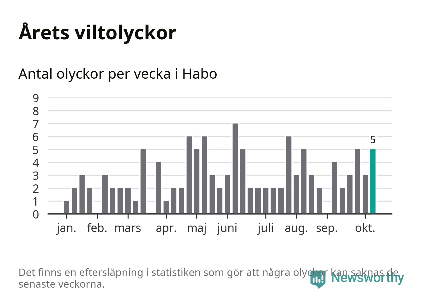 Hittills har fem viltolyckor rapporterats in i Habo kommun från vecka 42. Se listan här.