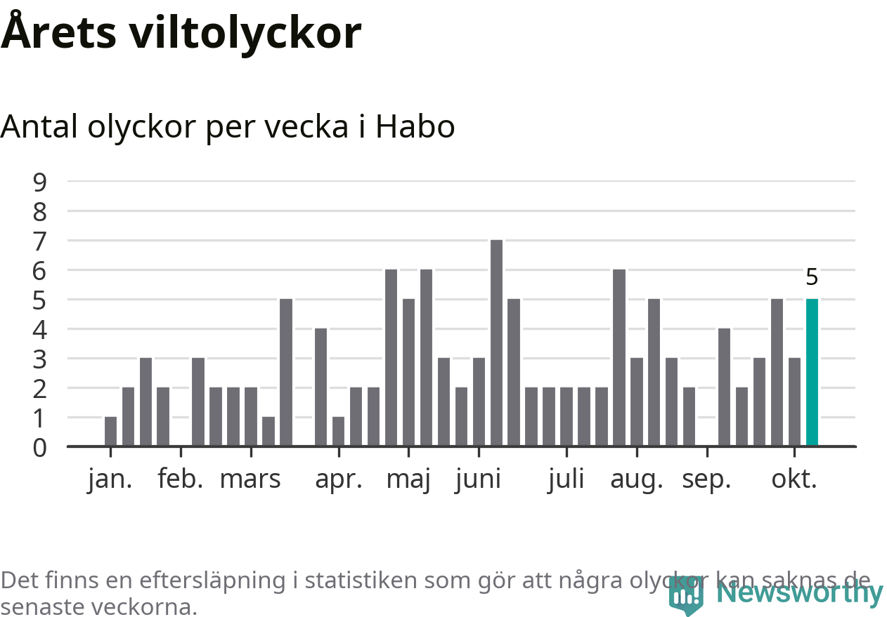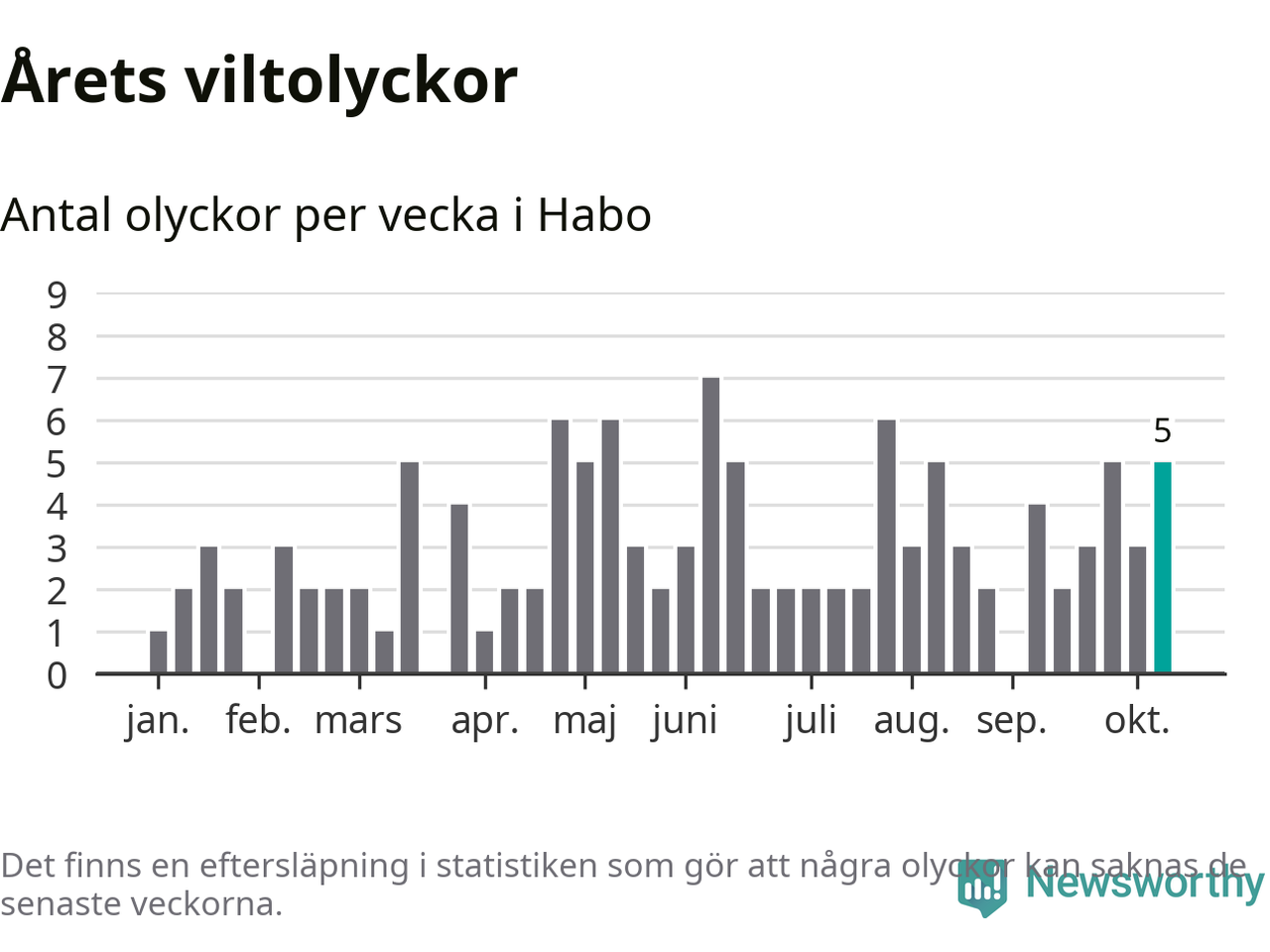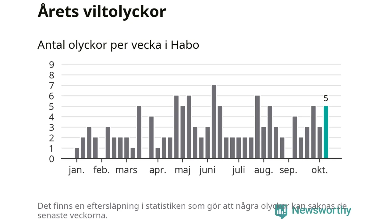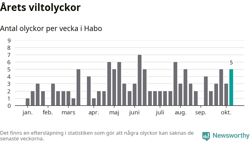 Hittills har fem viltolyckor rapporterats in i Habo kommun från vecka 42. Se listan här.