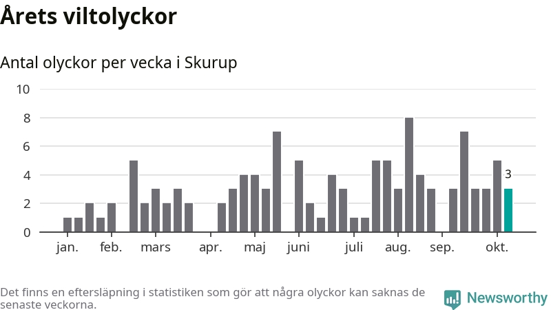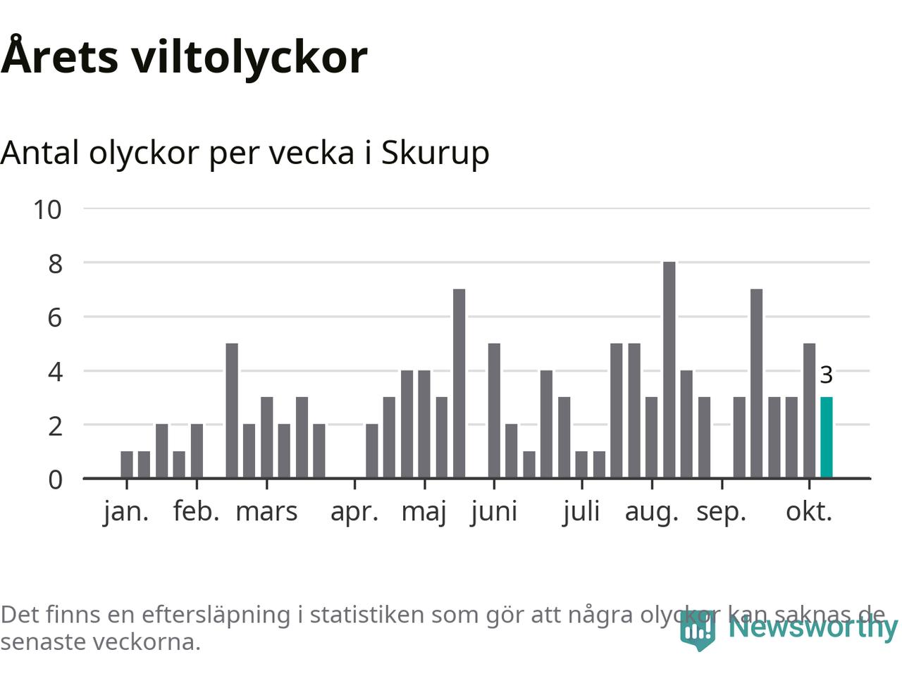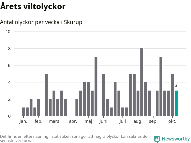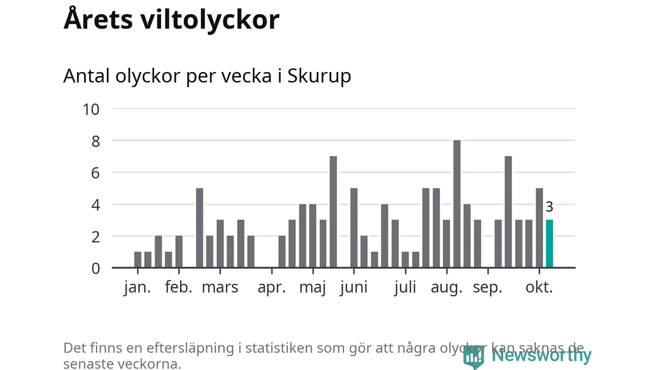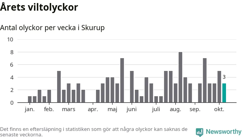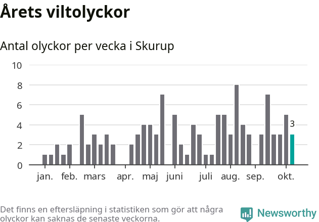 Hittills har tre viltolyckor rapporterats in i Skurups kommun från vecka 42. Se listan här.