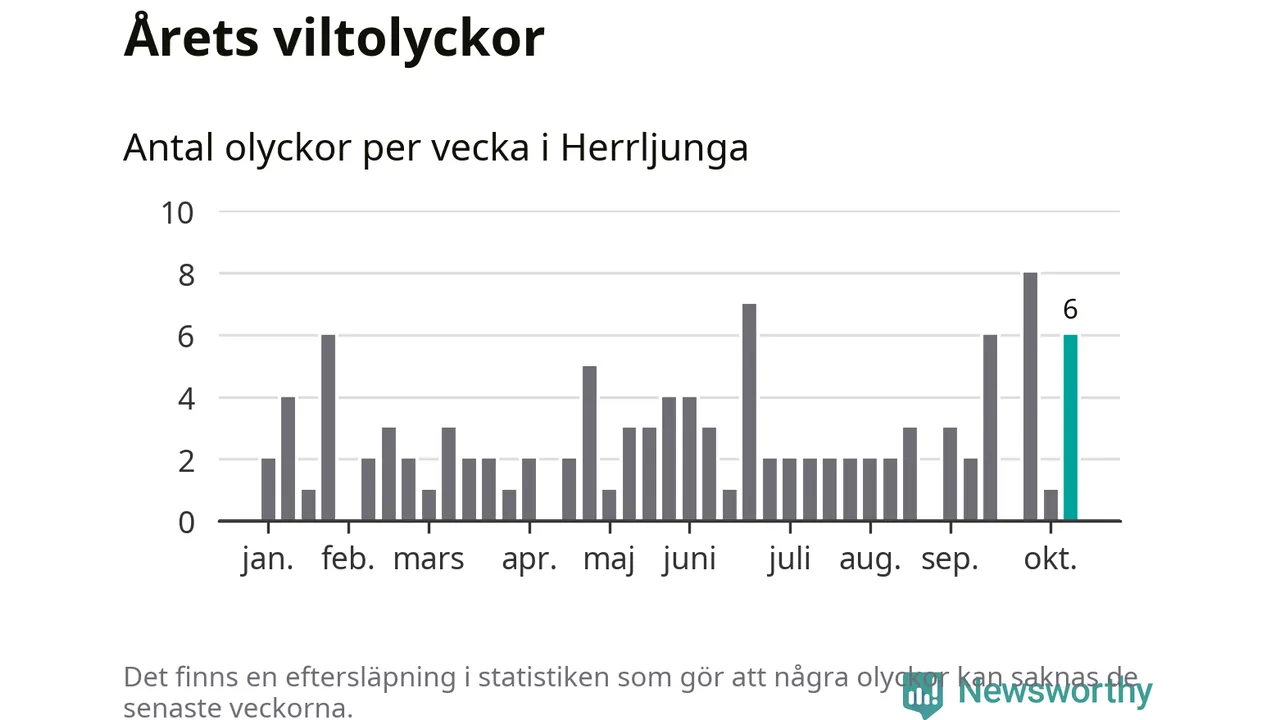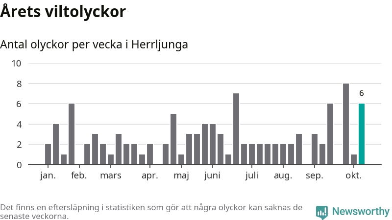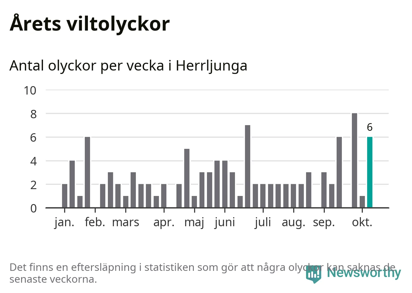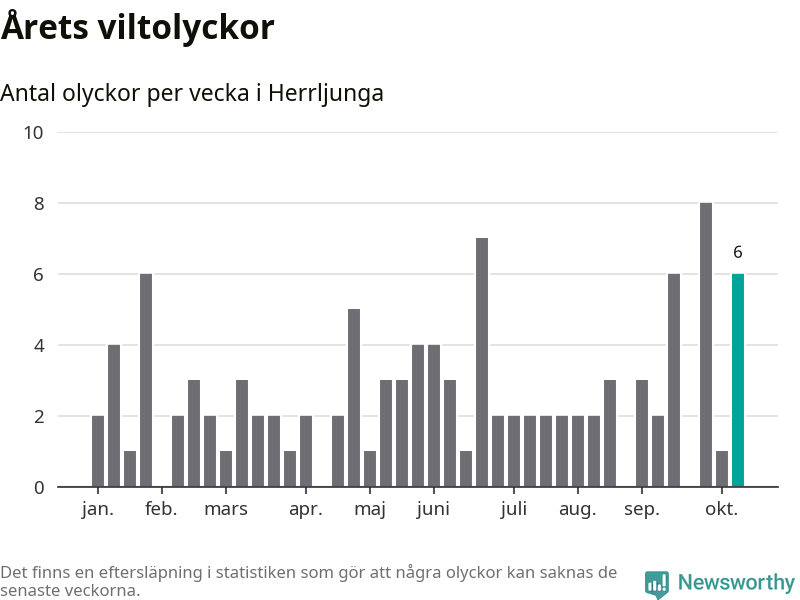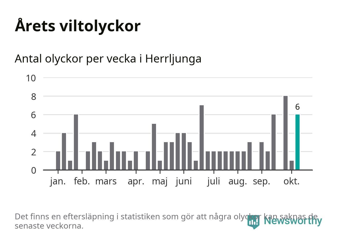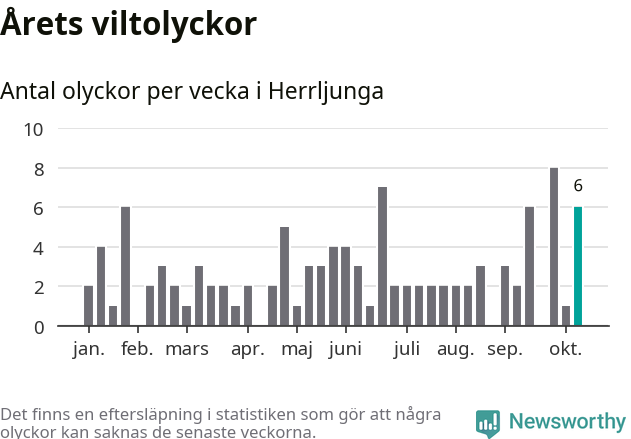Hittills har sex viltolyckor rapporterats in i Herrljunga kommun från vecka 42. Se listan här.