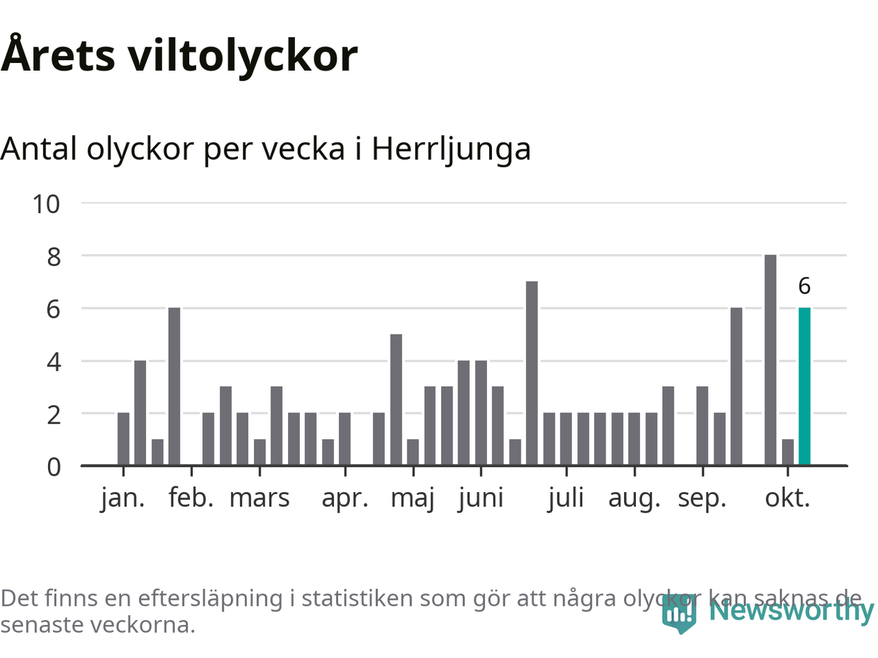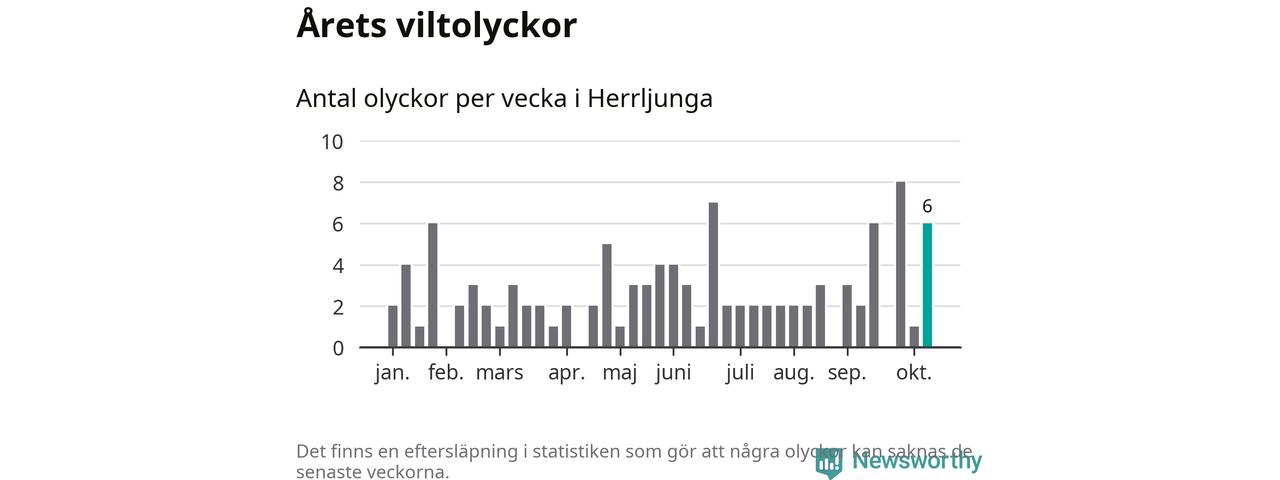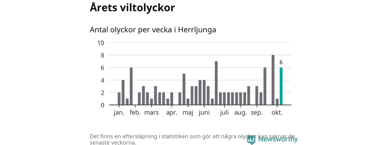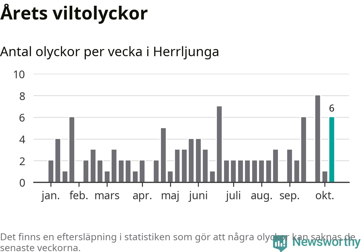 Hittills har sex viltolyckor rapporterats in i Herrljunga kommun från vecka 42. Se listan här.