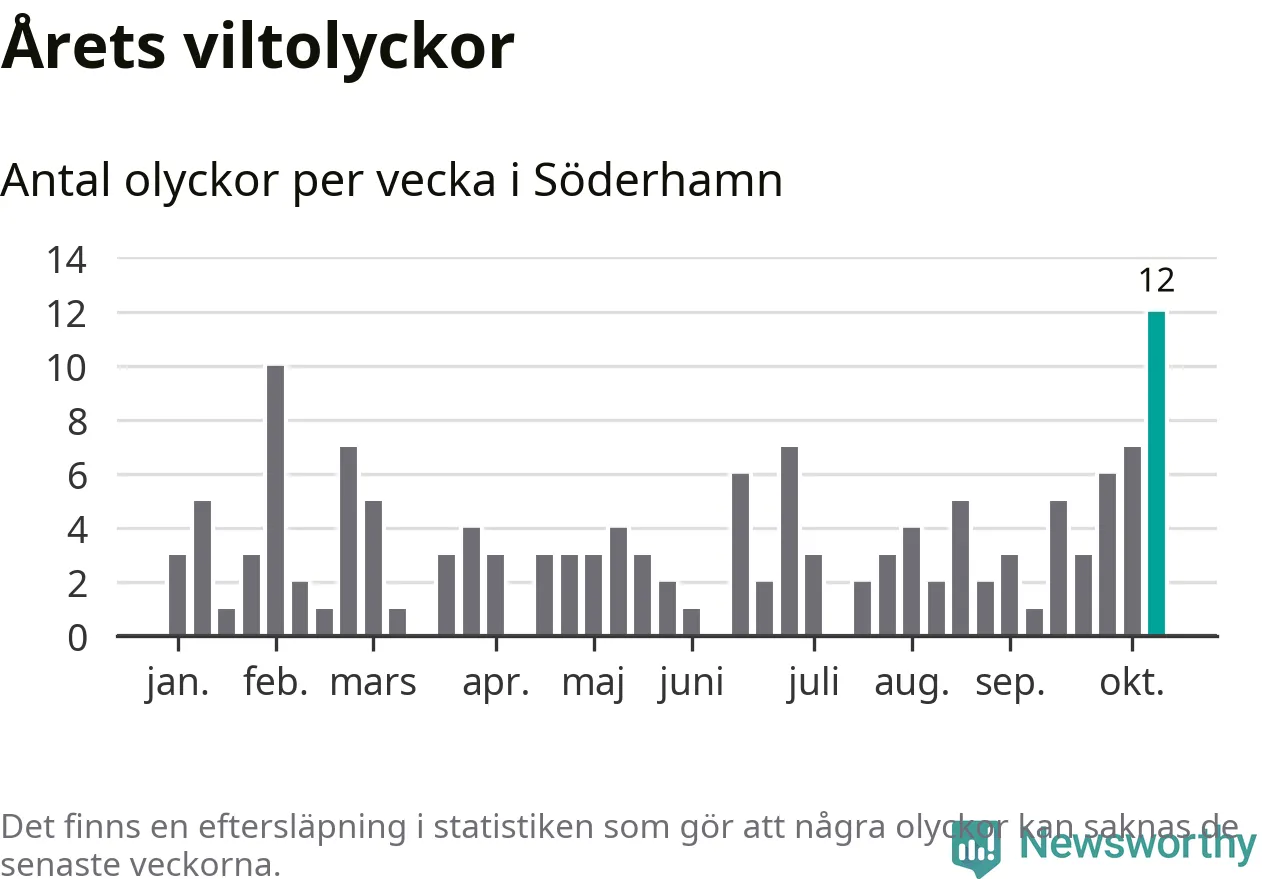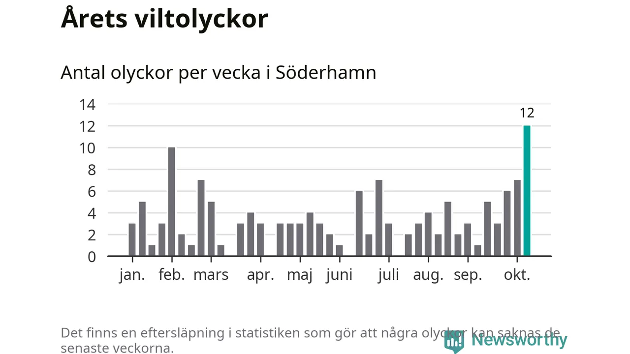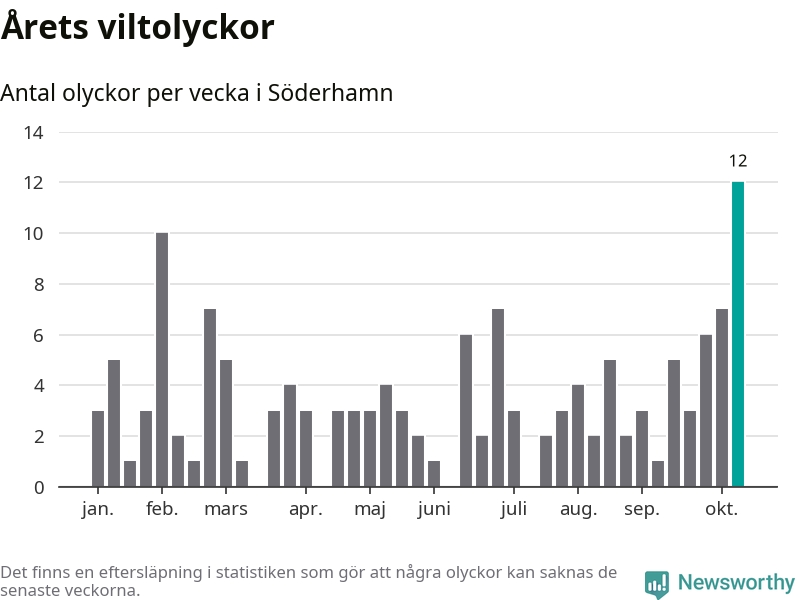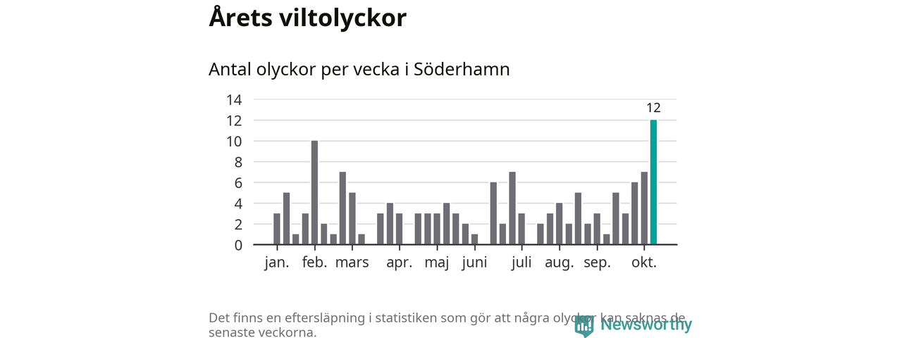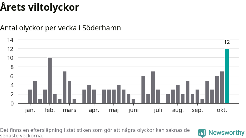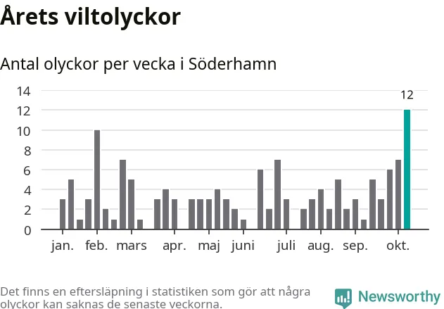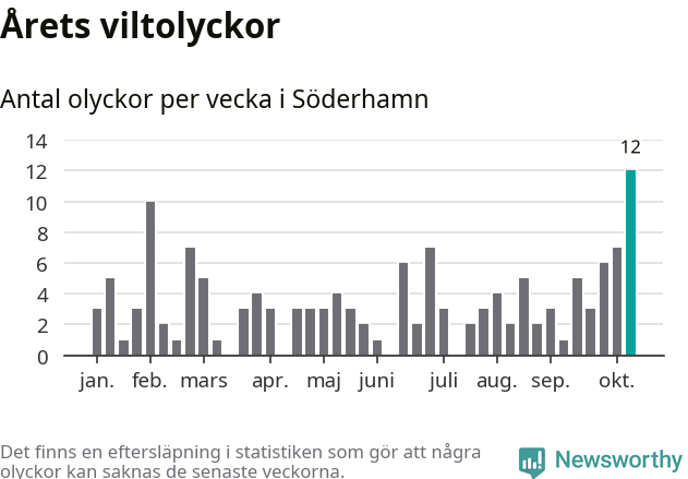 Hittills har tolv viltolyckor rapporterats in i Söderhamns kommun från vecka 42. Det är en av de högsta höstsiffrorna för en enskild vecka på över tio år.