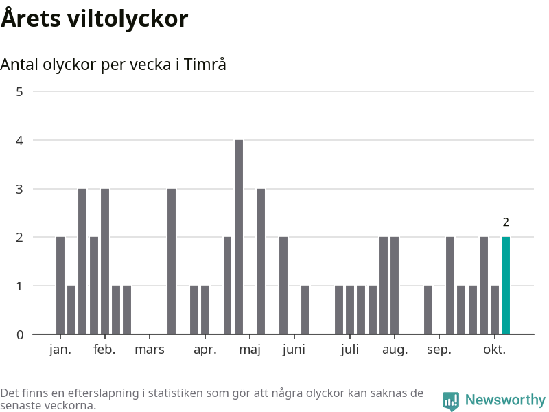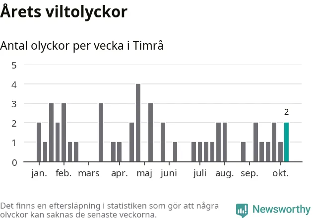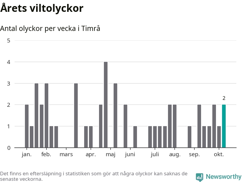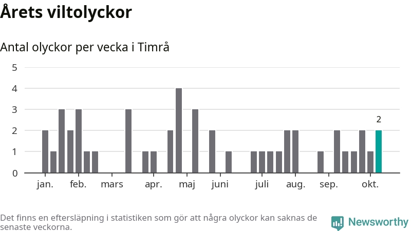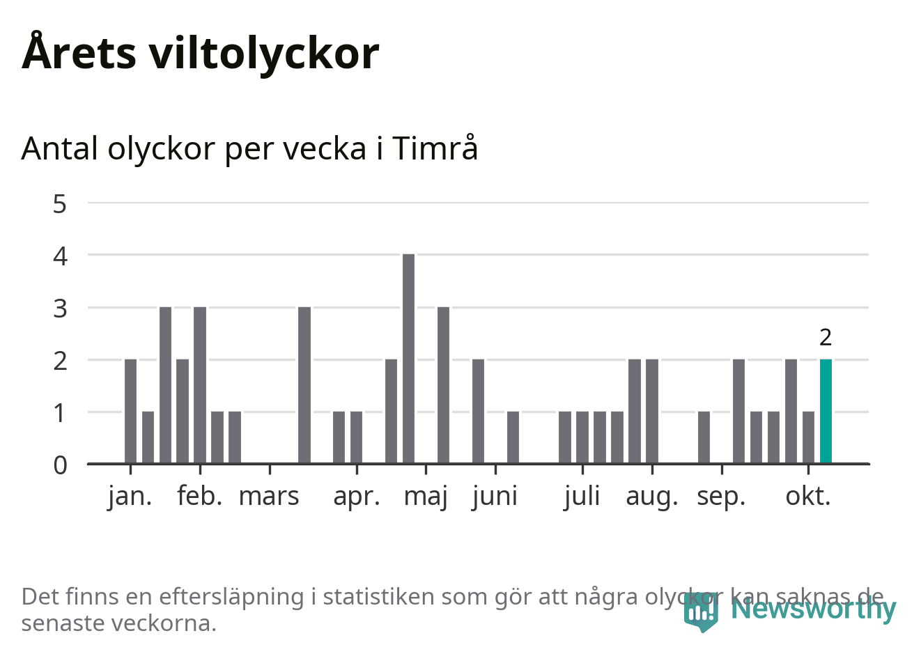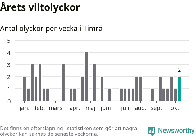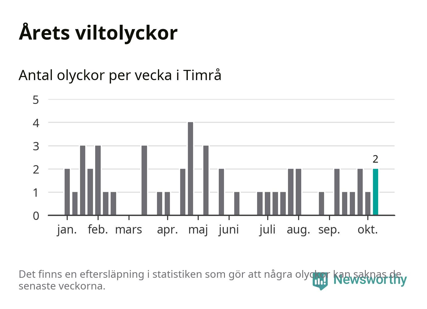 Hittills har två viltolyckor rapporterats in i Timrå kommun från vecka 42. Se listan här.