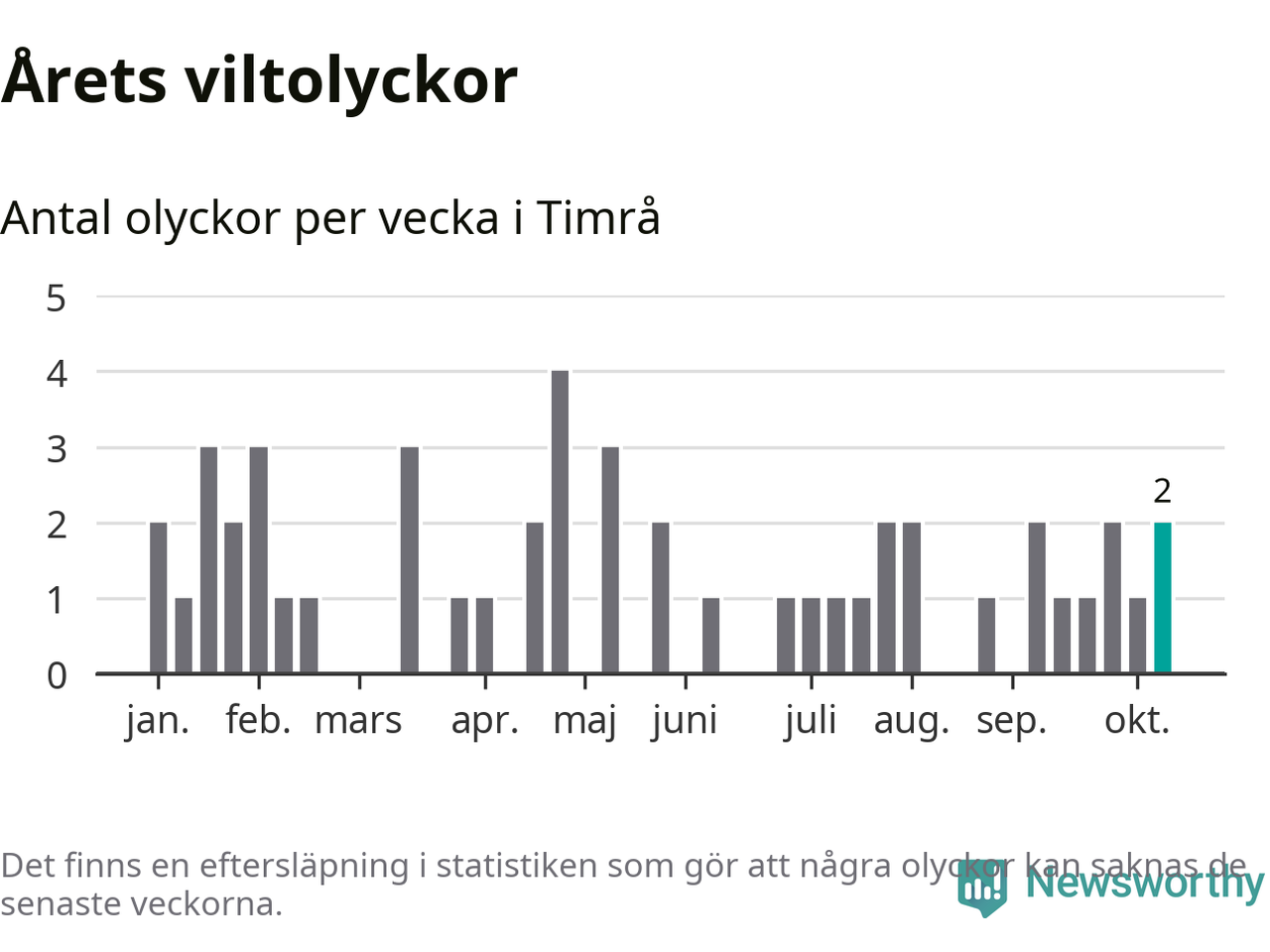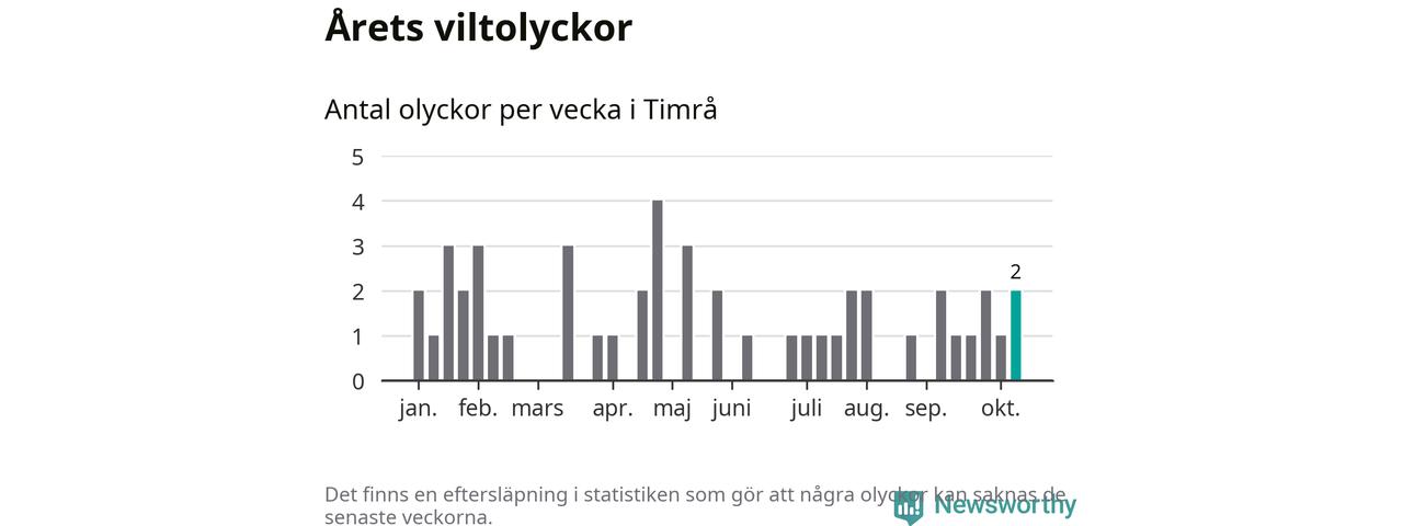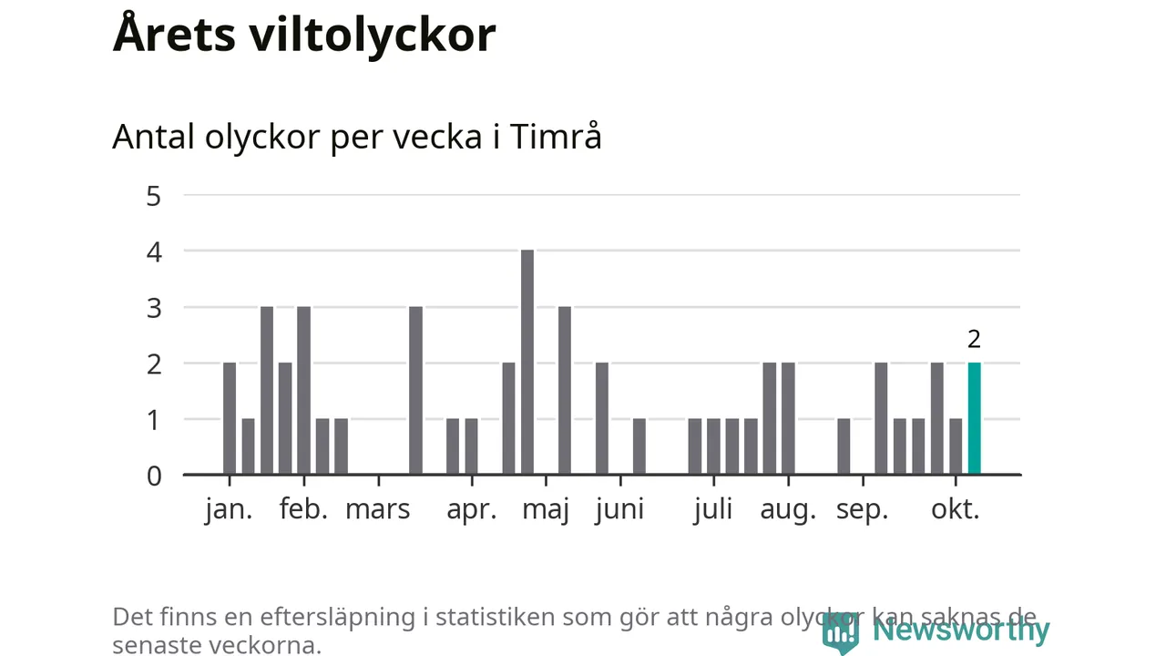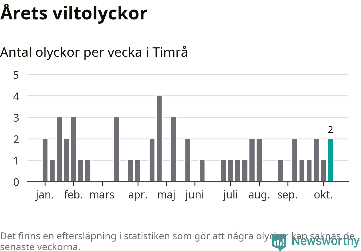 Hittills har två viltolyckor rapporterats in i Timrå kommun från vecka 42. Se listan här.