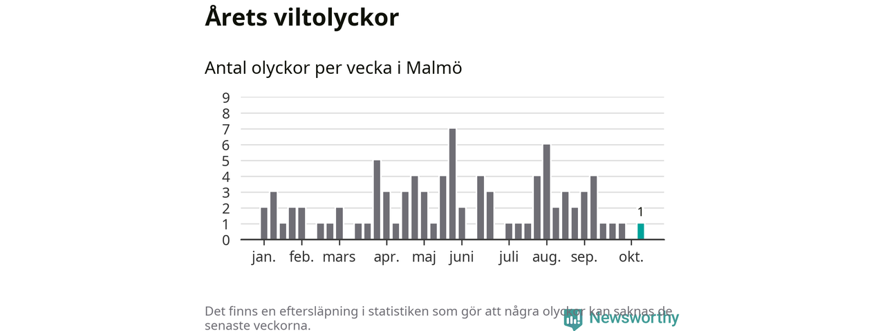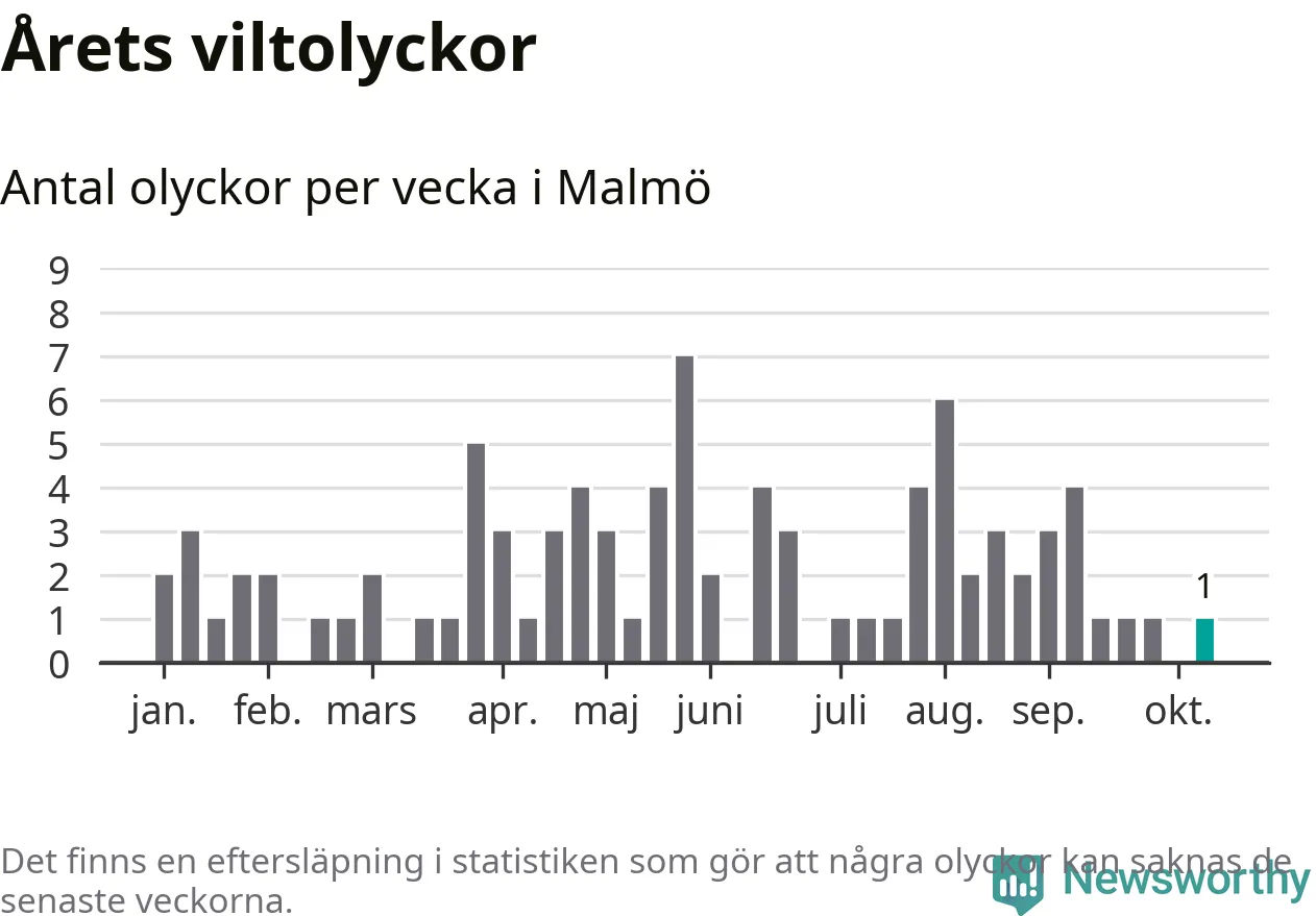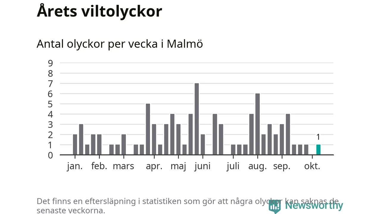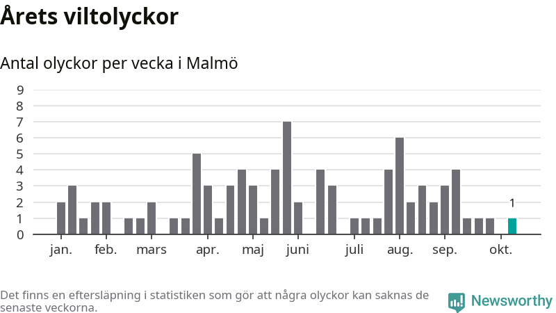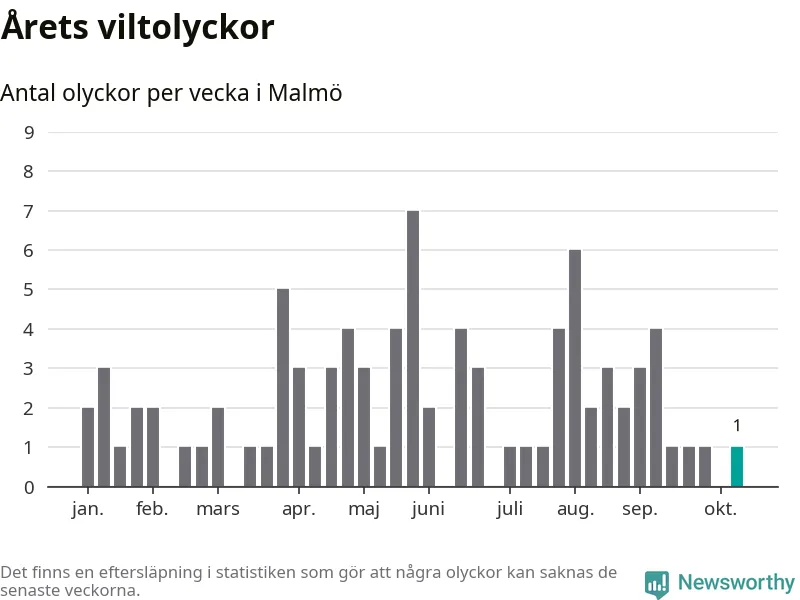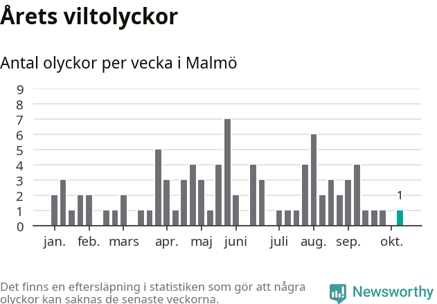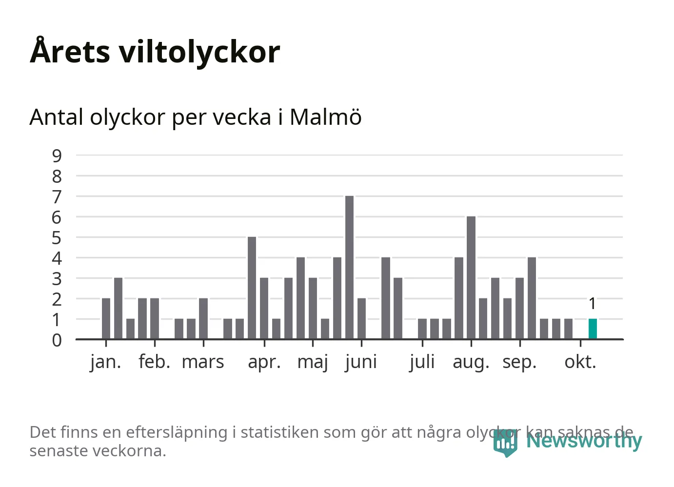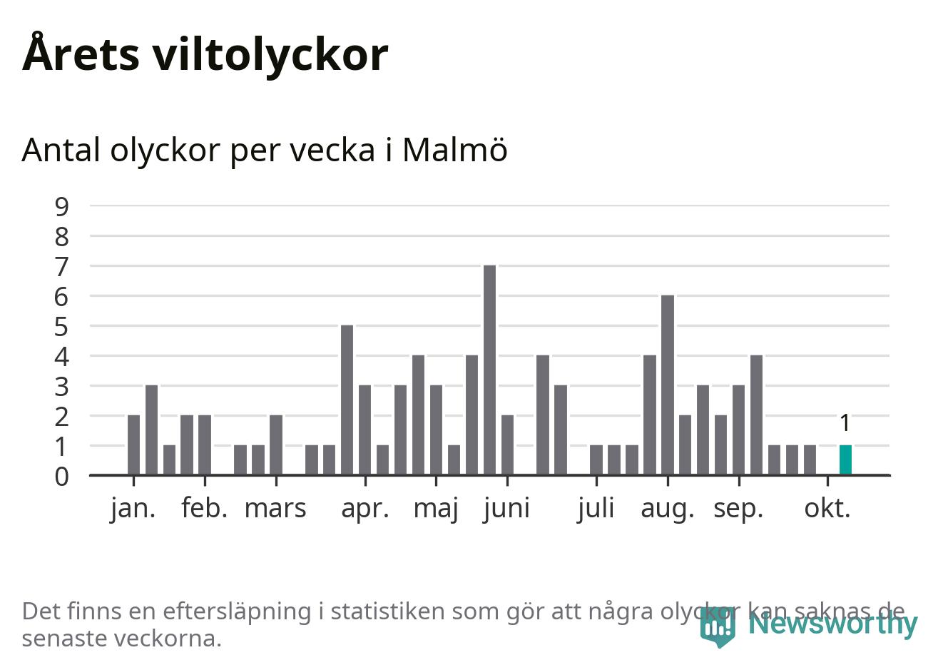 Från förra veckan (vecka 42) har hittills en viltolycka rapporterats in i Malmö kommun.