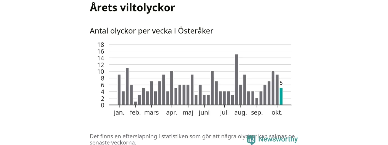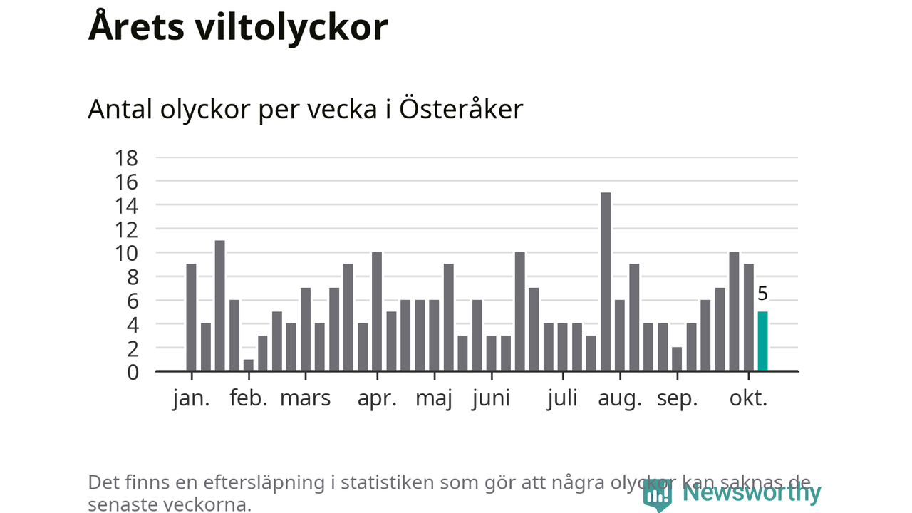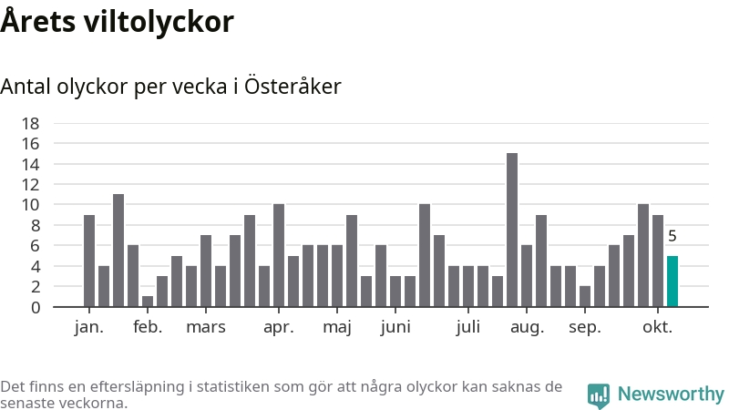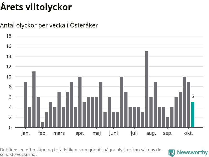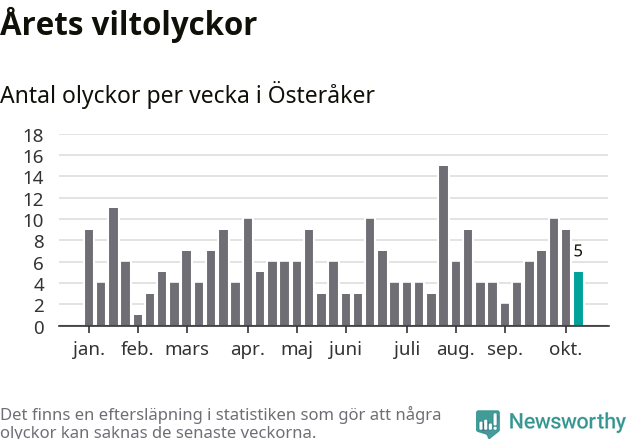 Hittills har fem viltolyckor rapporterats in i Österåkers kommun från vecka 42. Se listan här.