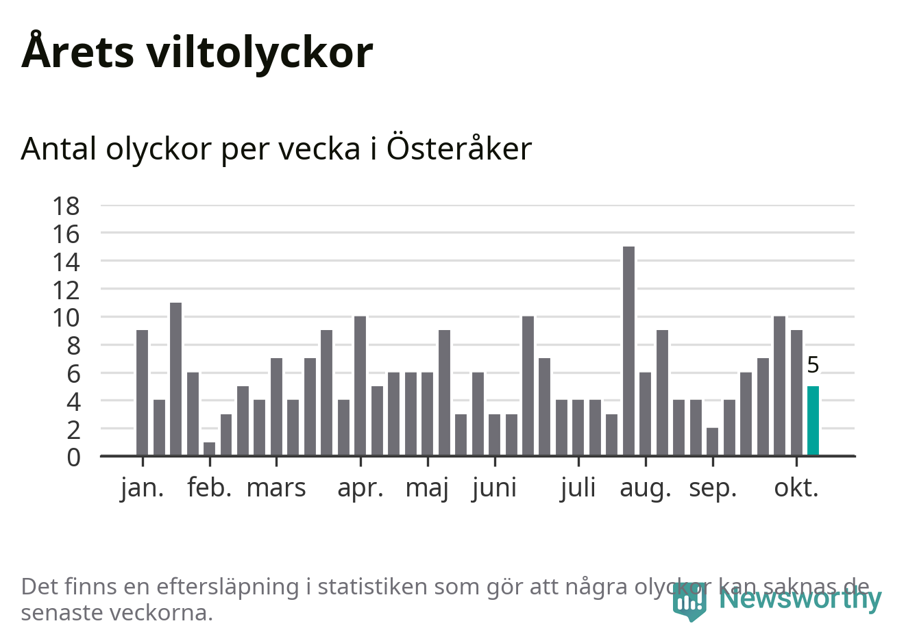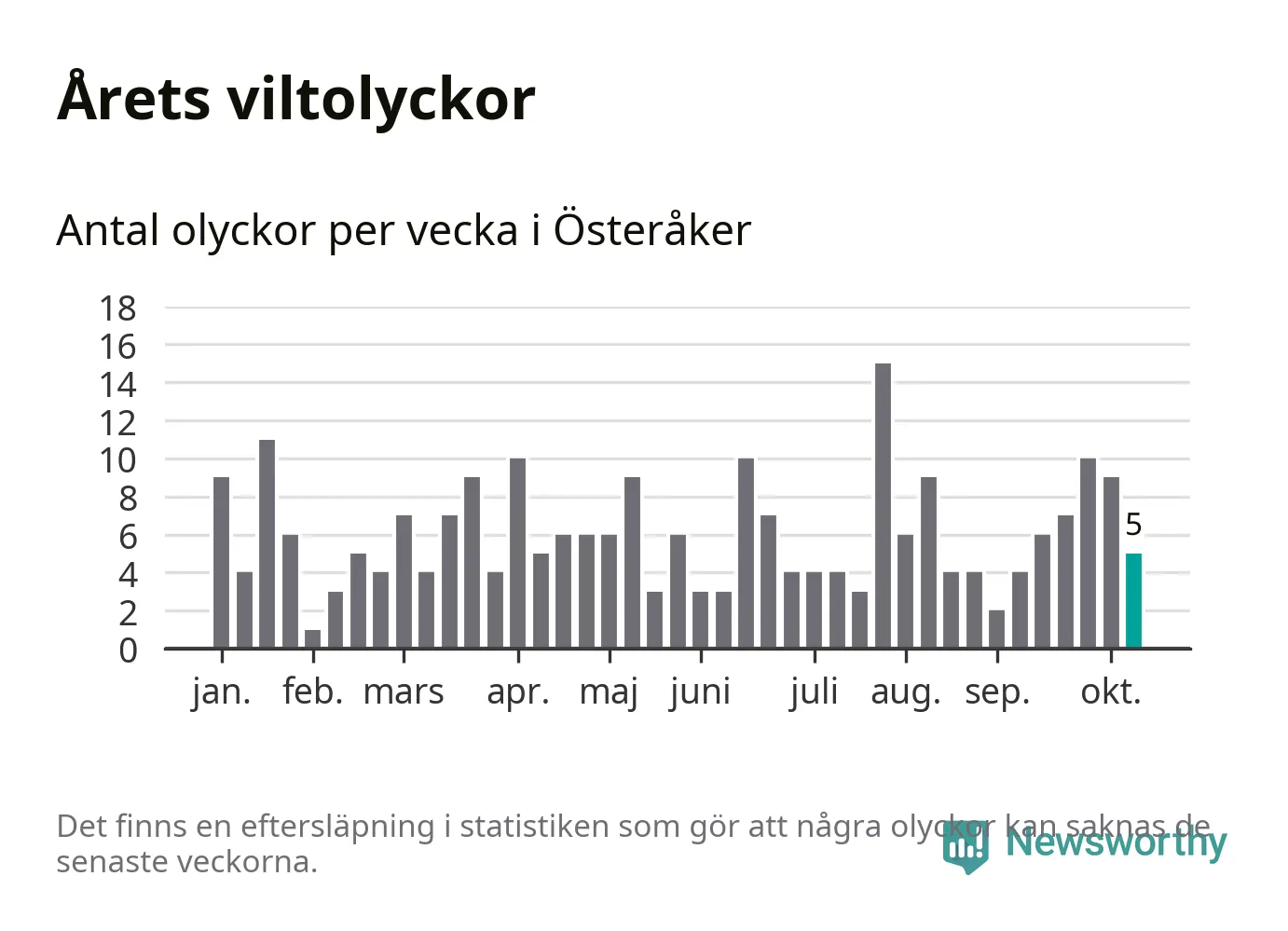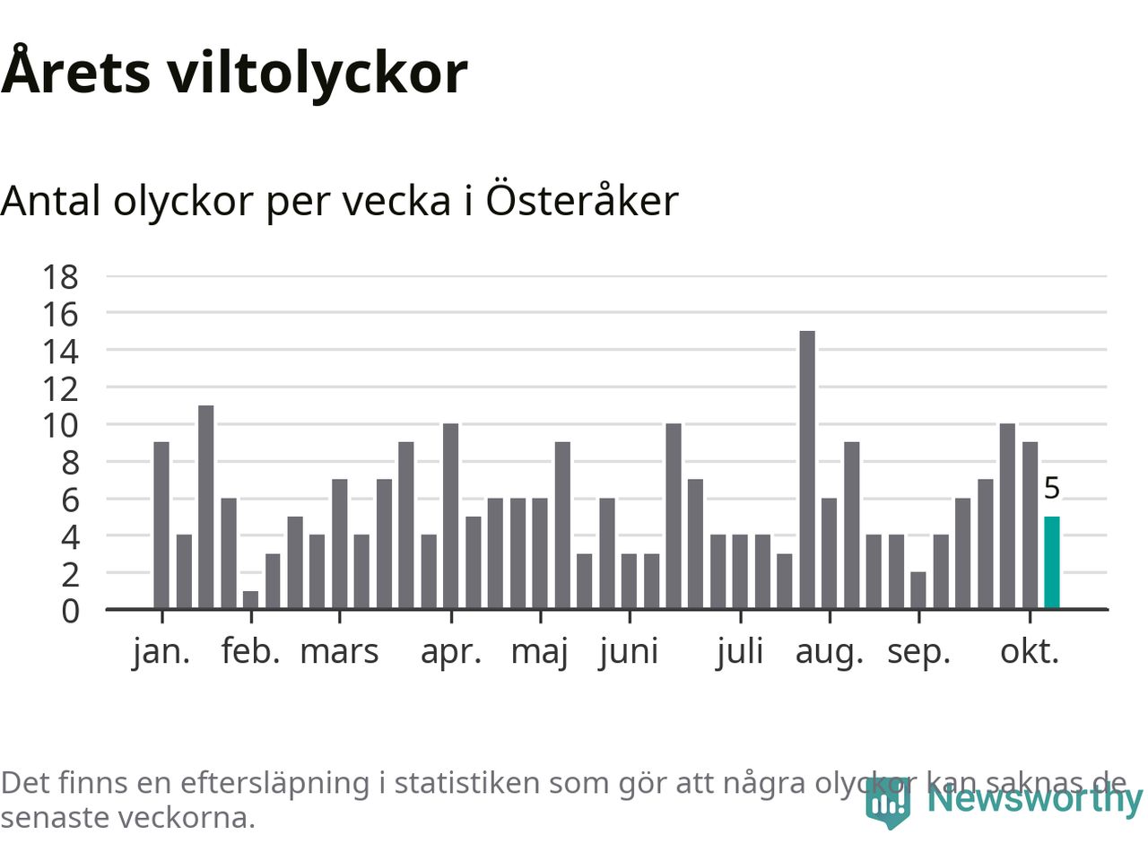 Hittills har fem viltolyckor rapporterats in i Österåkers kommun från vecka 42. Se listan här.