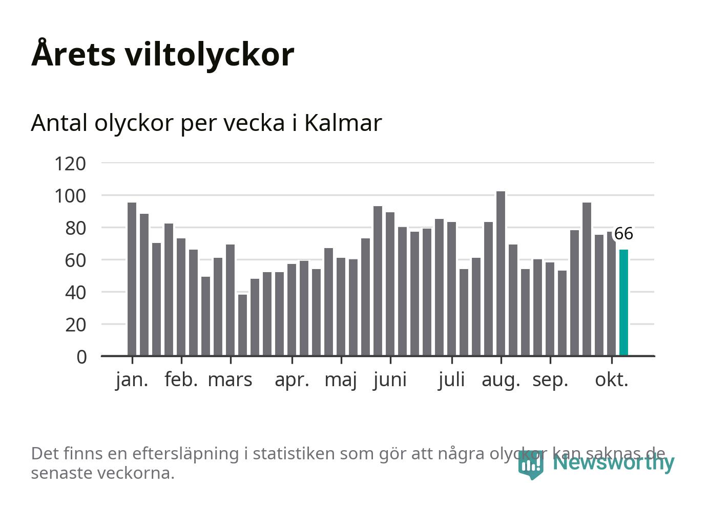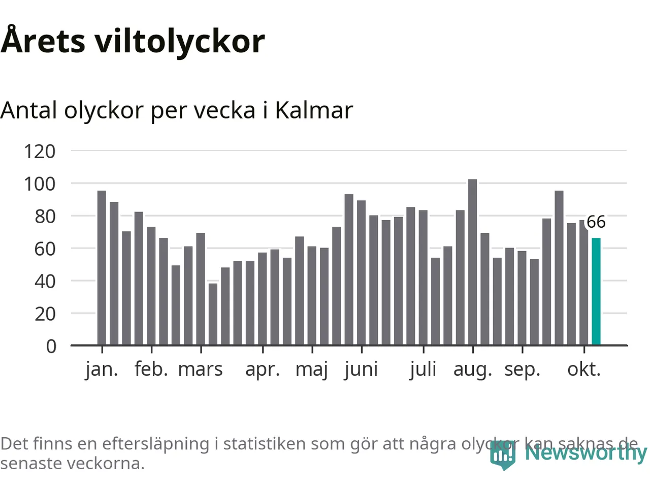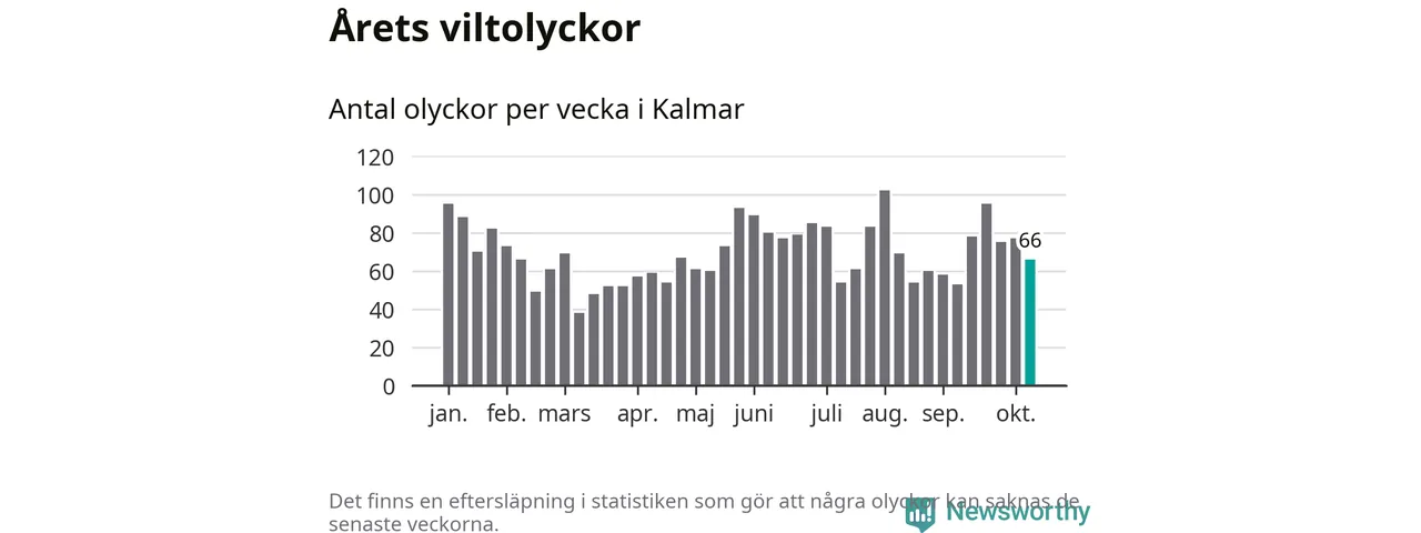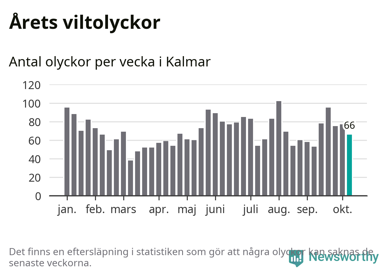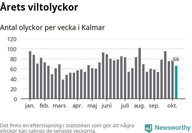 Hittills har 66 viltolyckor rapporterats in i Kalmar län från vecka 42. Se listan här.