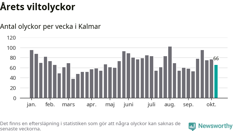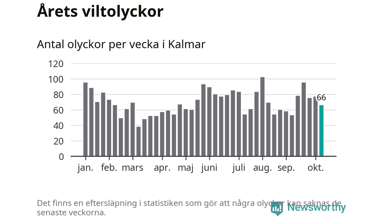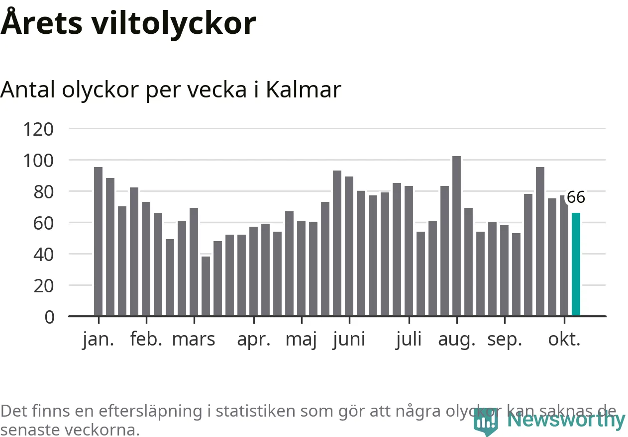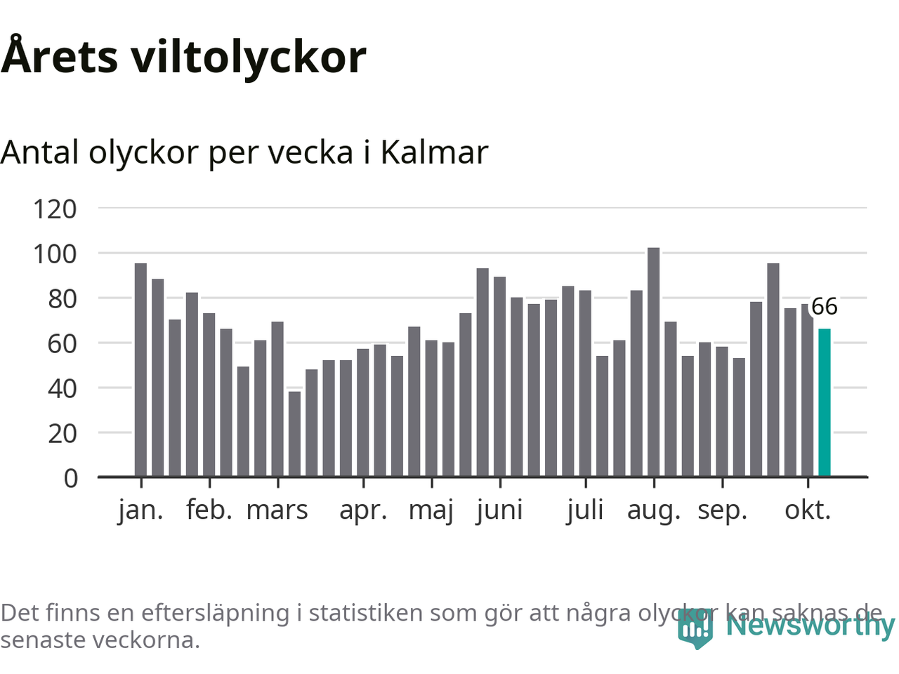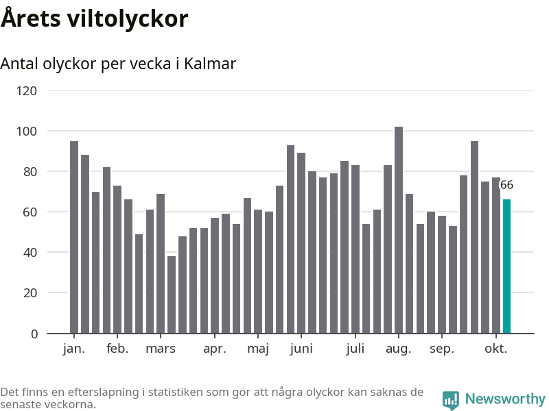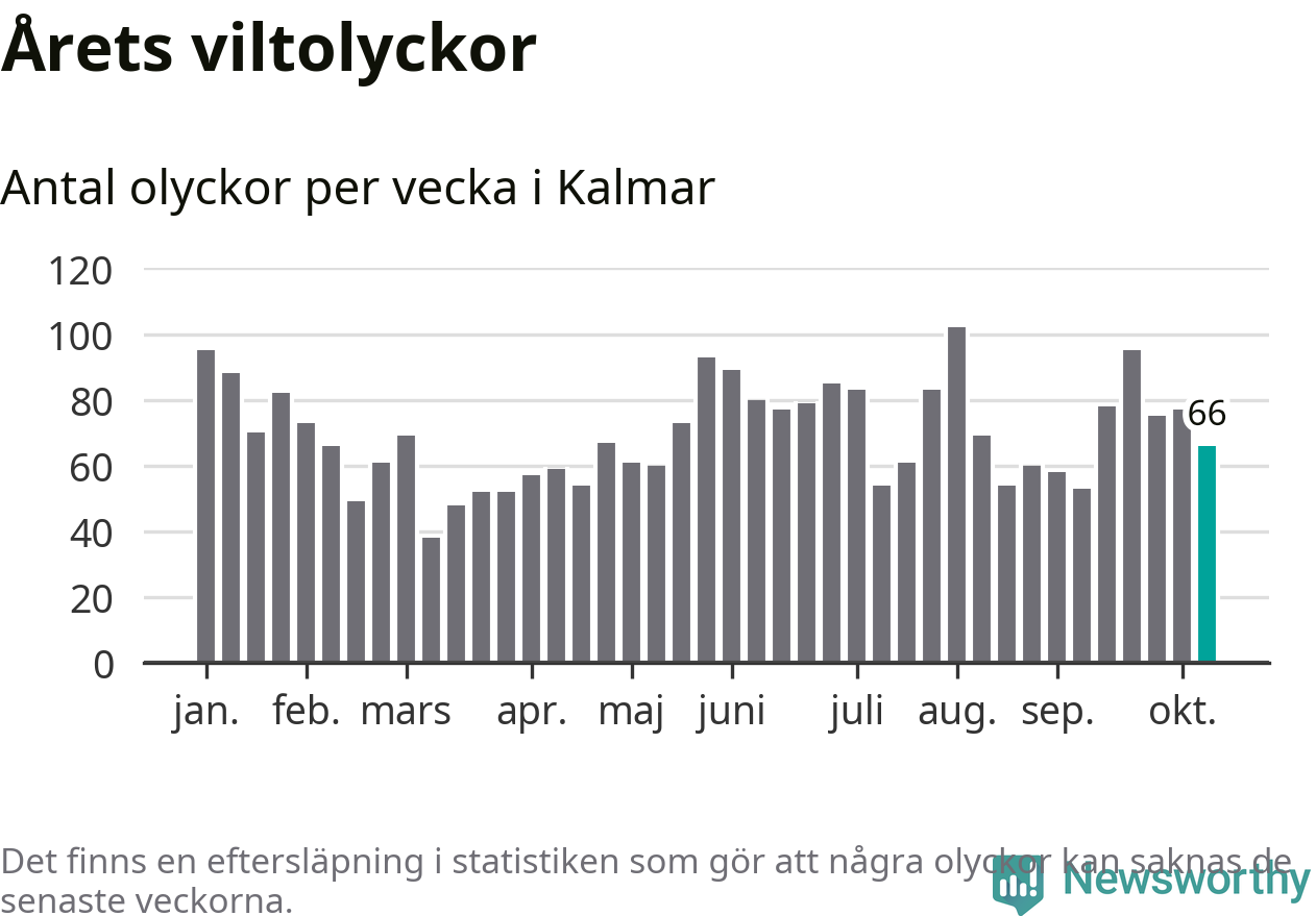 Hittills har 66 viltolyckor rapporterats in i Kalmar län från vecka 42. Se listan här.