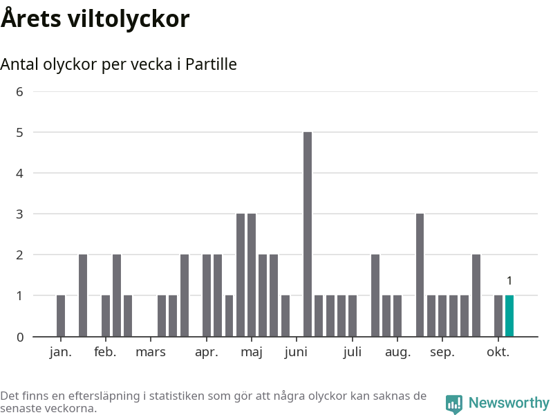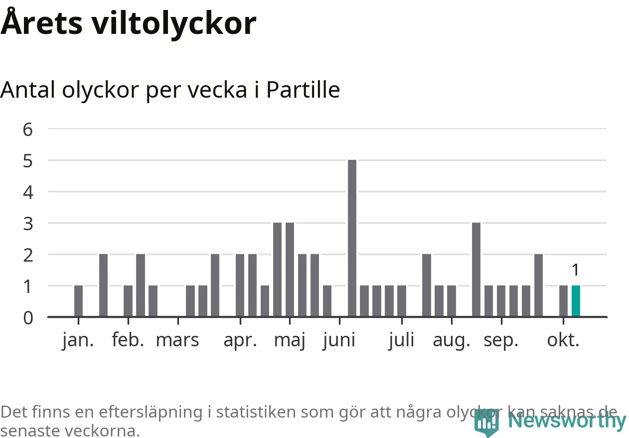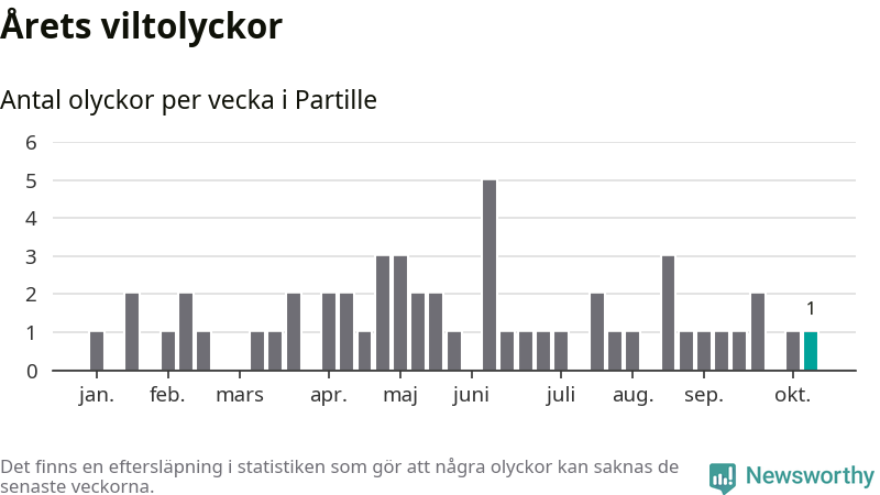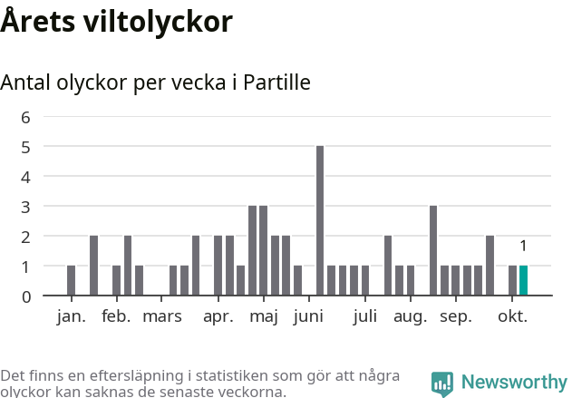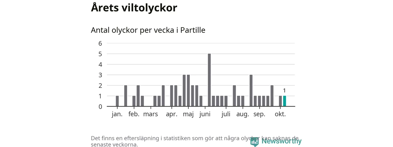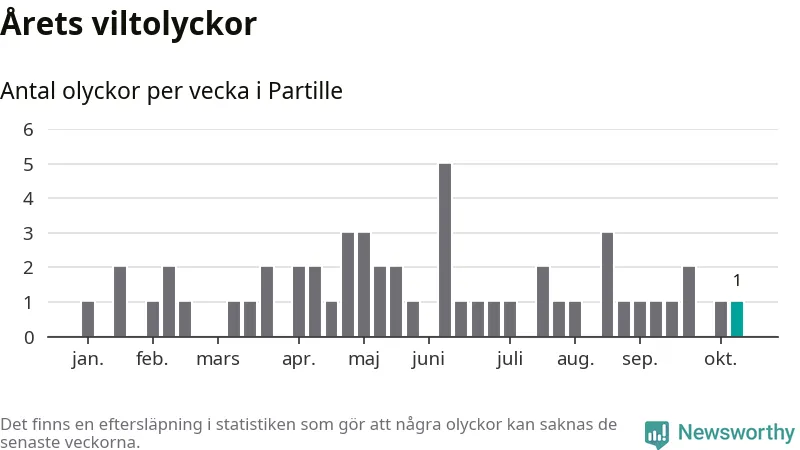 Från förra veckan (vecka 42) har hittills en viltolycka rapporterats in i Partille kommun.