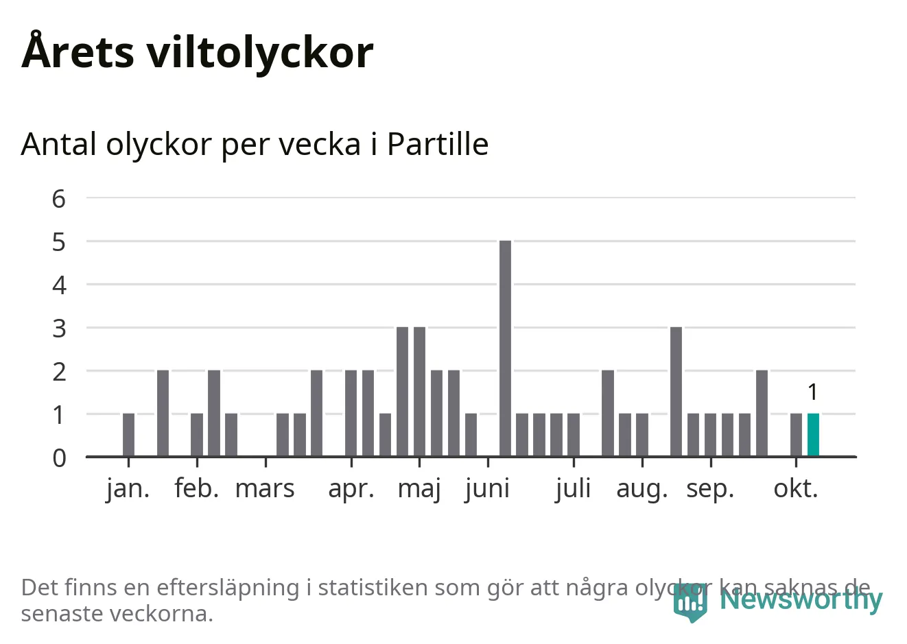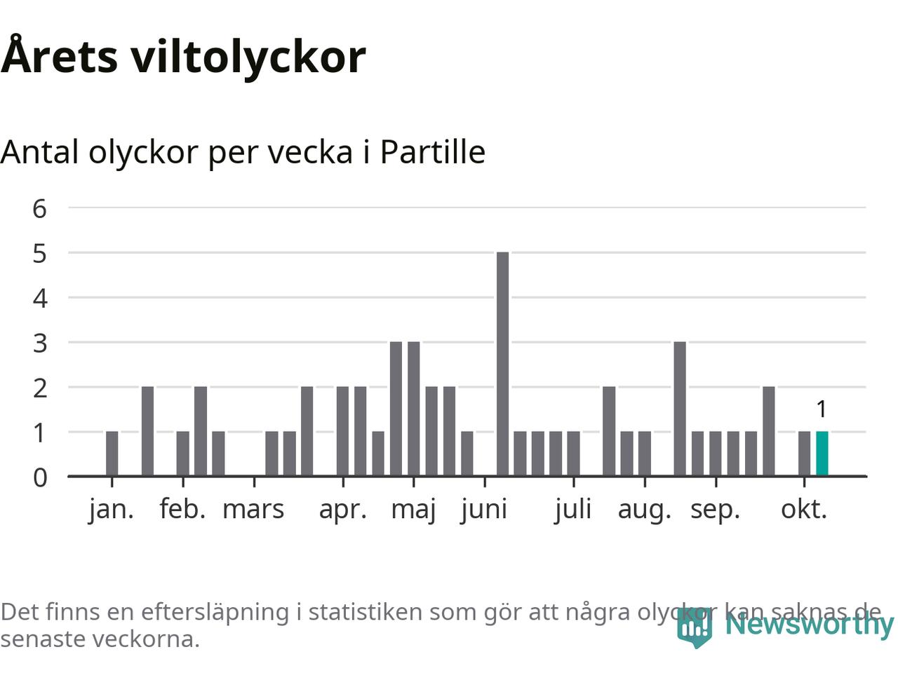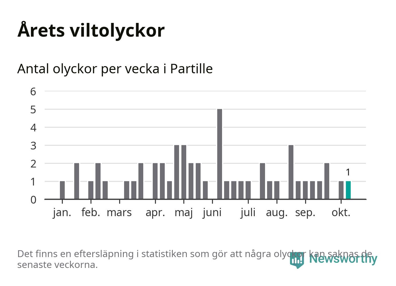 Från förra veckan (vecka 42) har hittills en viltolycka rapporterats in i Partille kommun.