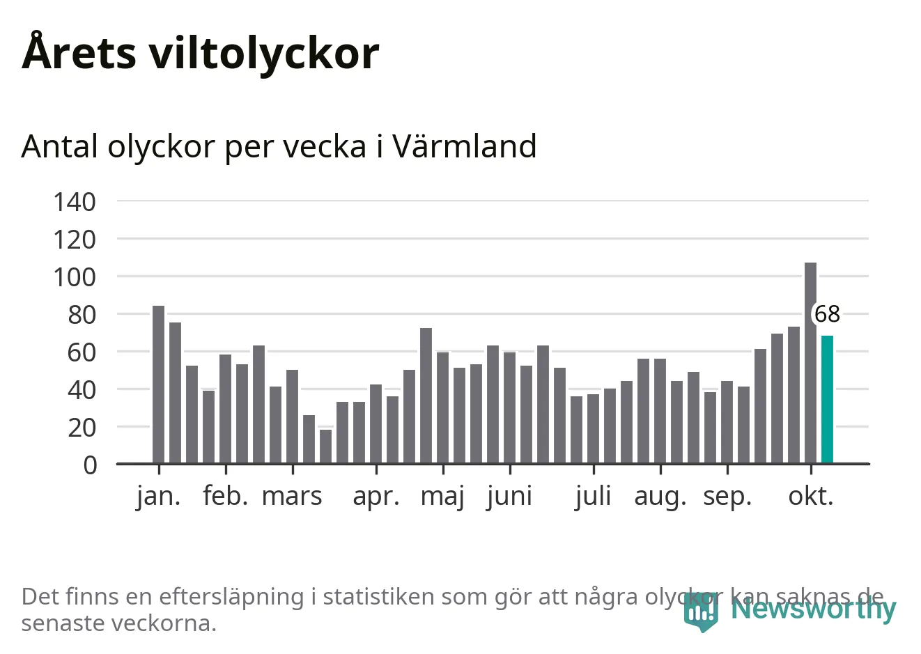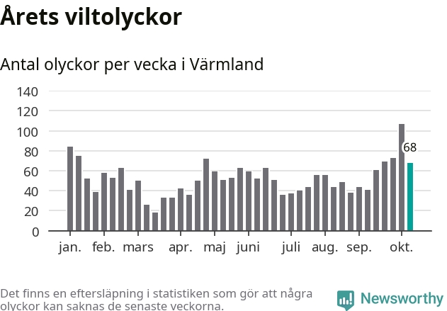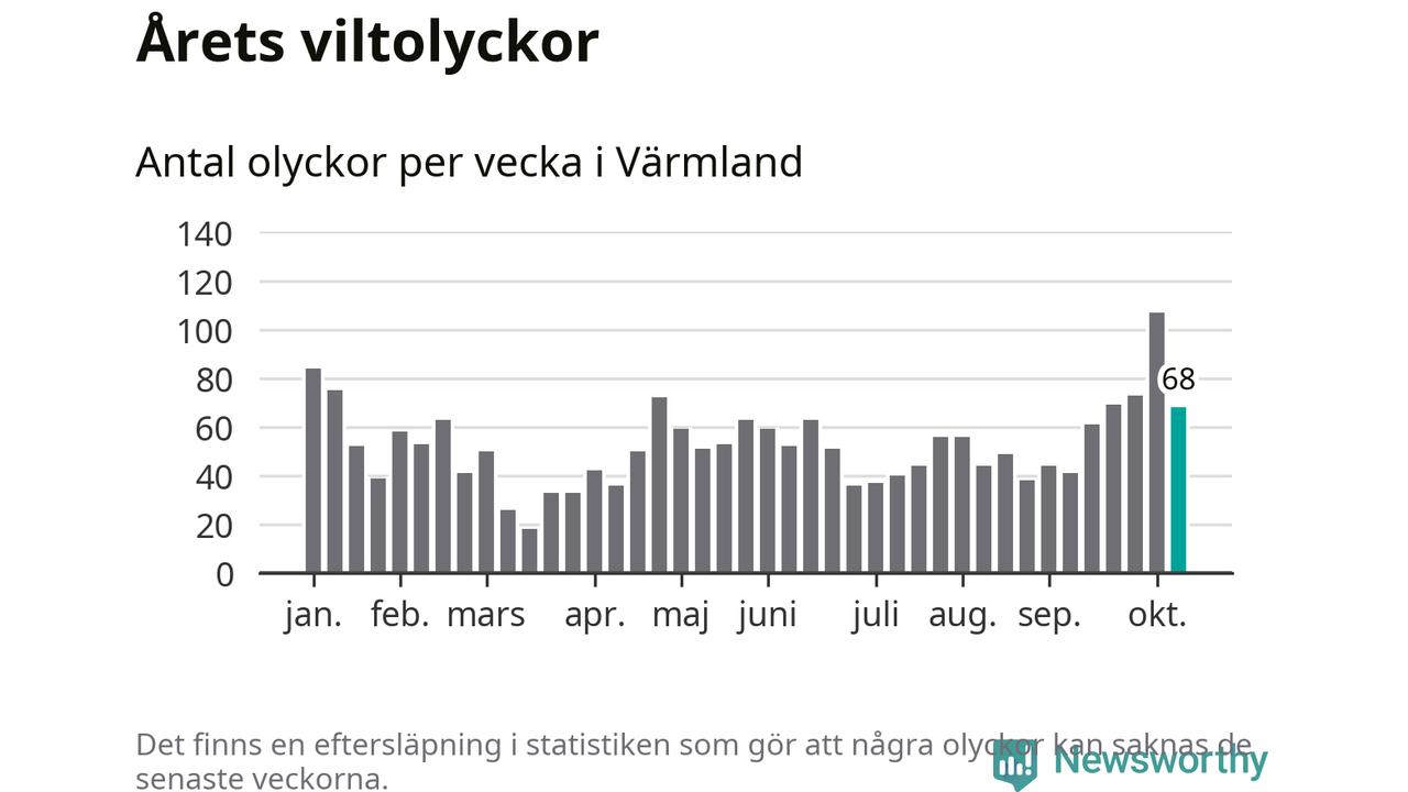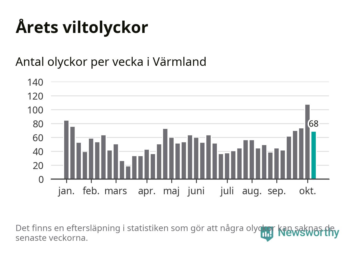 Hittills har 68 viltolyckor rapporterats in i Värmlands län från vecka 42. Se listan här.