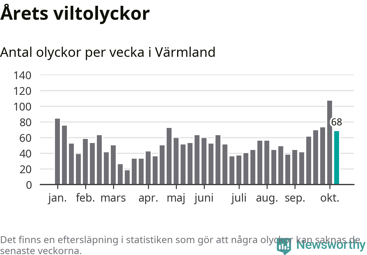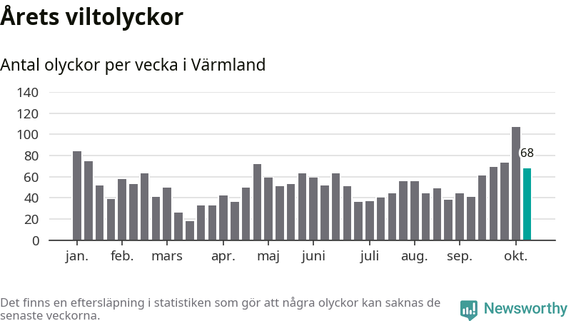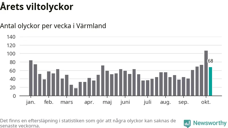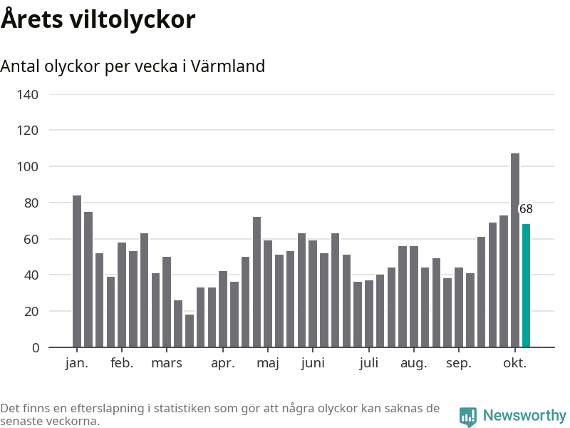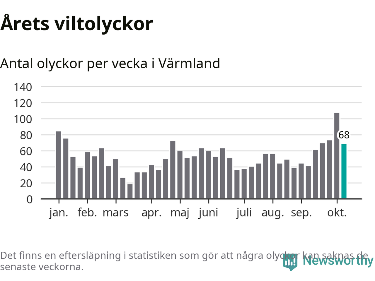 Hittills har 68 viltolyckor rapporterats in i Värmlands län från vecka 42. Se listan här.