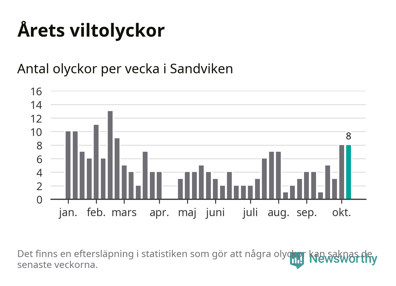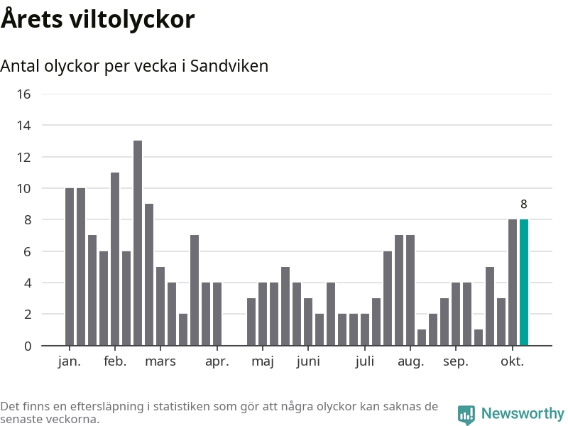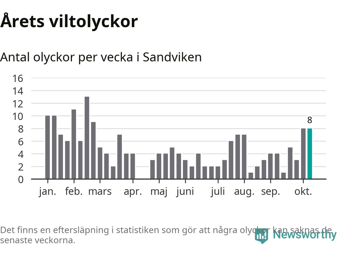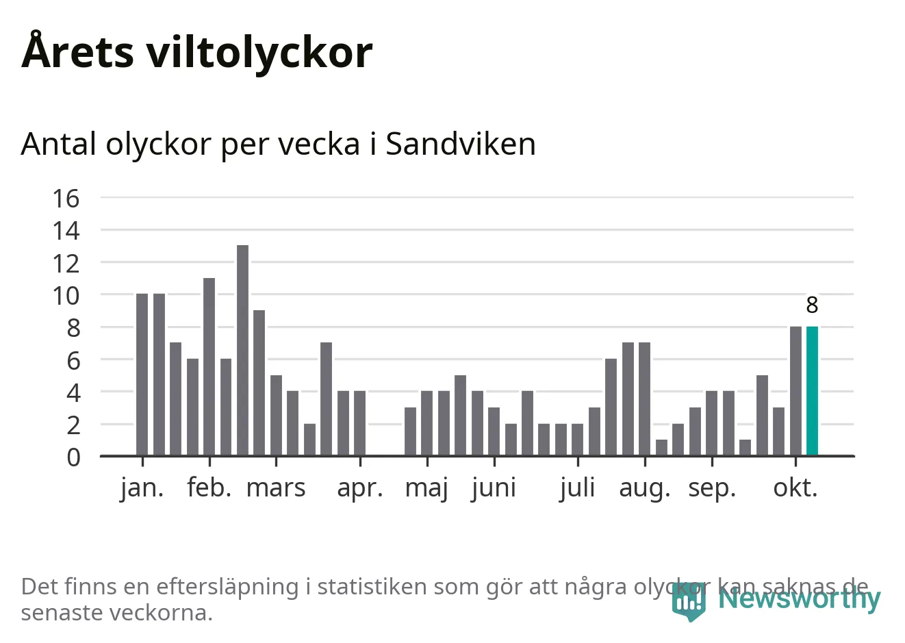 Hittills har åtta viltolyckor rapporterats in i Sandvikens kommun från vecka 42. Se listan här.