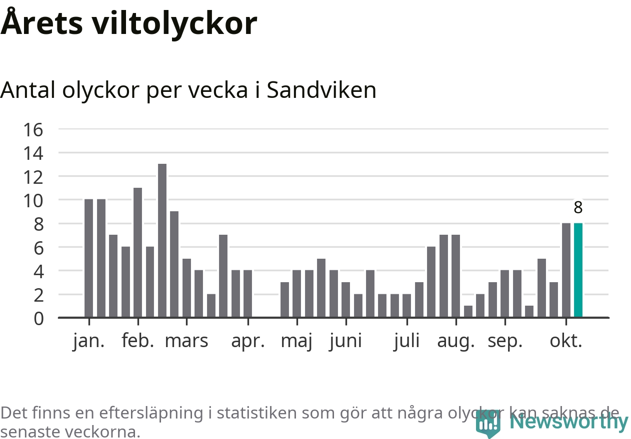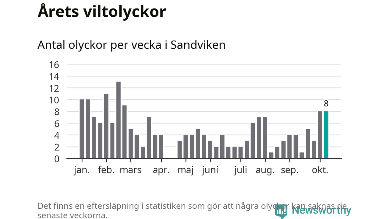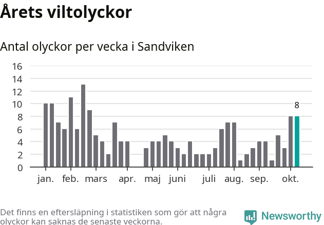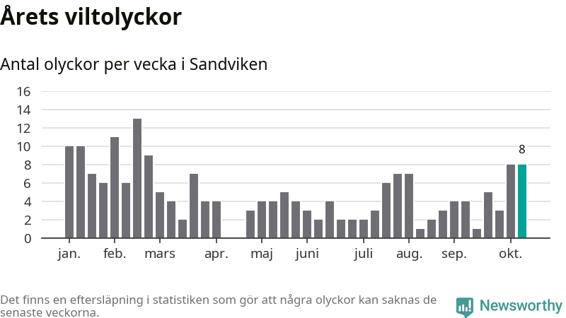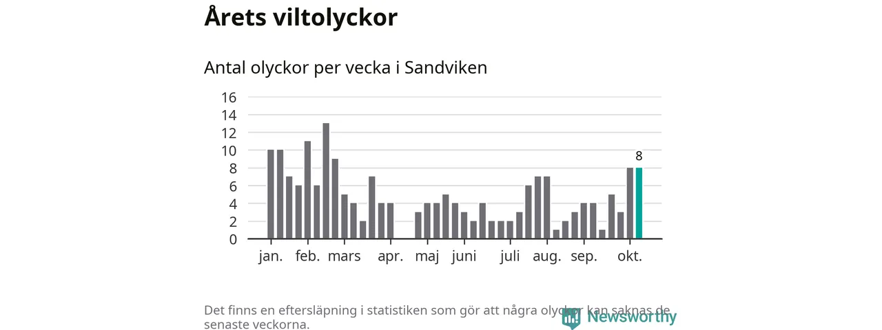 Hittills har åtta viltolyckor rapporterats in i Sandvikens kommun från vecka 42. Se listan här.