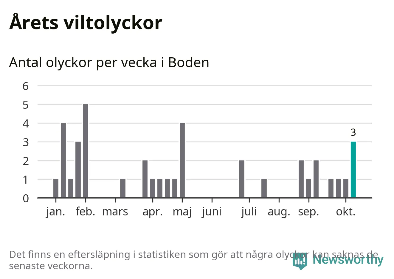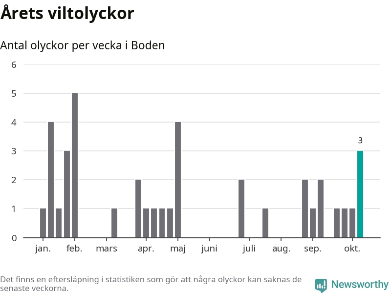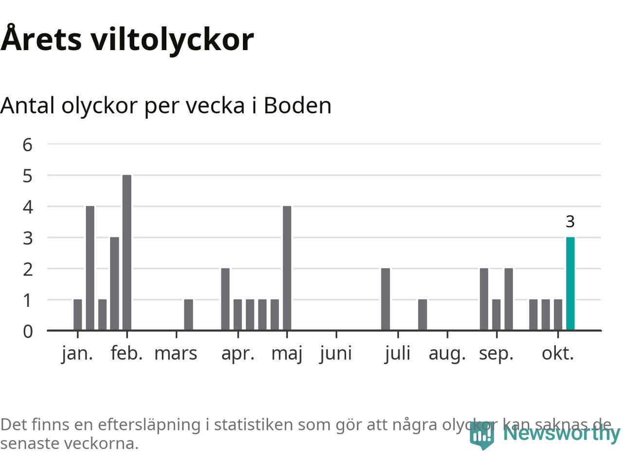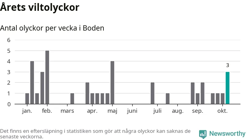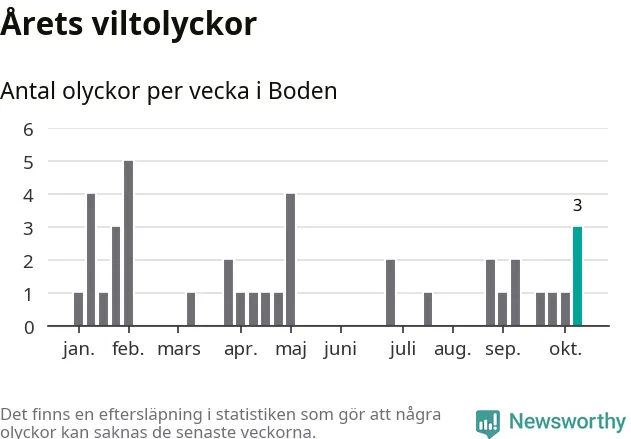 Hittills har tre viltolyckor rapporterats in i Bodens kommun från vecka 42. Se listan här.