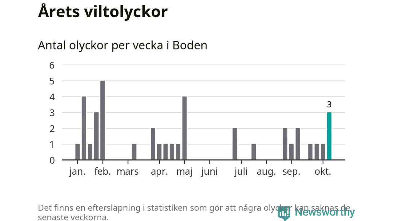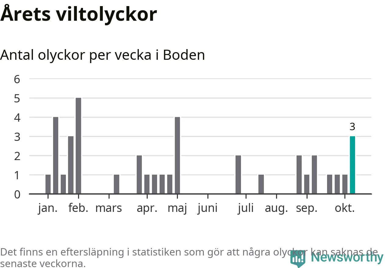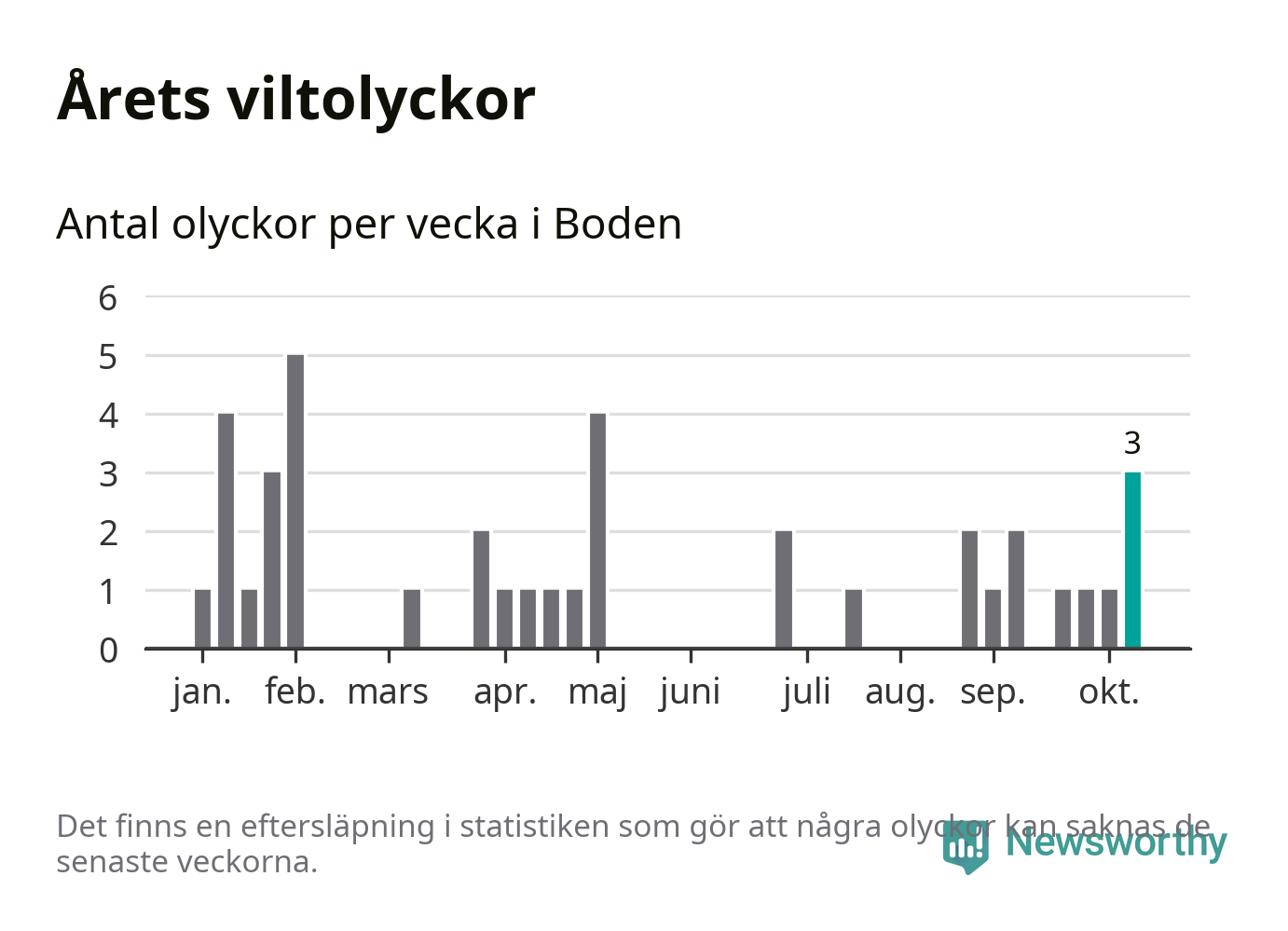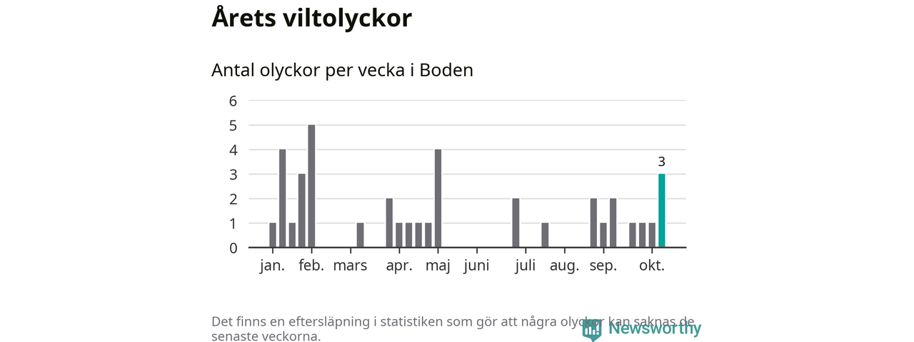 Hittills har tre viltolyckor rapporterats in i Bodens kommun från vecka 42. Se listan här.