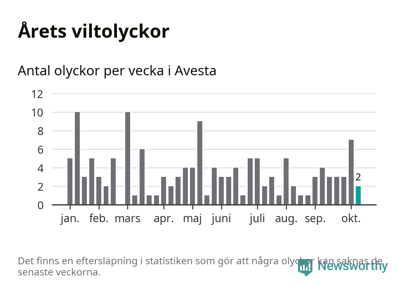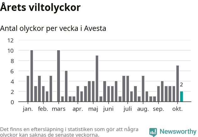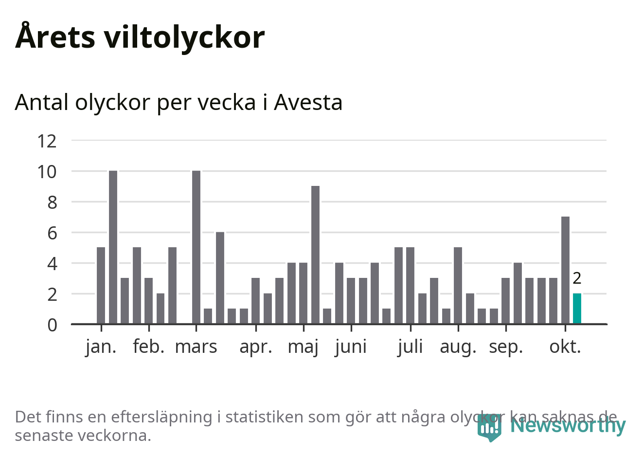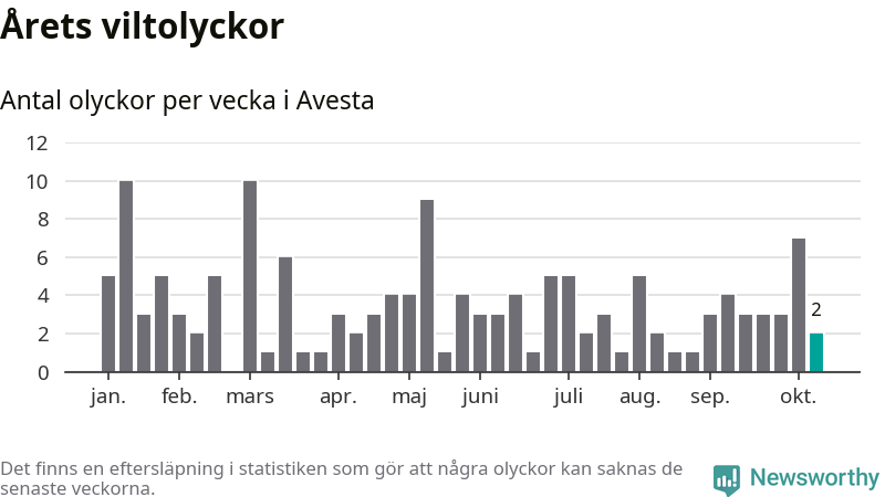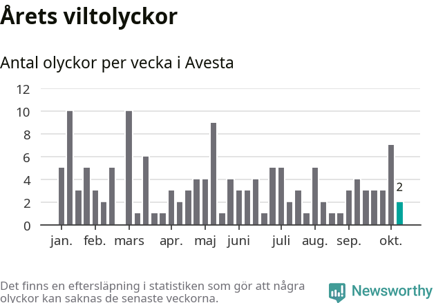 Hittills har två viltolyckor rapporterats in i Avesta kommun från vecka 42. Se listan här.