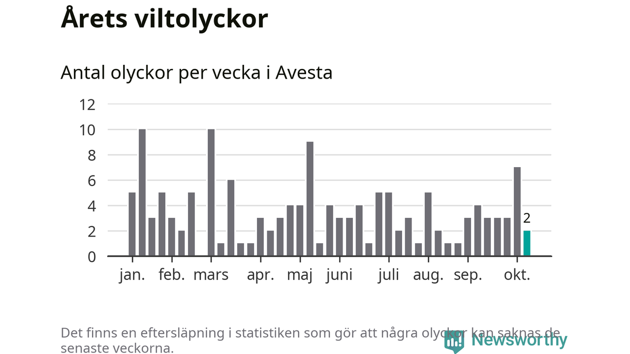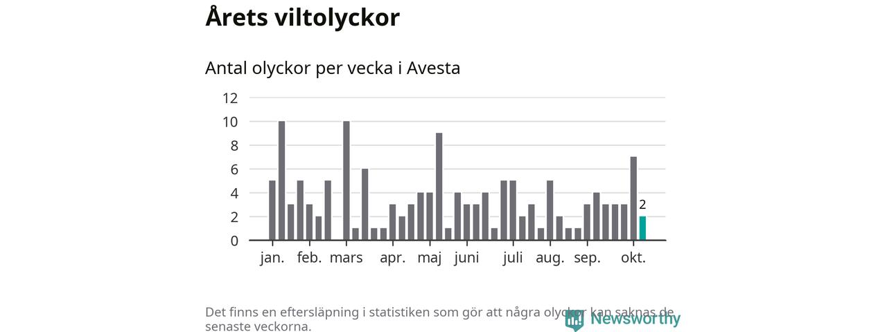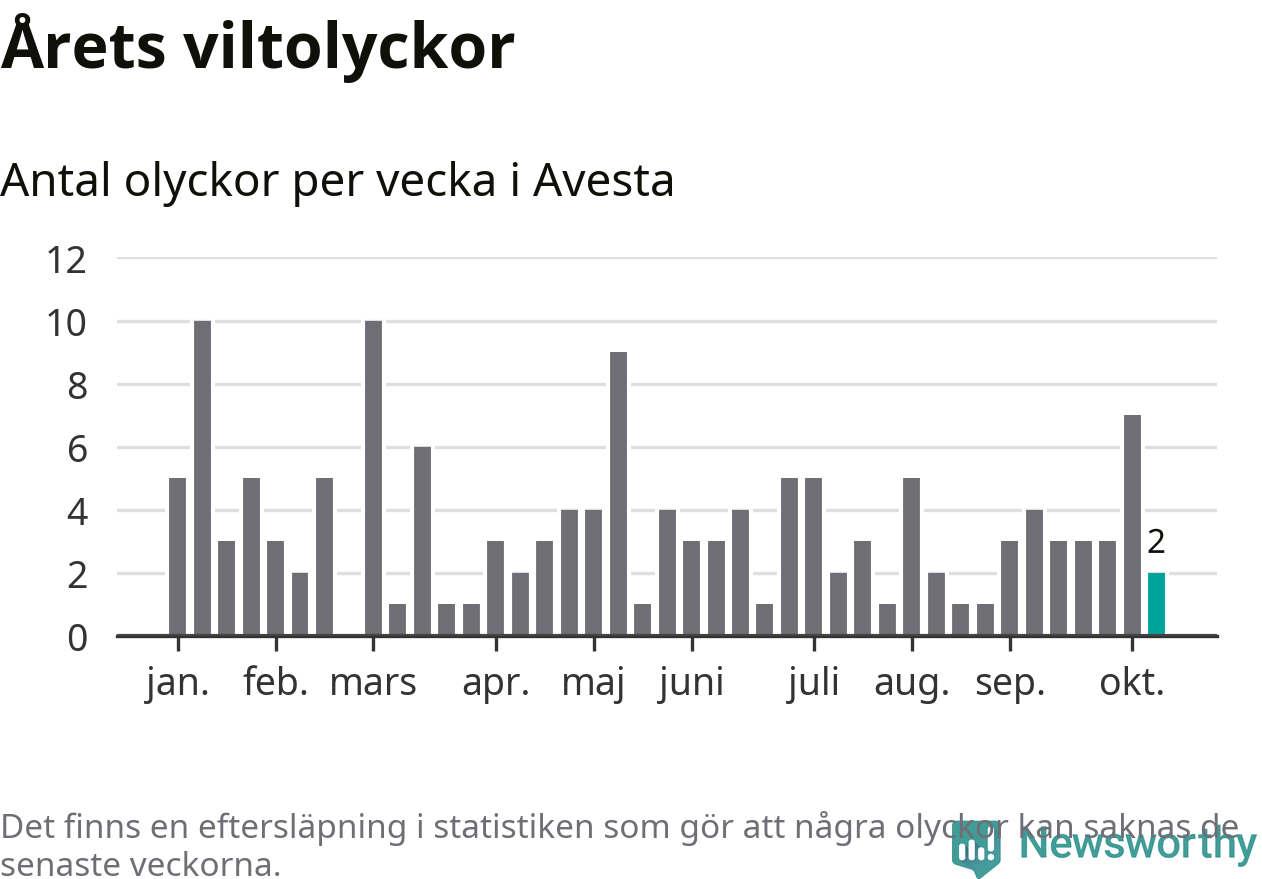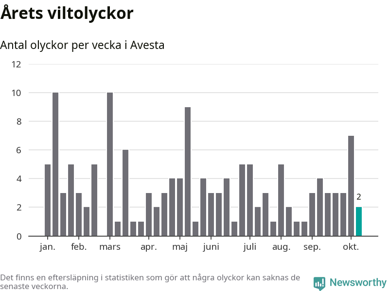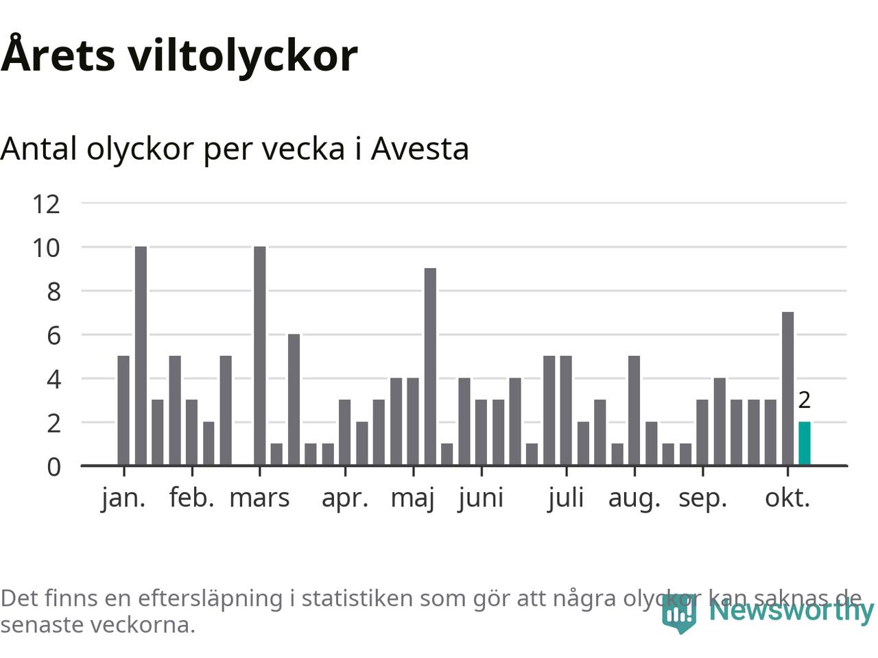 Hittills har två viltolyckor rapporterats in i Avesta kommun från vecka 42. Se listan här.