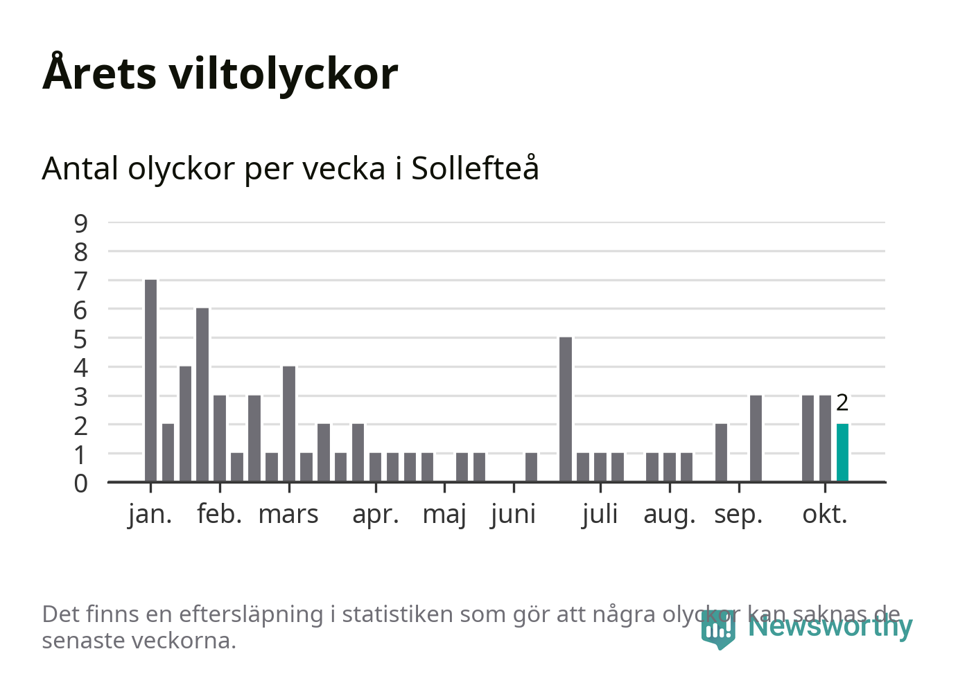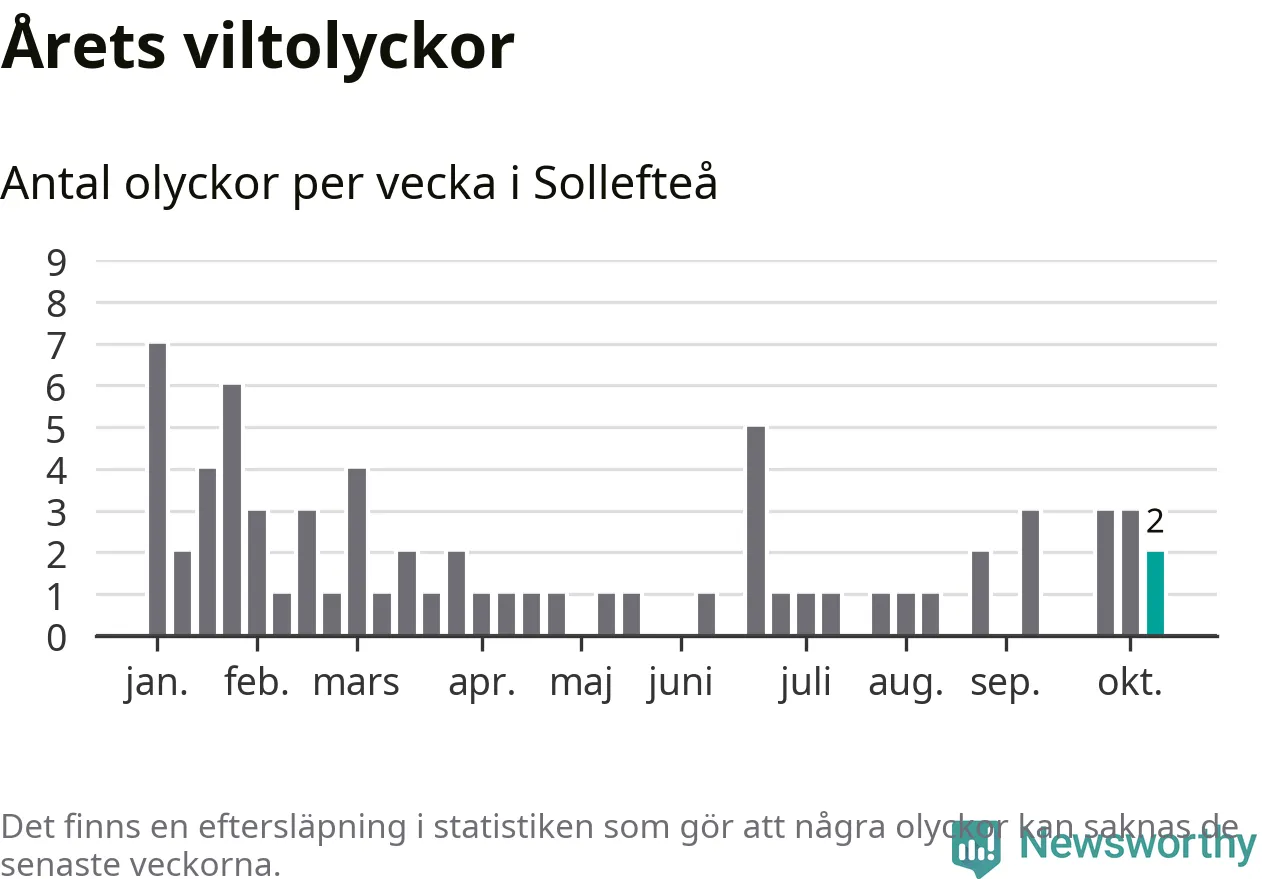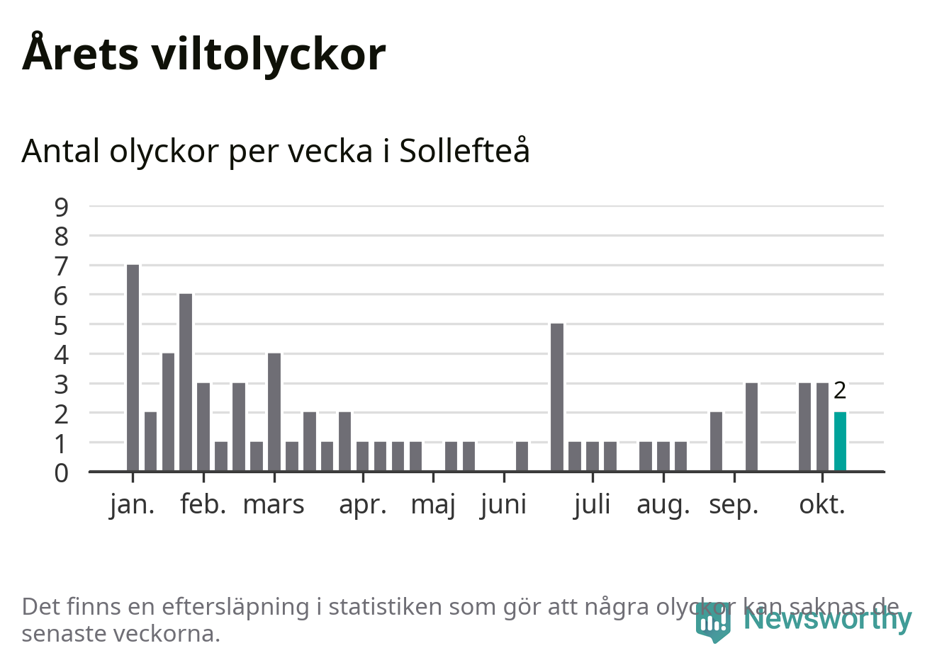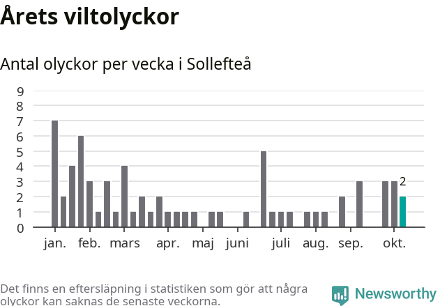 Hittills har två viltolyckor rapporterats in i Sollefteå kommun från vecka 42. Se listan här.