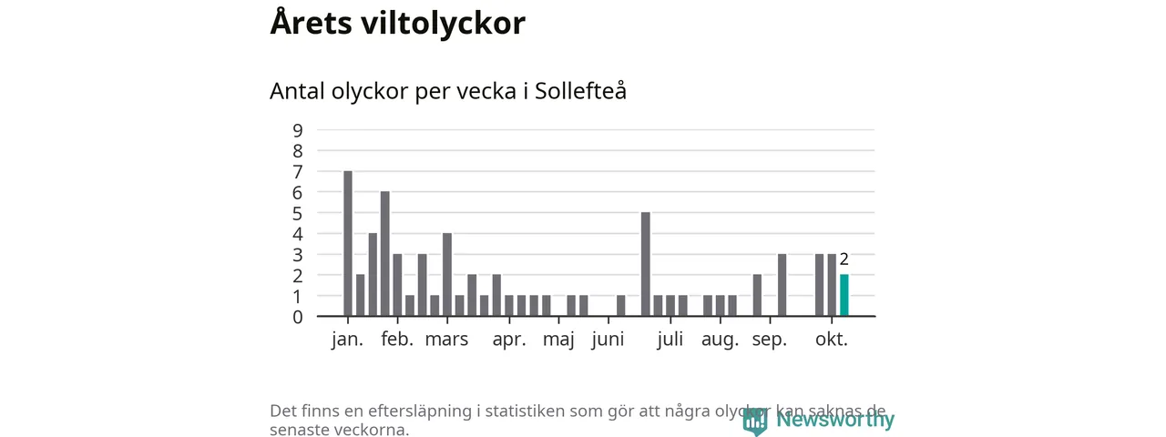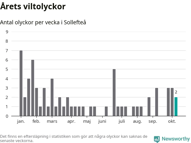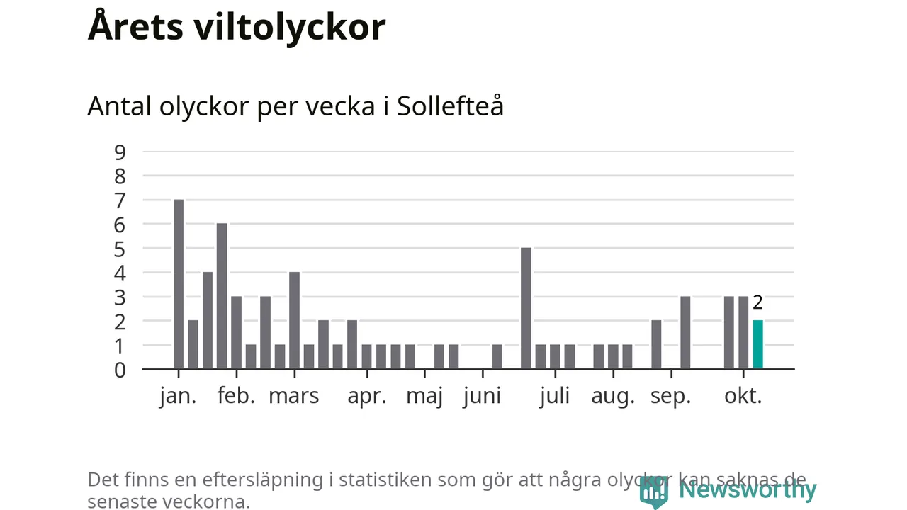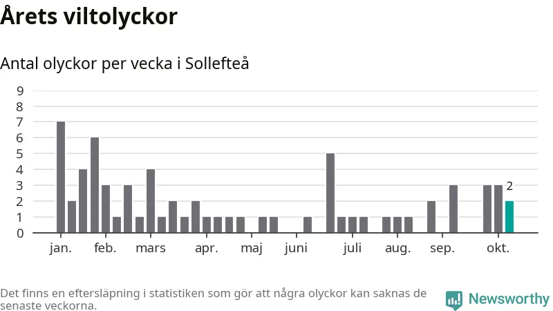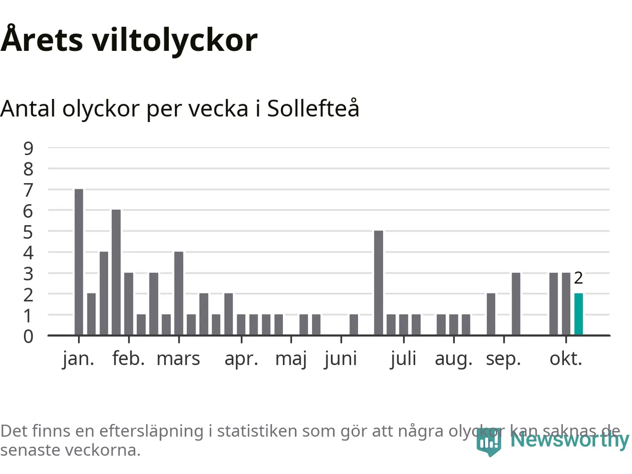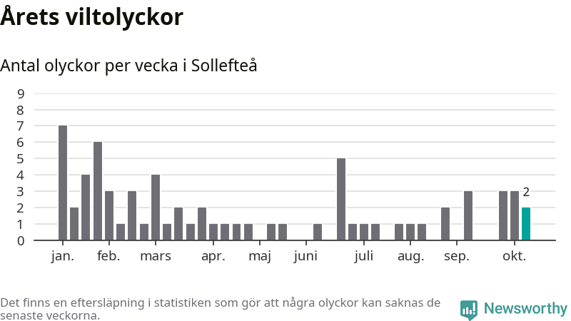 Hittills har två viltolyckor rapporterats in i Sollefteå kommun från vecka 42. Se listan här.