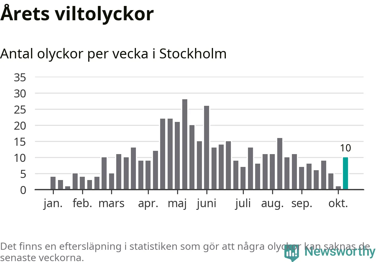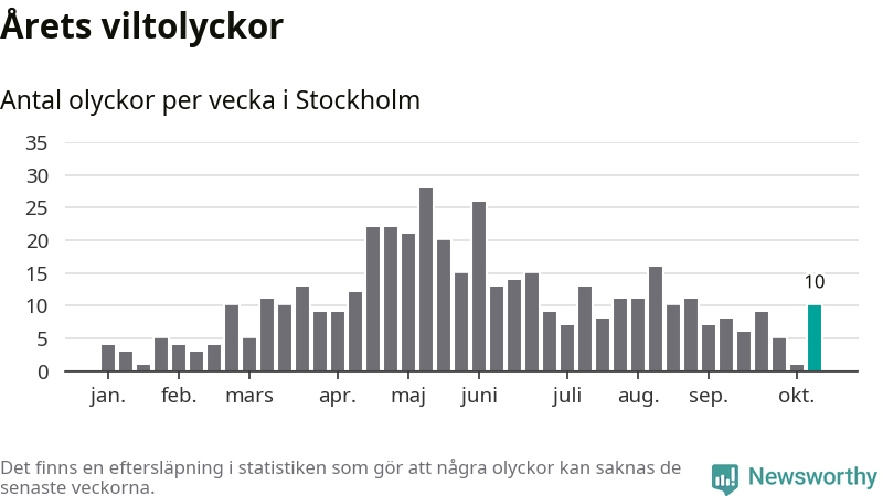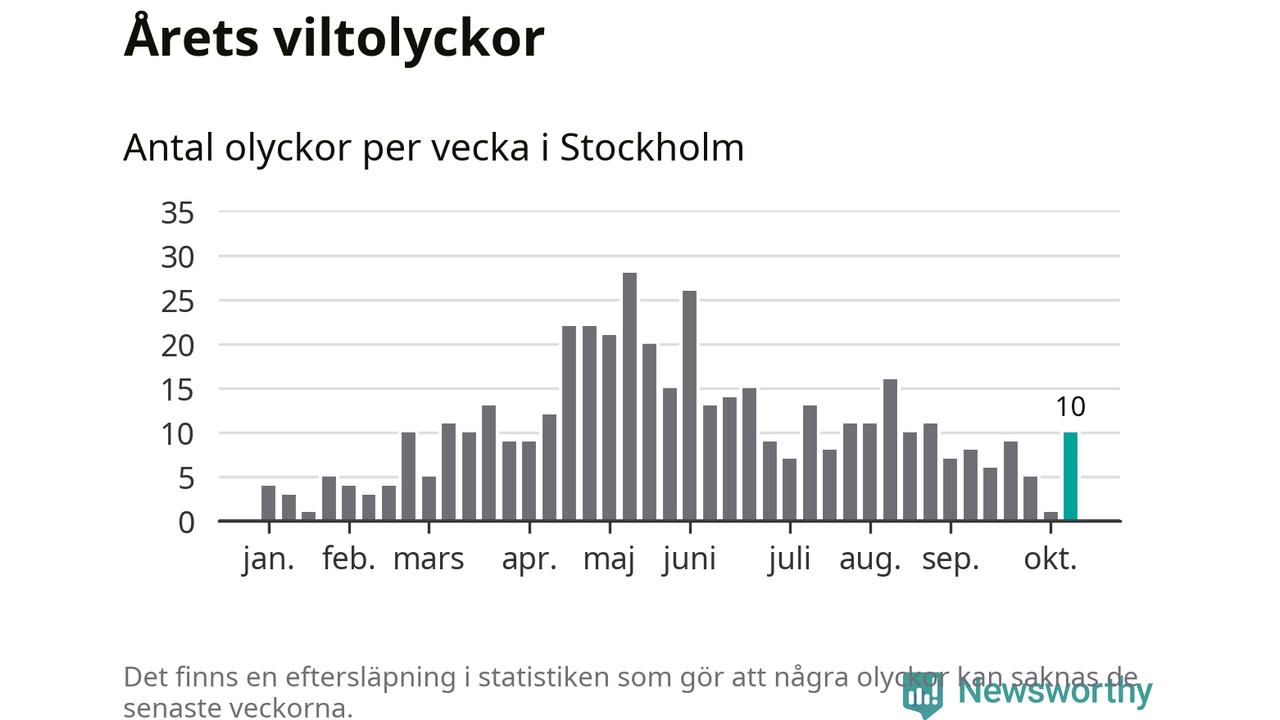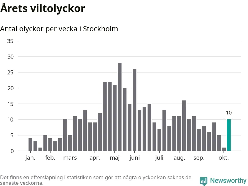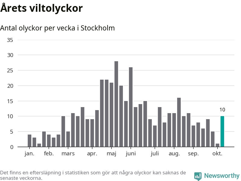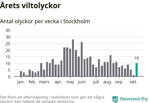 Tio olyckor är ovanligt många för en höstvecka. Bara fem gånger tidigare sedan 2015 har det skett så många viltolyckor på en höstvecka i Stockholms kommun.