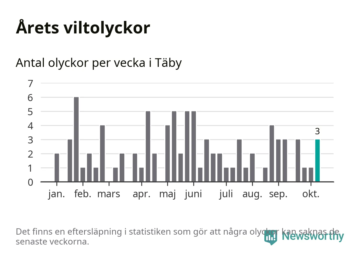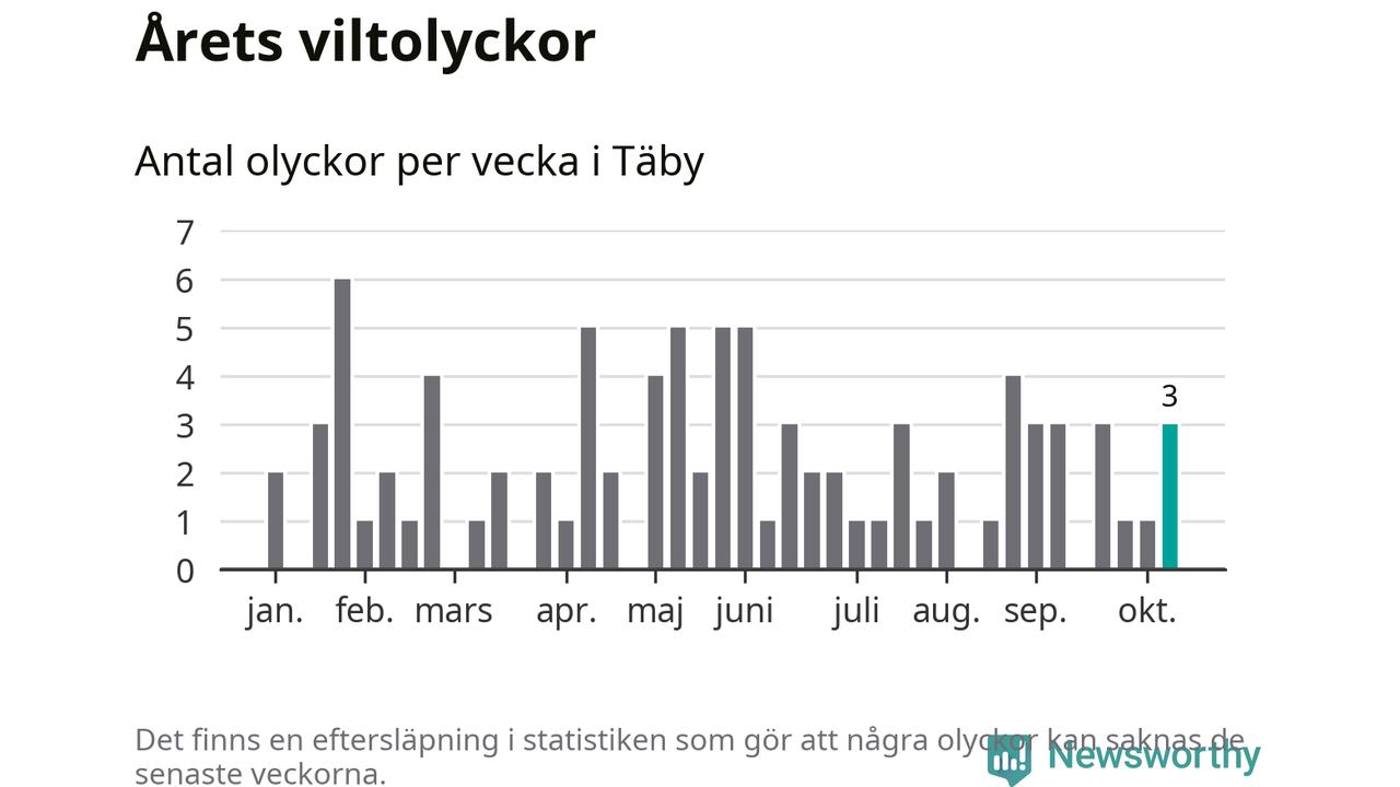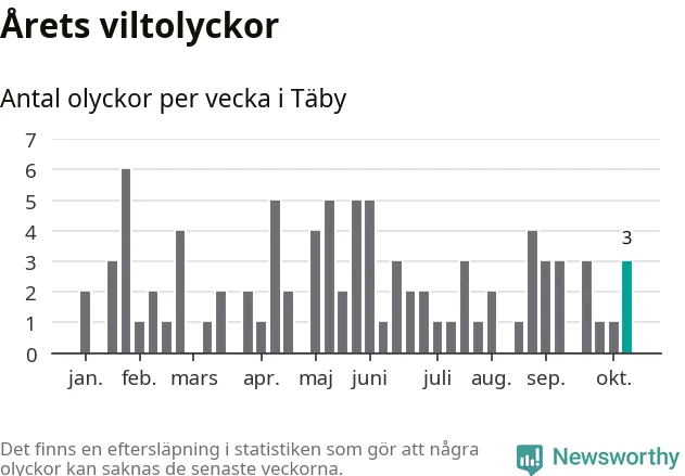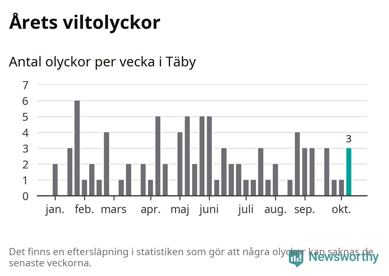 Hittills har tre viltolyckor rapporterats in i Täby kommun från vecka 42. Se listan här.