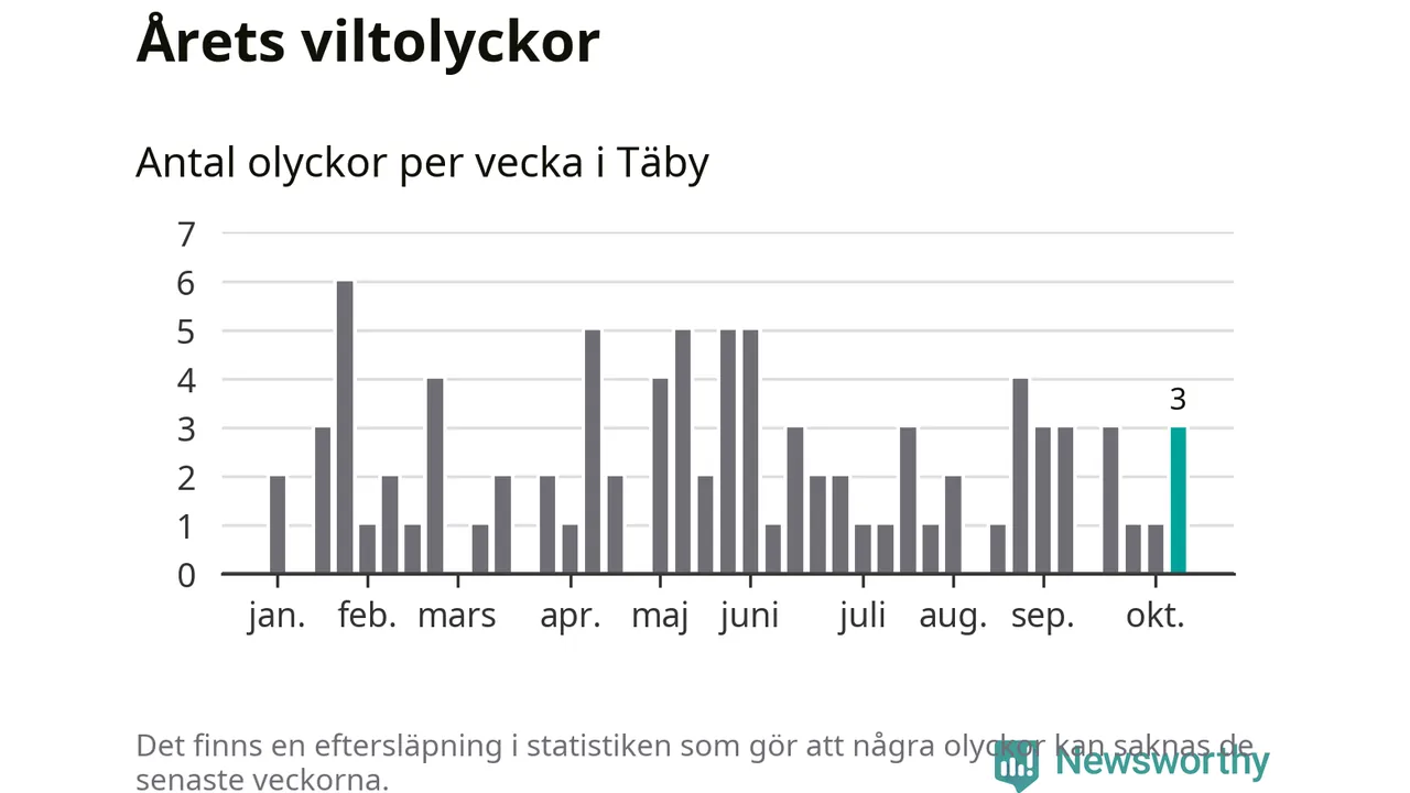 Totalt det här året har det inträffat 89 viltolyckor i kommunen. Det är mer än genomsnittet för motsvarande period (omkring 68) de senaste tio åren.