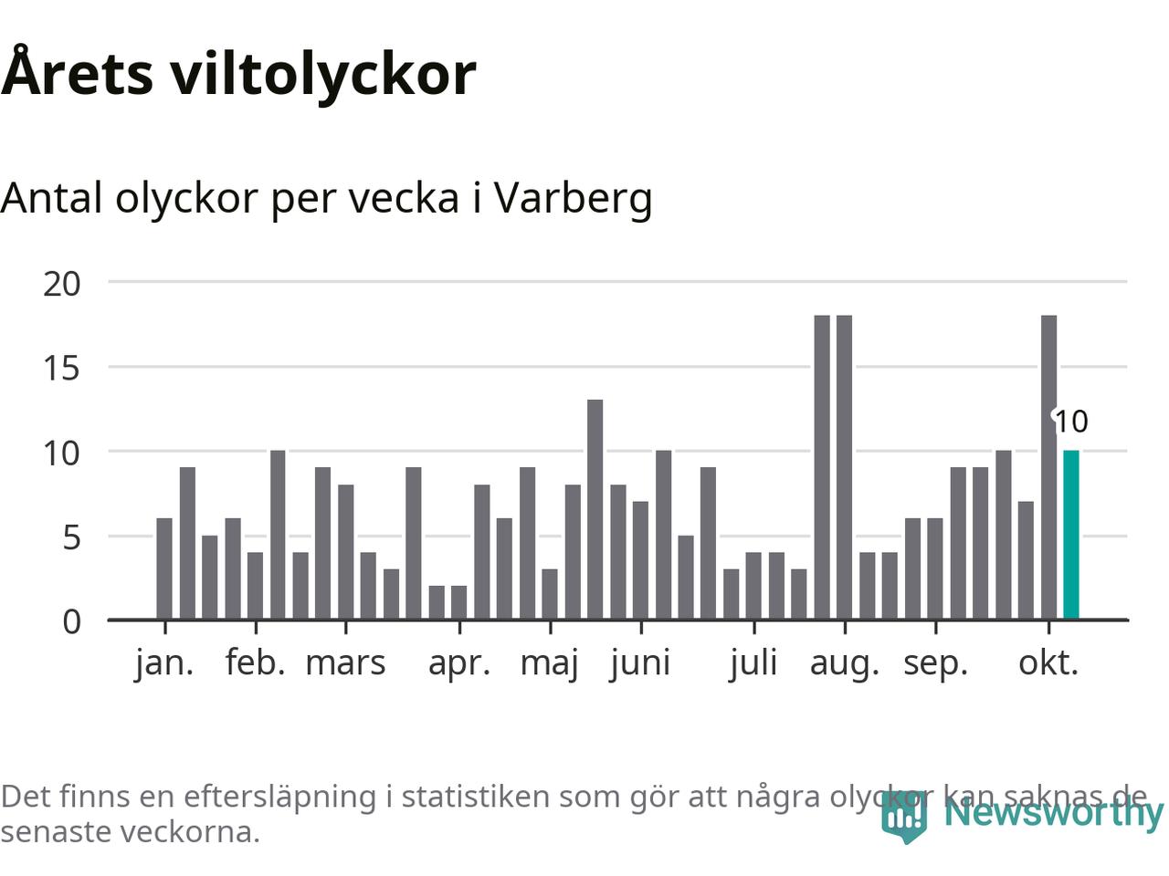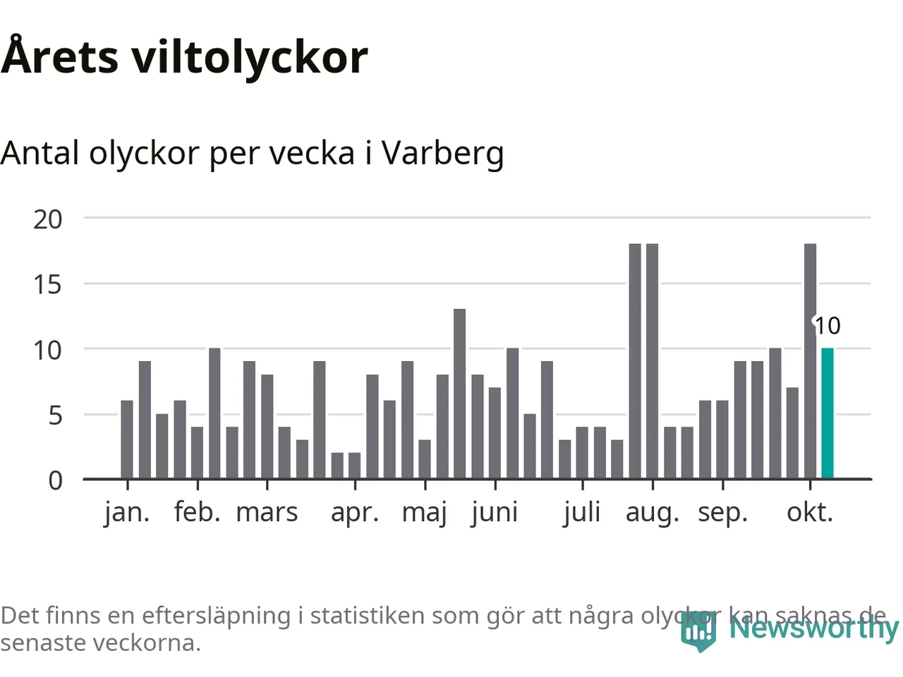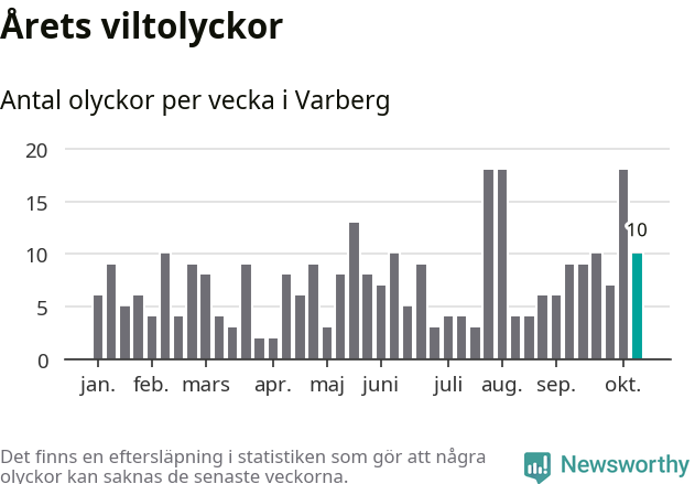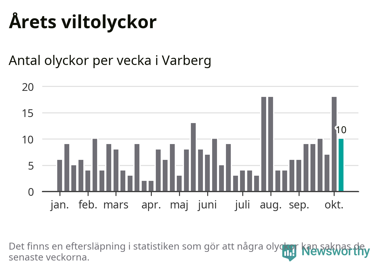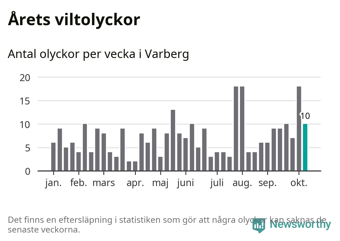 Hittills har tio viltolyckor rapporterats in i Varbergs kommun från vecka 42. Se listan här.