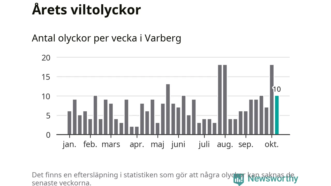 Totalt det här året har det inträffat 308 viltolyckor i kommunen. Det är mer än genomsnittet för motsvarande period (omkring 230) de senaste tio åren.