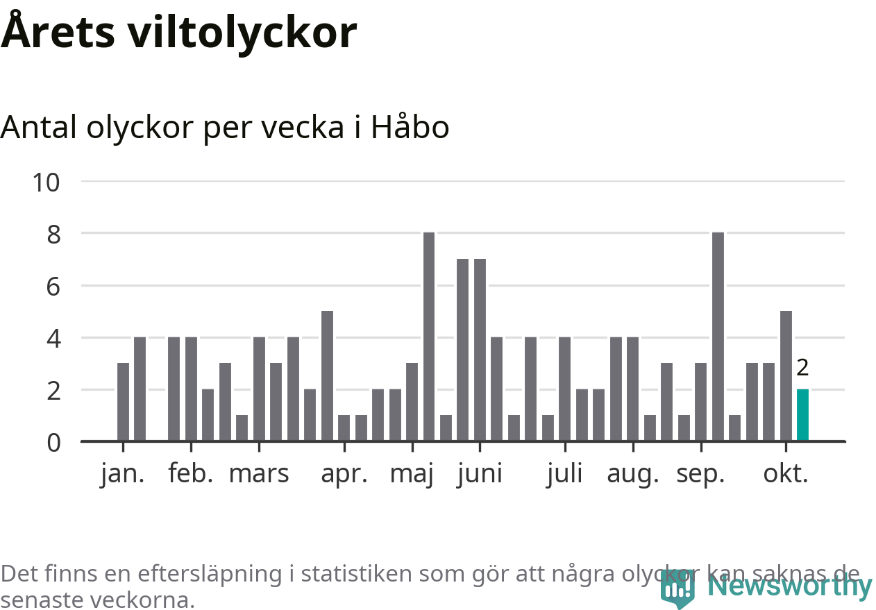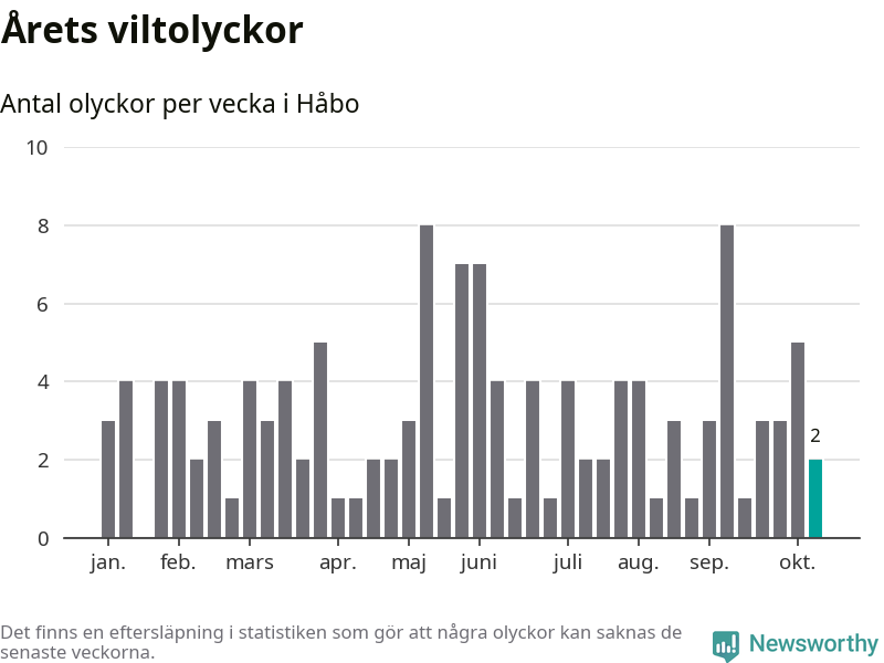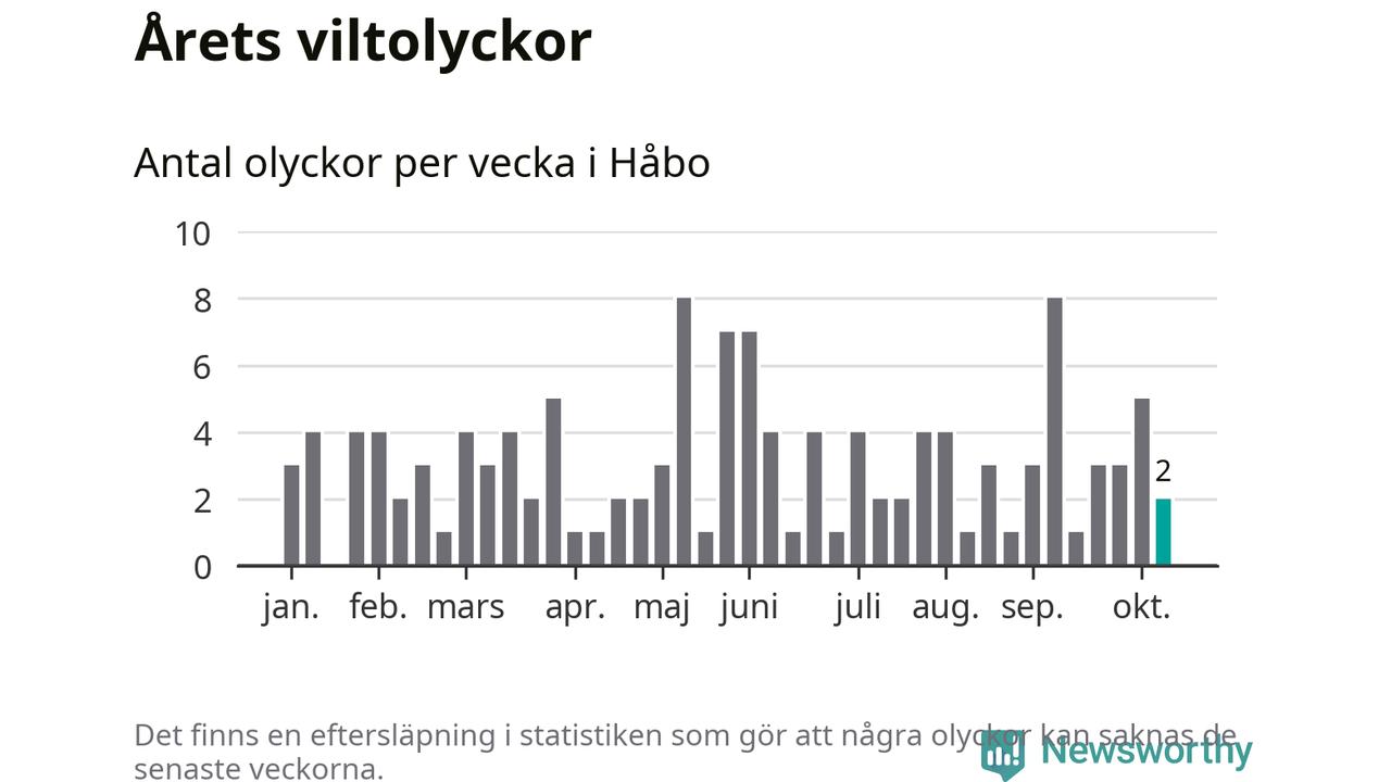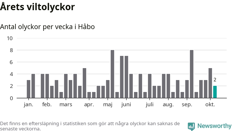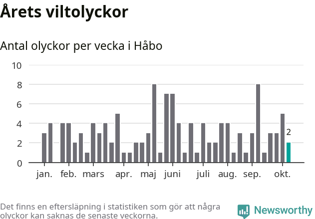 Hittills har två viltolyckor rapporterats in i Håbo kommun från vecka 42. Se listan här.