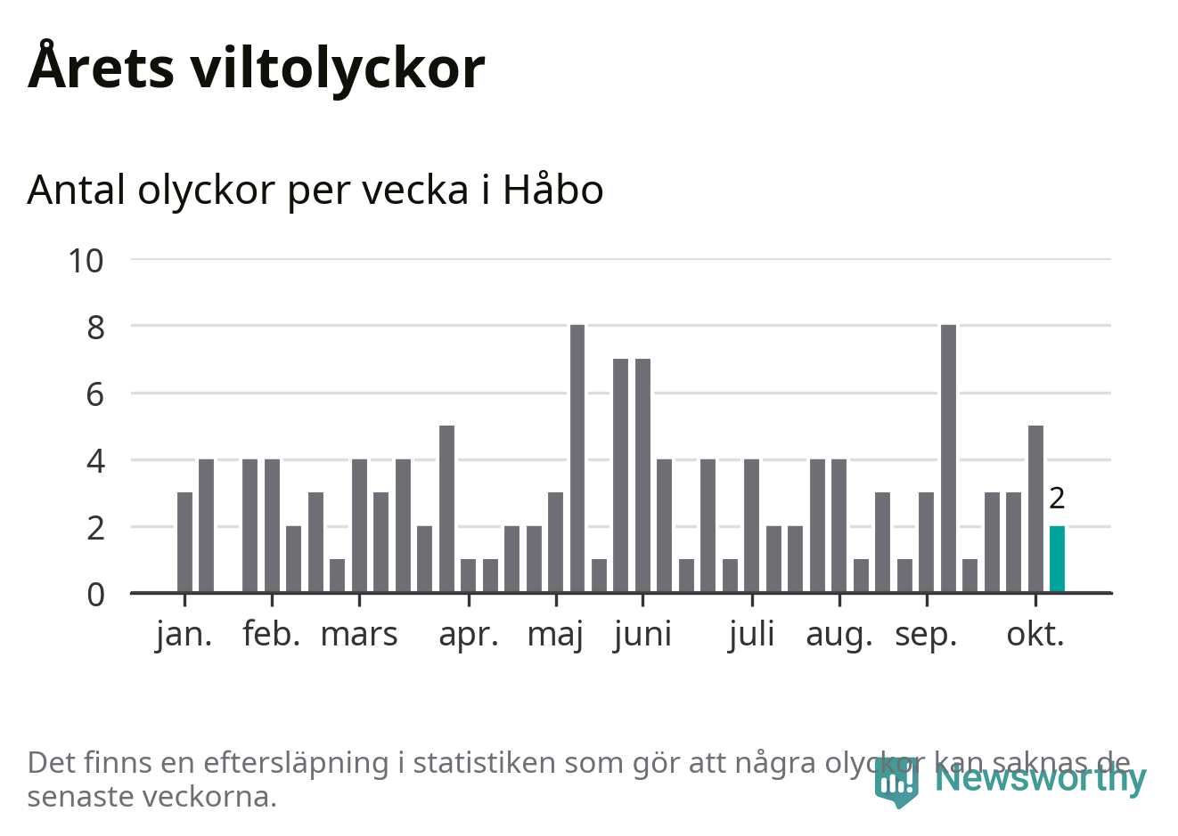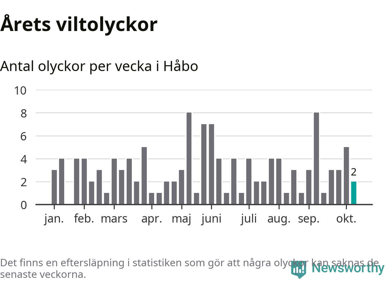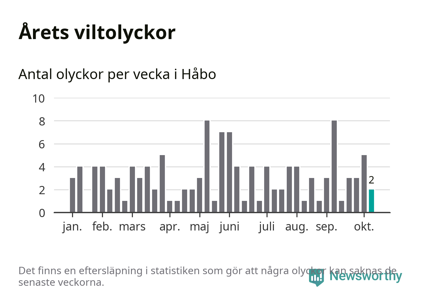 Hittills har två viltolyckor rapporterats in i Håbo kommun från vecka 42. Se listan här.