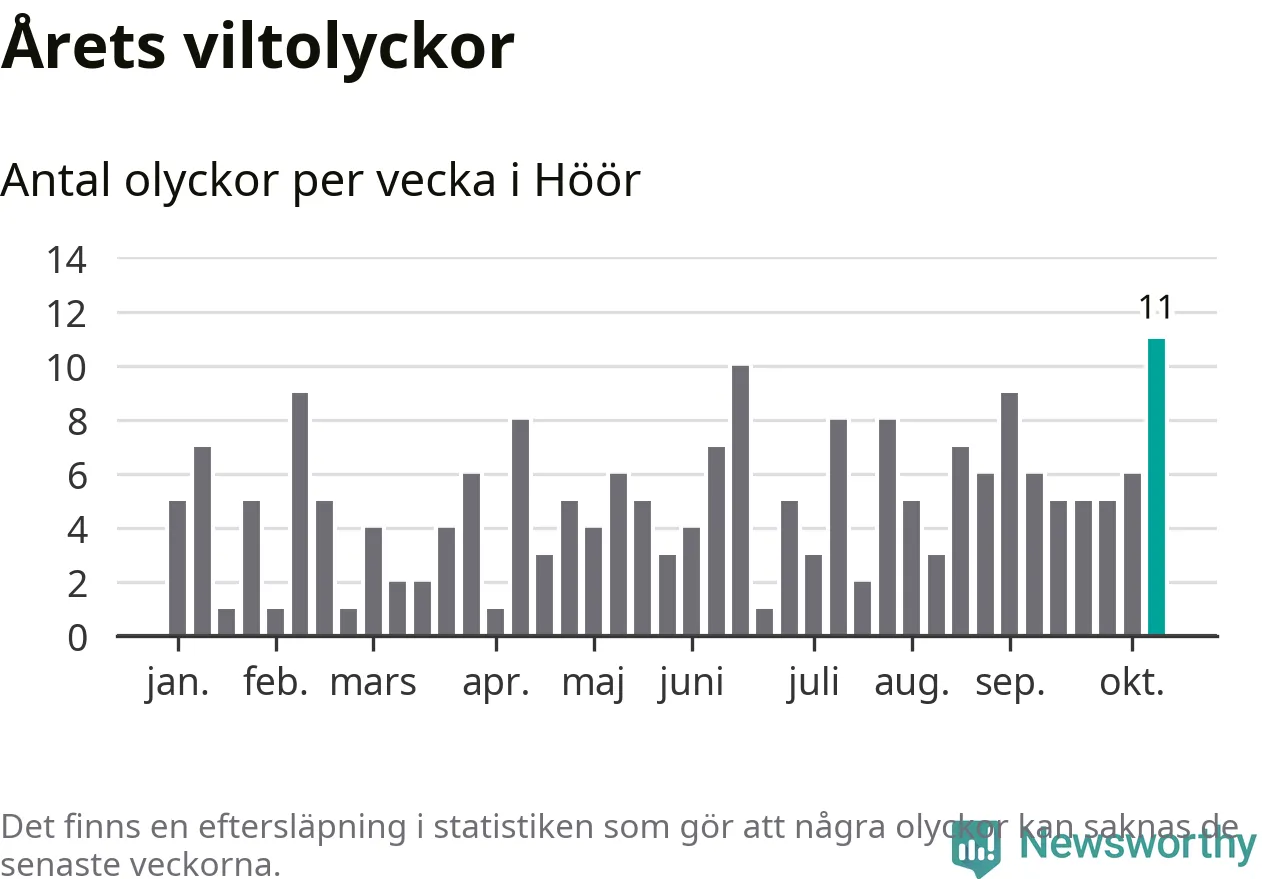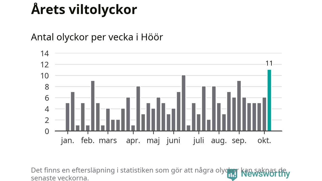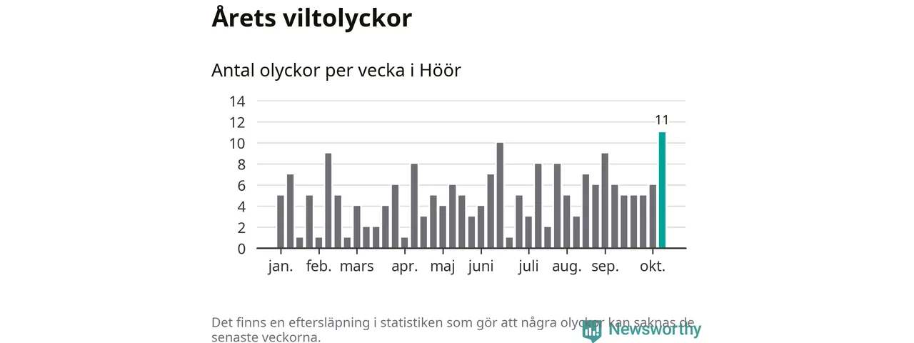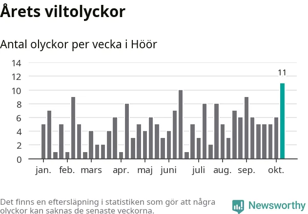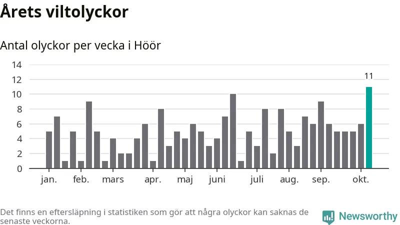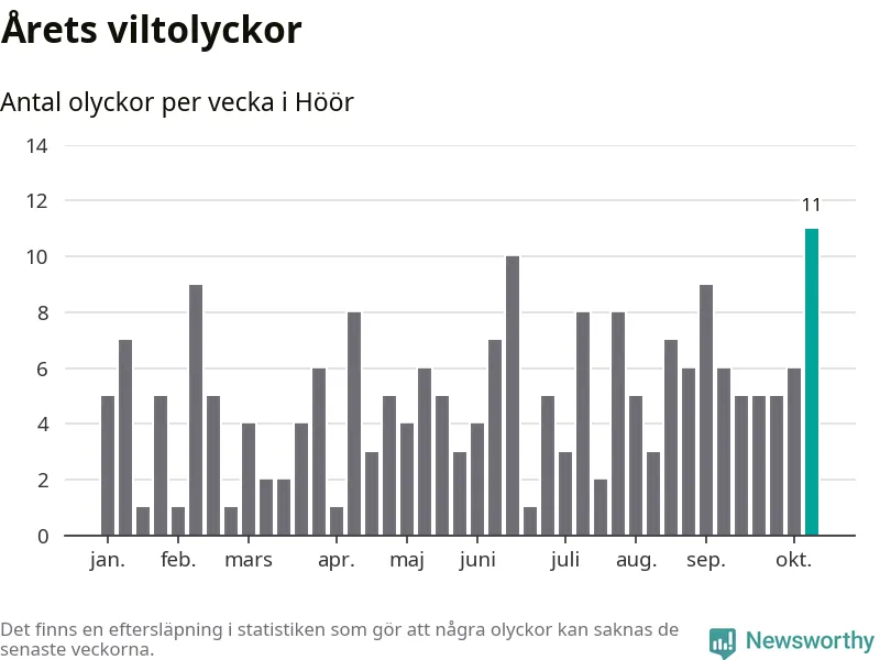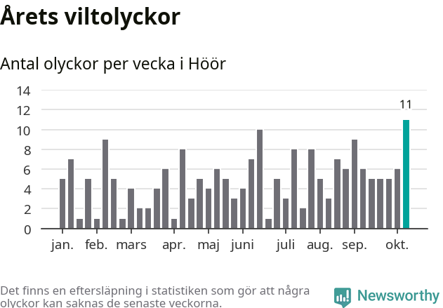 Hittills har elva viltolyckor rapporterats in i Höörs kommun från vecka 42. Det är en av de högsta höstsiffrorna för en enskild vecka på över tio år.