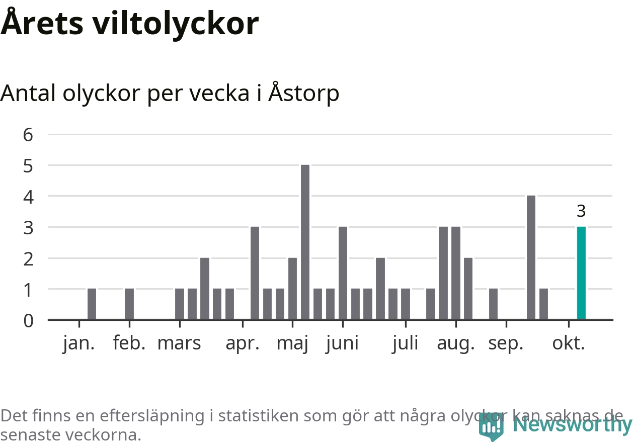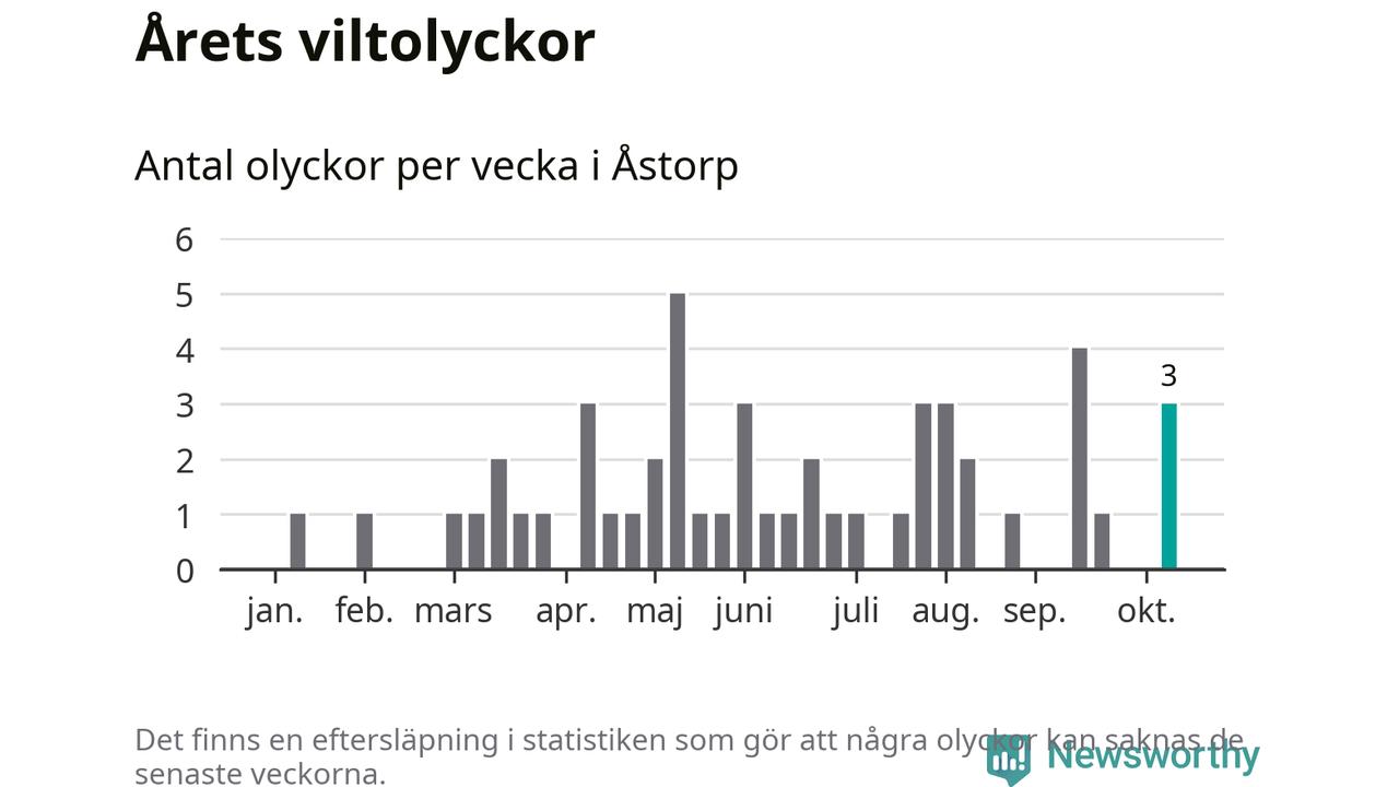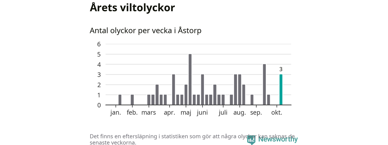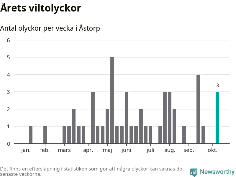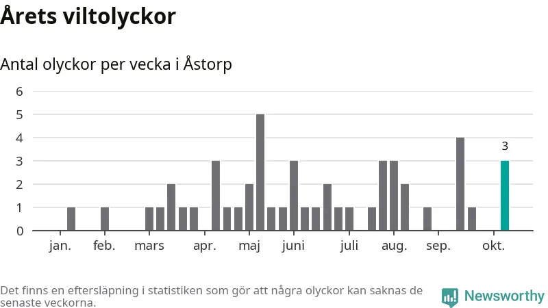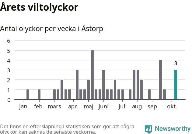 Hittills har tre viltolyckor rapporterats in i Åstorps kommun från vecka 42. Se listan här.