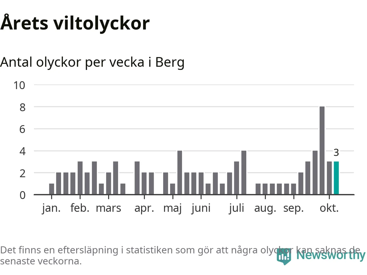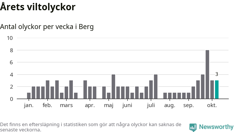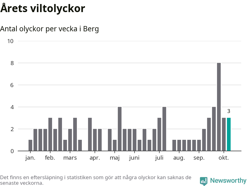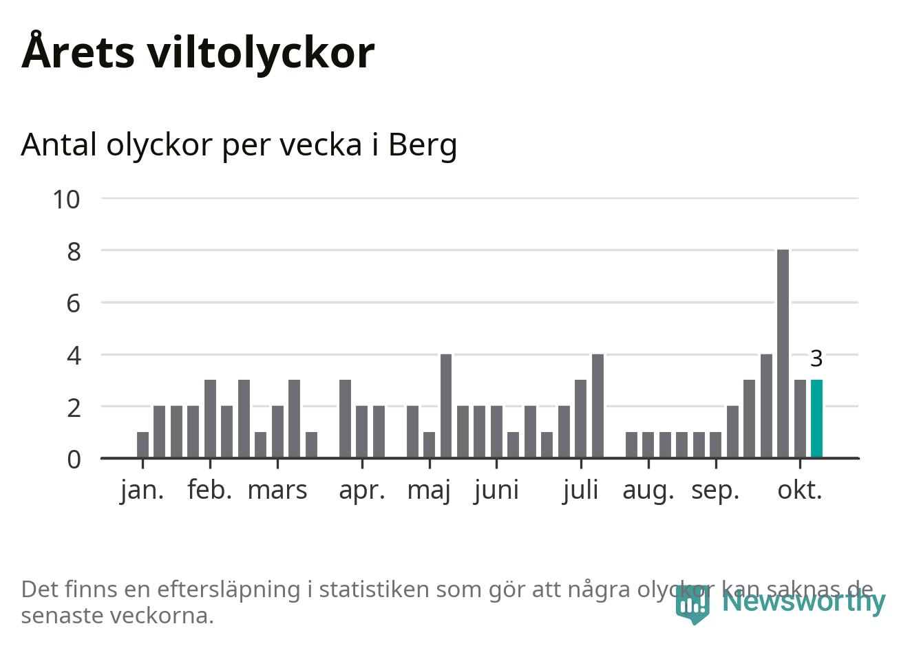 Hittills har tre viltolyckor rapporterats in i Bergs kommun från vecka 42. Se listan här.