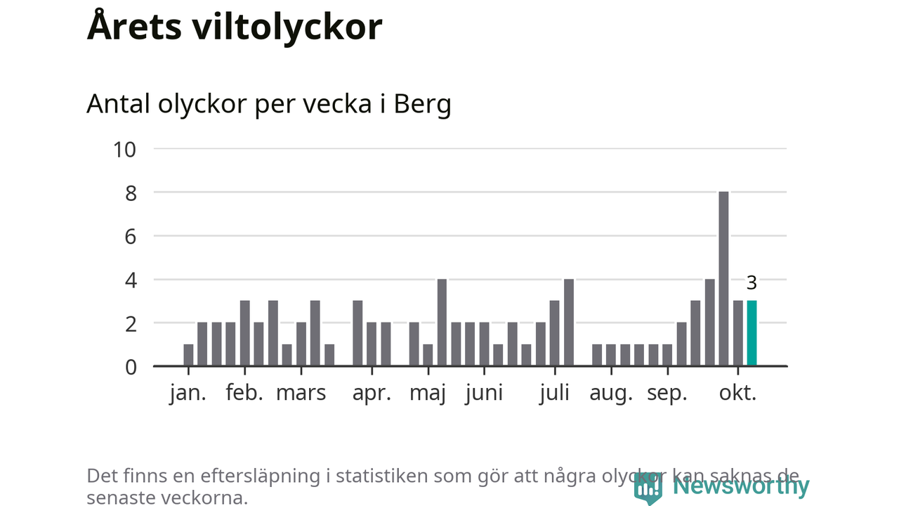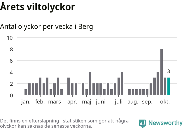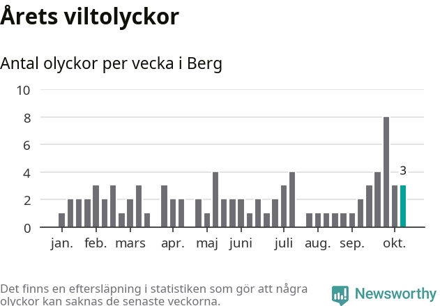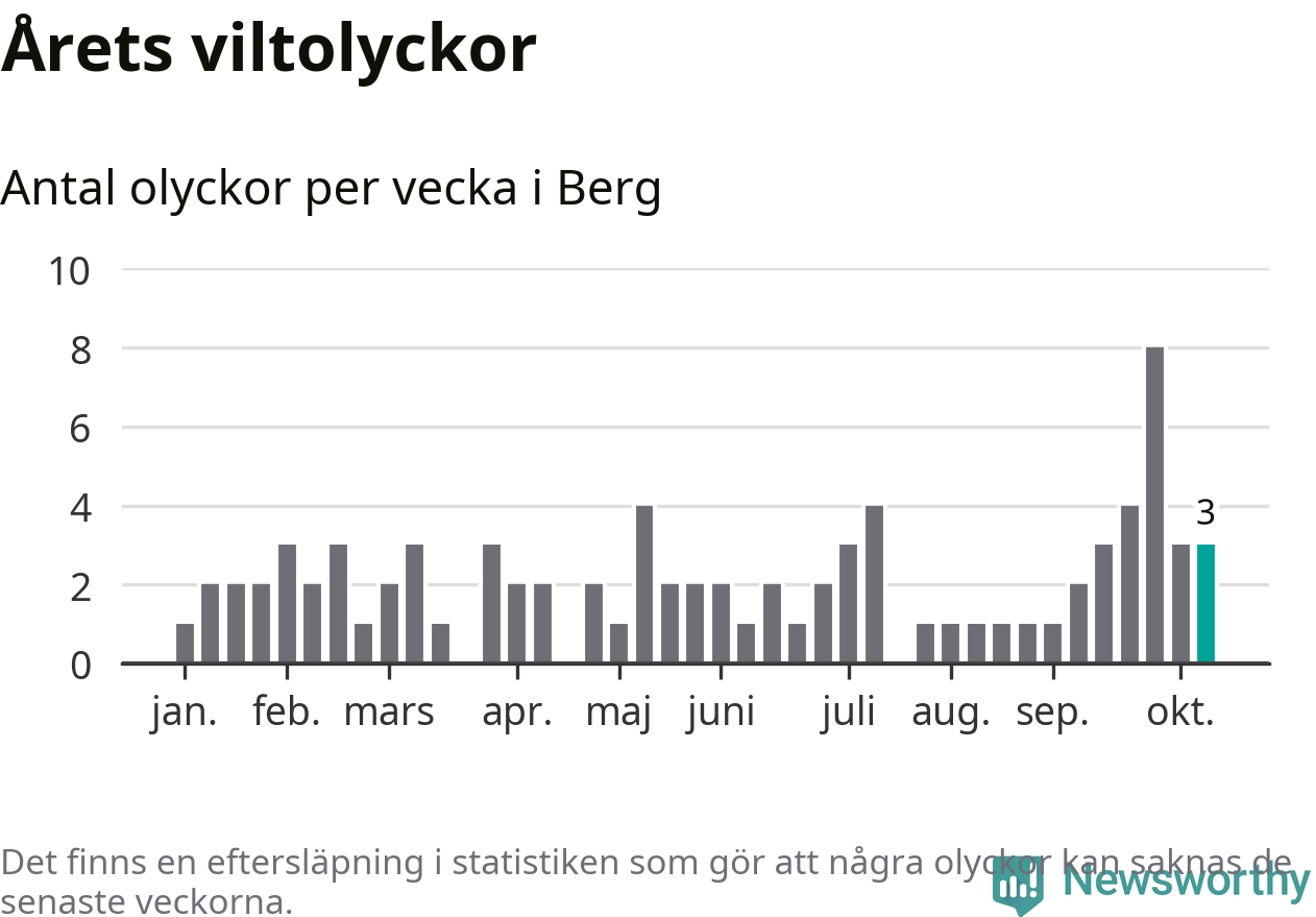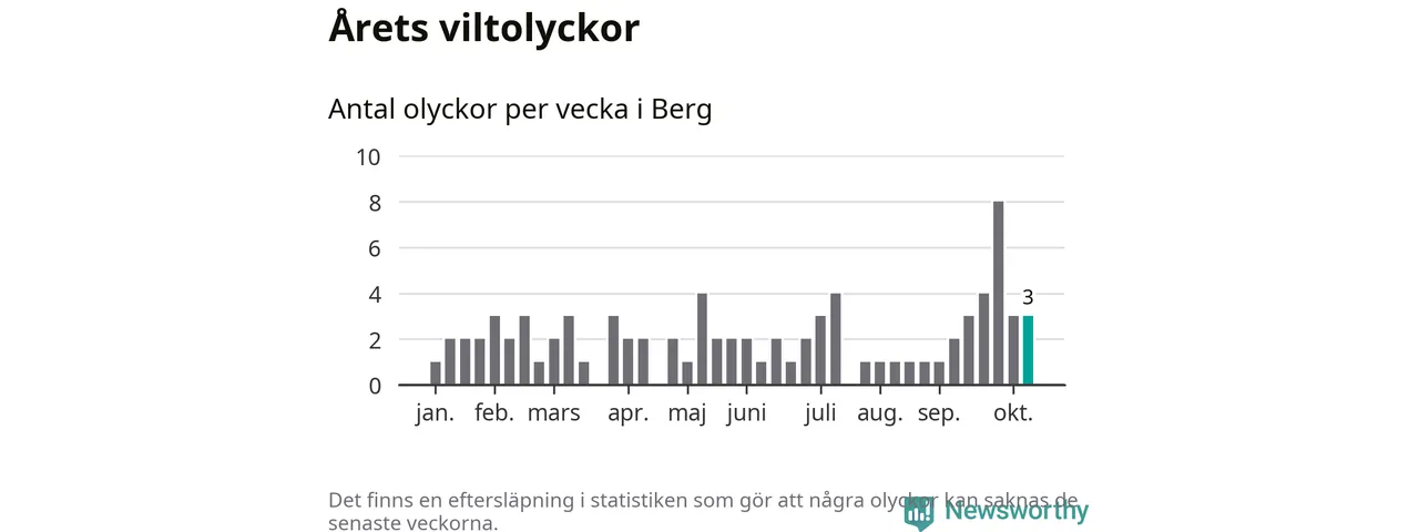 Hittills har tre viltolyckor rapporterats in i Bergs kommun från vecka 42. Se listan här.