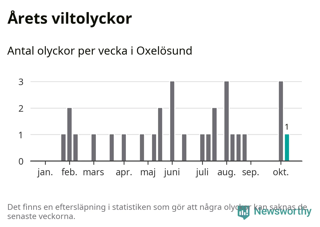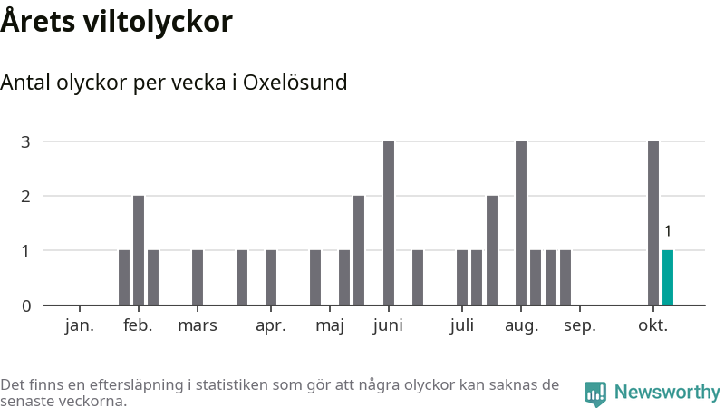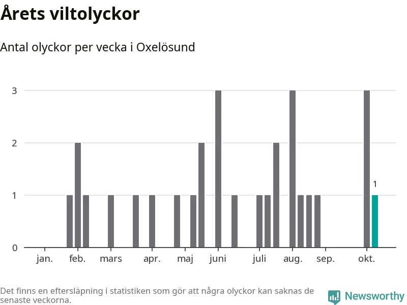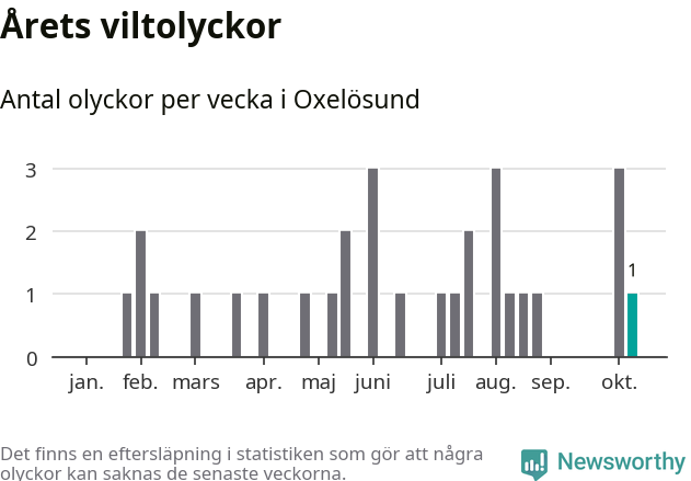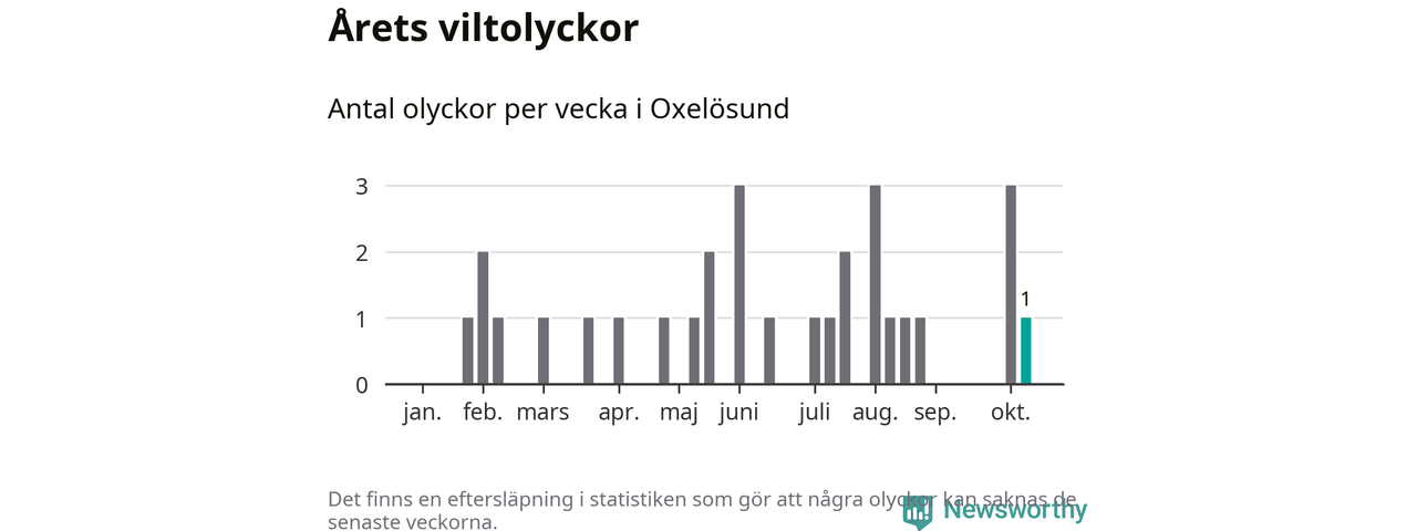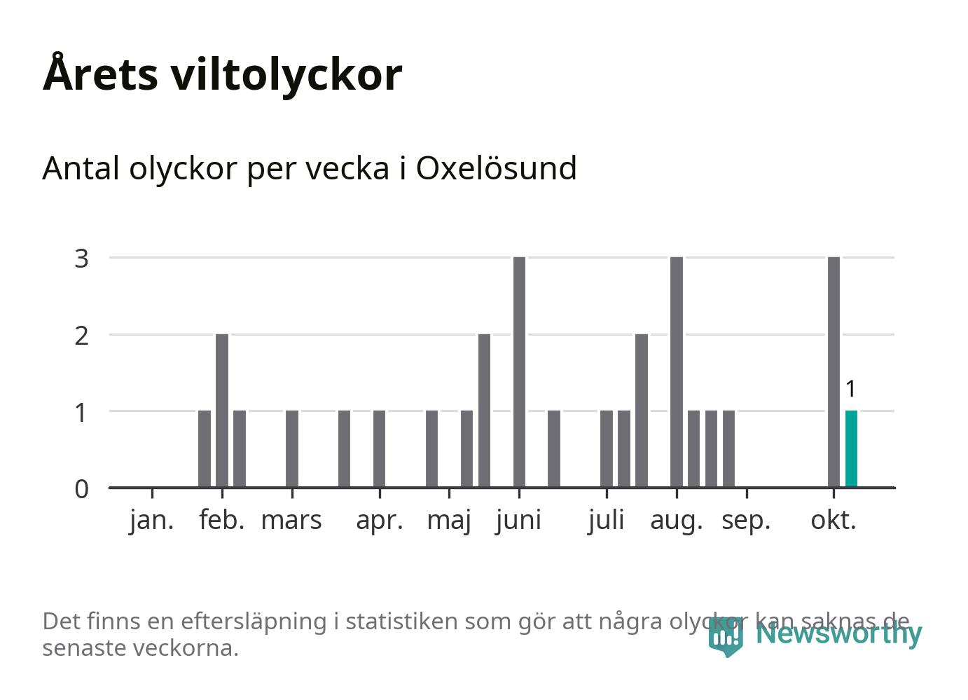 Från förra veckan (vecka 42) har hittills en viltolycka rapporterats in i Oxelösunds kommun.