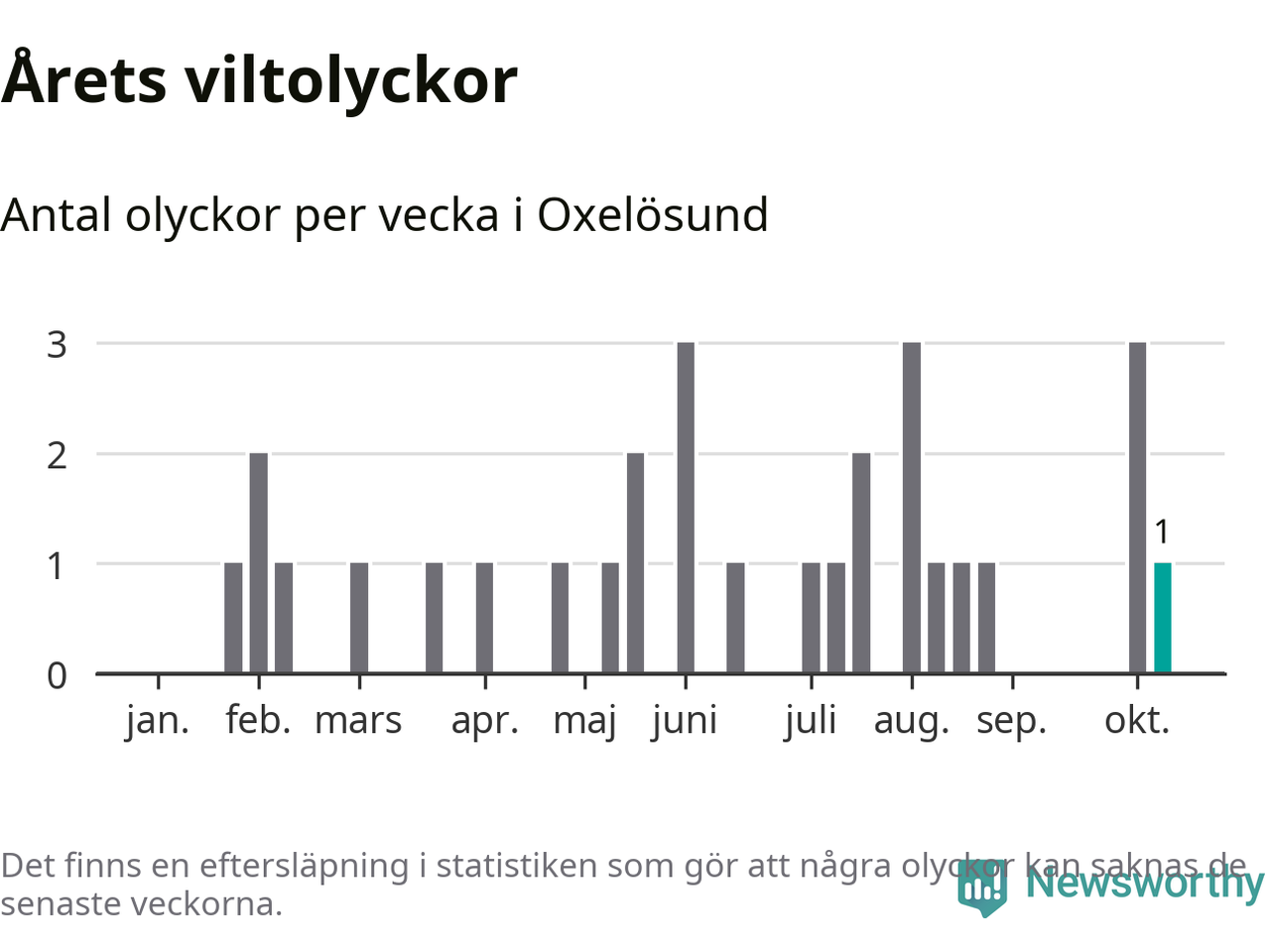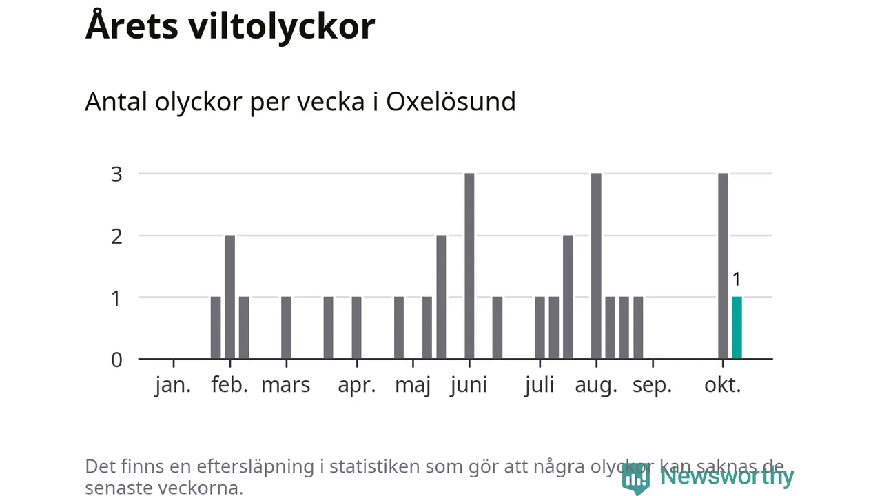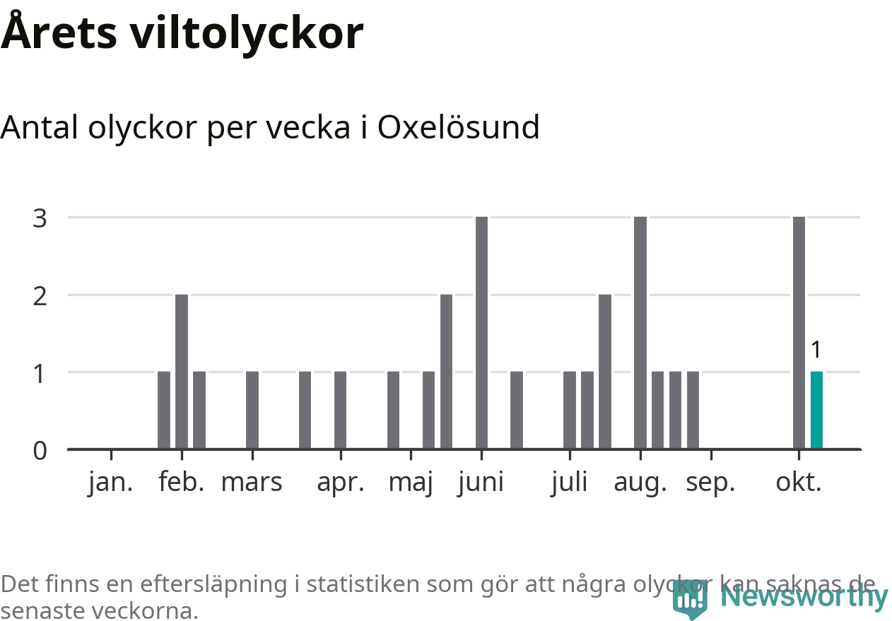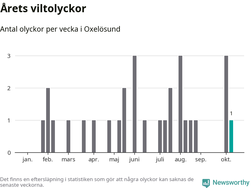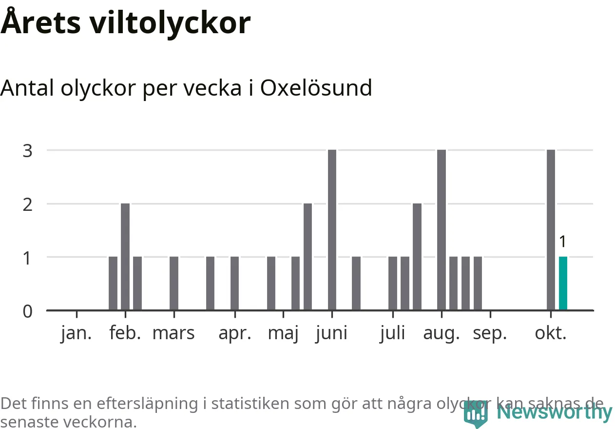 Från förra veckan (vecka 42) har hittills en viltolycka rapporterats in i Oxelösunds kommun.