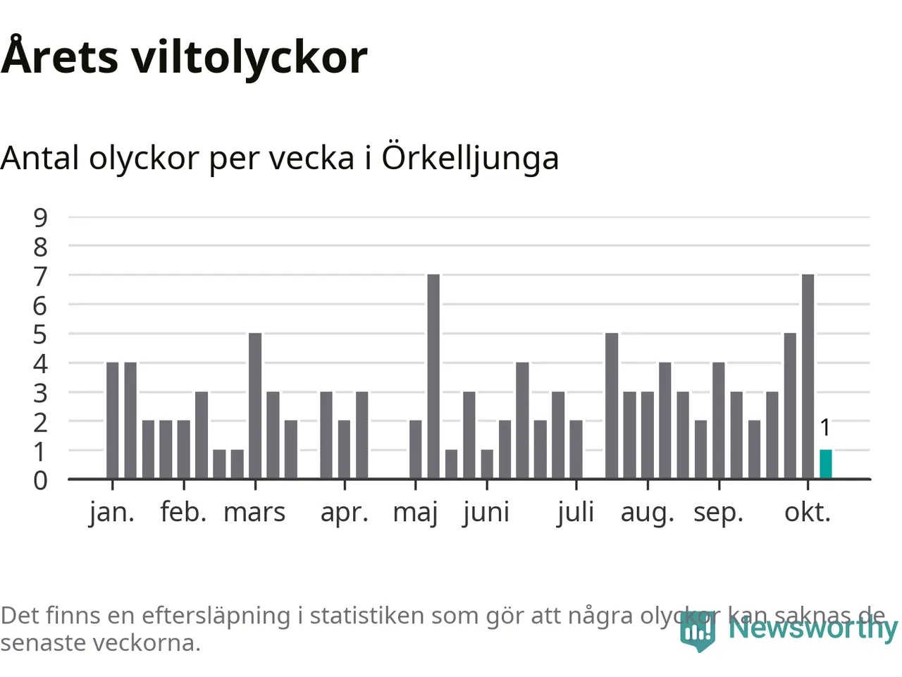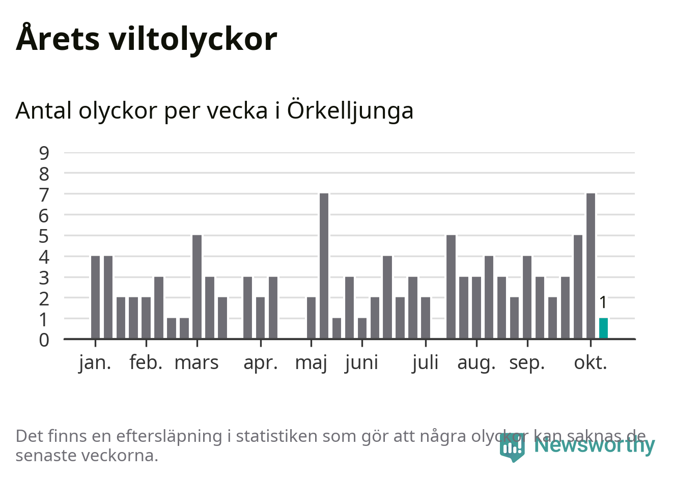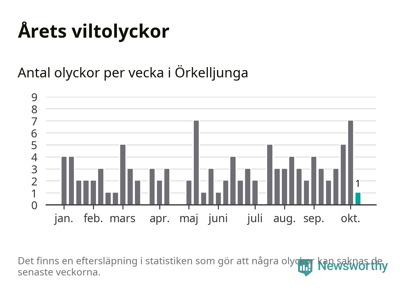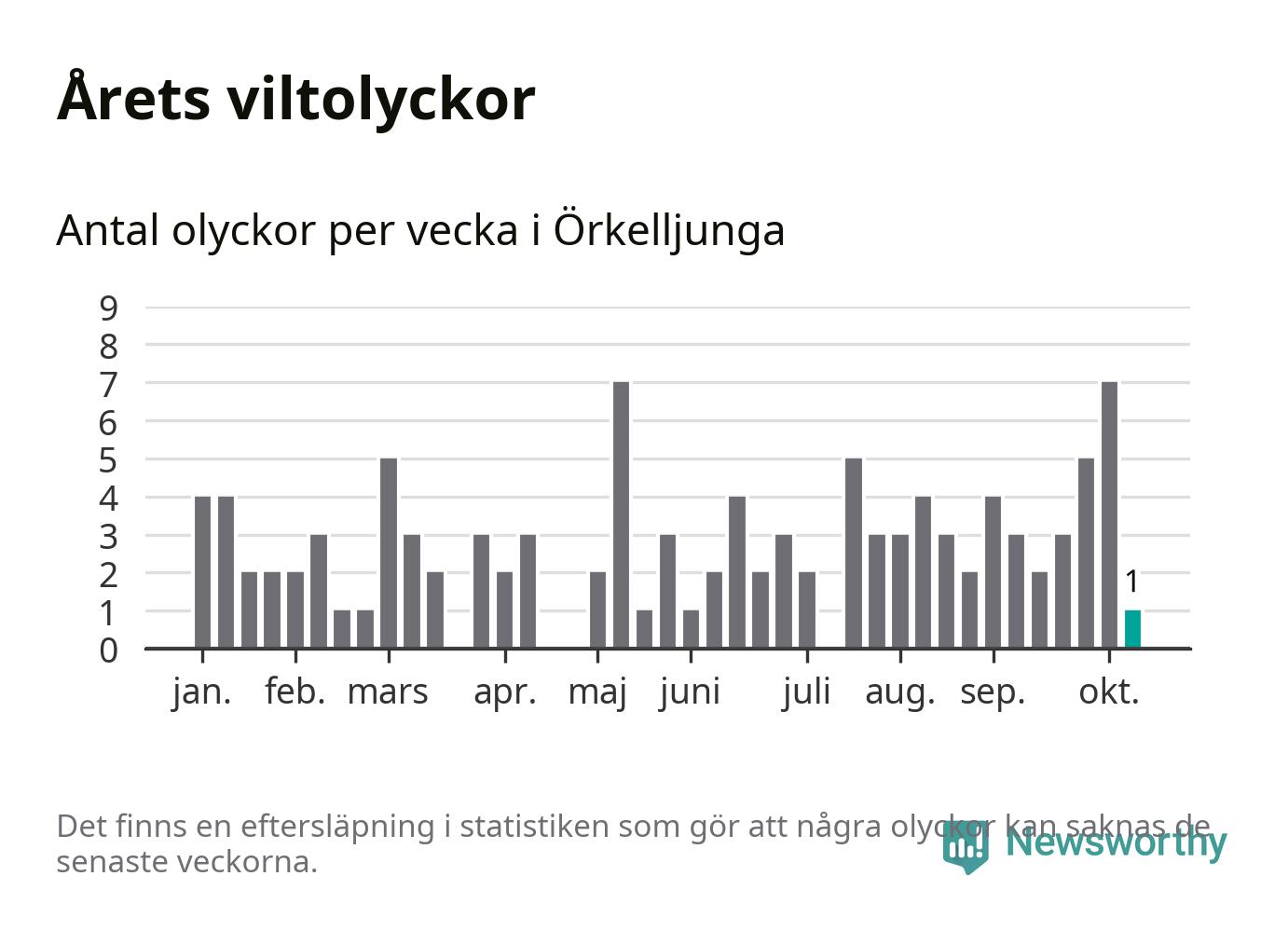 Från förra veckan (vecka 42) har hittills en viltolycka rapporterats in i Örkelljunga kommun.
