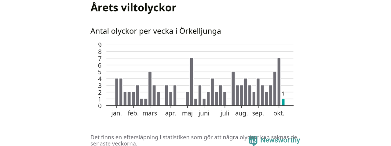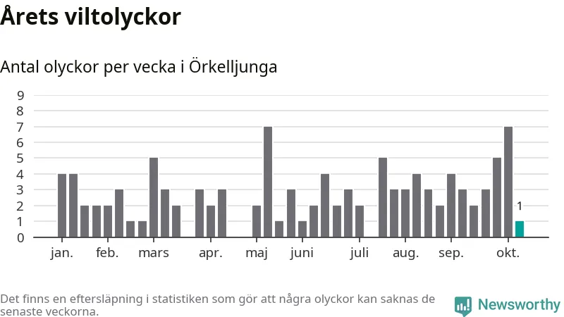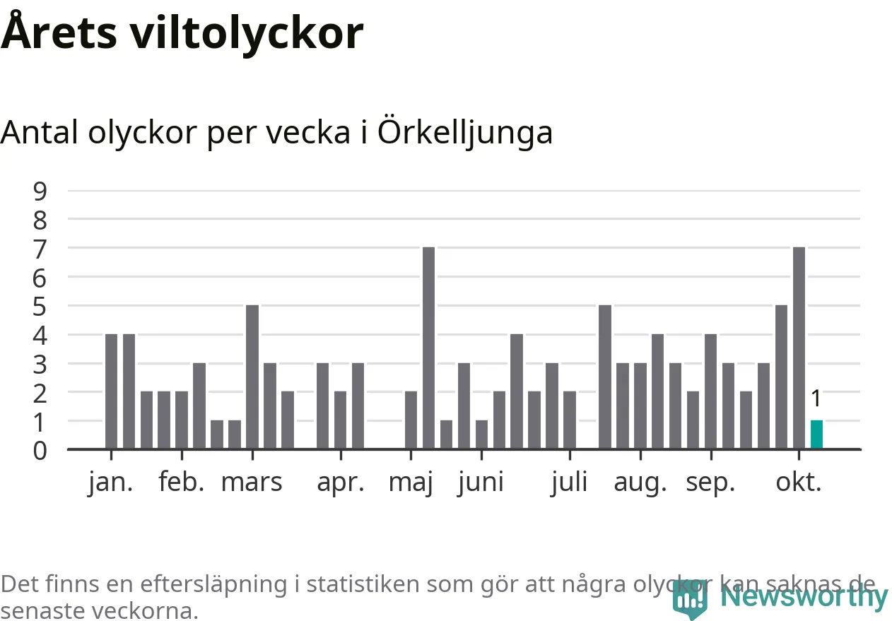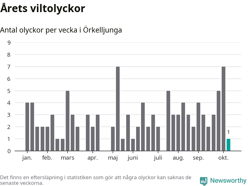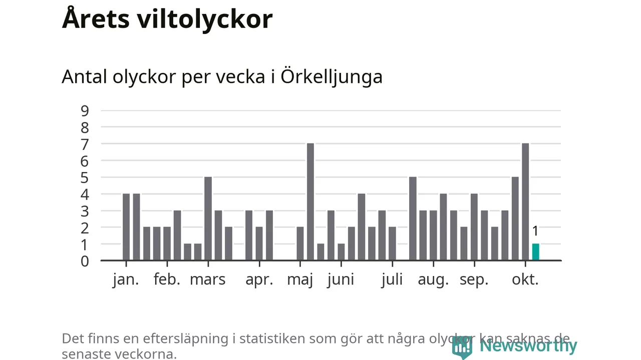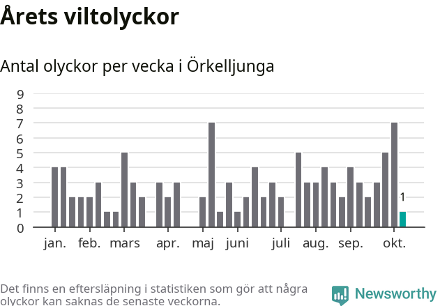 Från förra veckan (vecka 42) har hittills en viltolycka rapporterats in i Örkelljunga kommun.